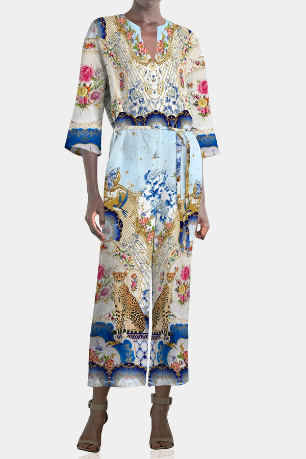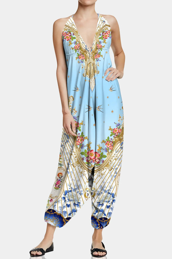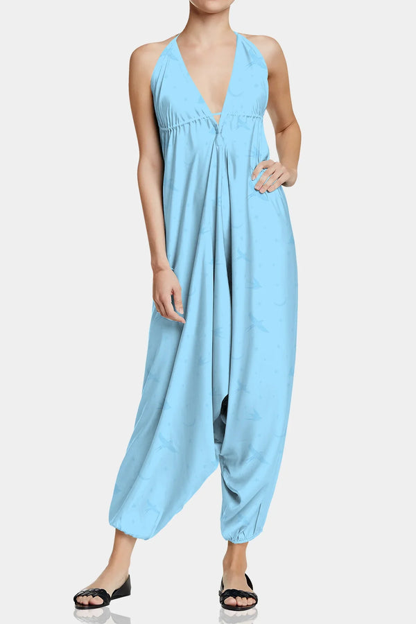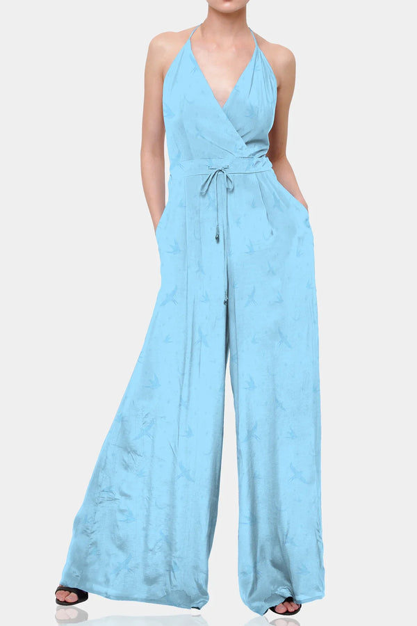 احصلي على إطلالة أنيقة ومريحة مع هذه الجمبسوت الزرقاء، التي تتميز بفتحة رقبة على شكل حرف V عميقة وأكمام قصيرة وساق واسعة مع جيوب، ويمكن تنسيقها مع أقراط مذهلة وكعب عالٍ، من تصميم شاهدة باريديس.