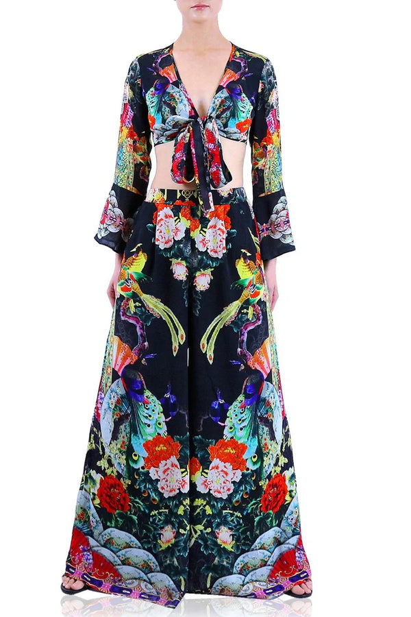 Bird Print Wide Leg Pants in Black