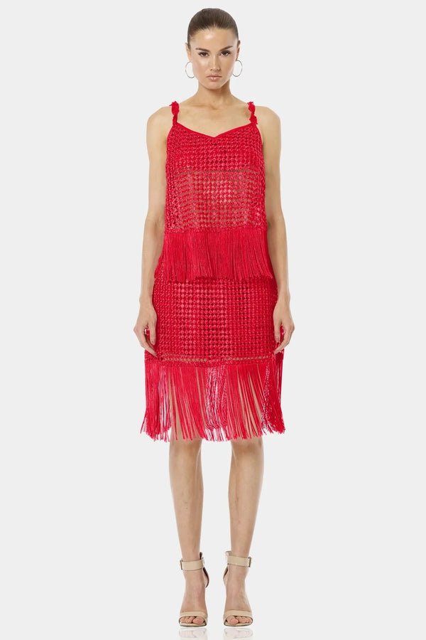 Detailed view of a red printed shirt dress from Shahida Parides with artistic patterns and lightweight sheer texture