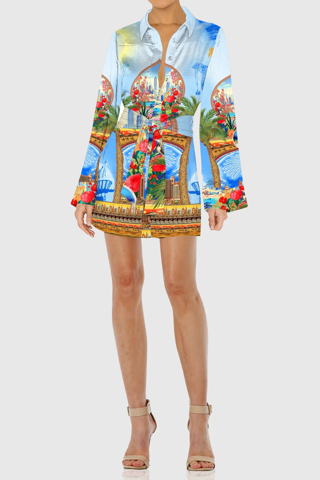 This trending shirt is perfect outfit for your designer wardrobe collection, which features collared neck, long sleeves, belted waistline, designed by Shahida Parides.