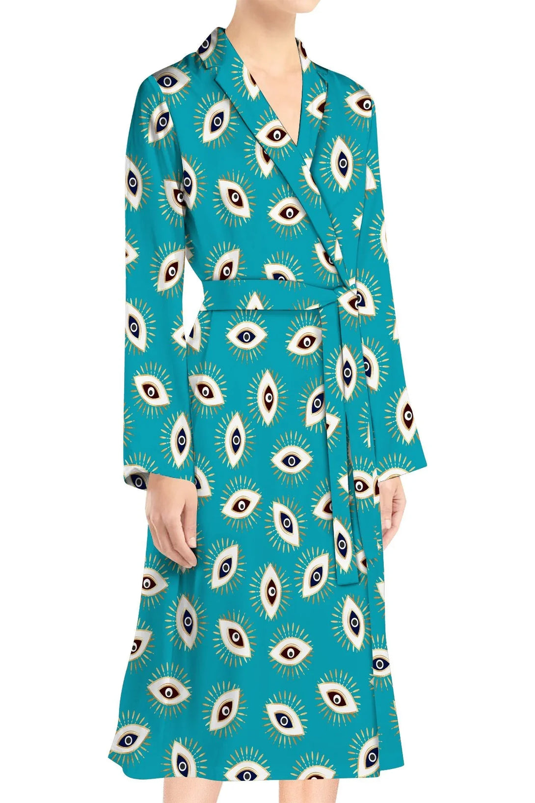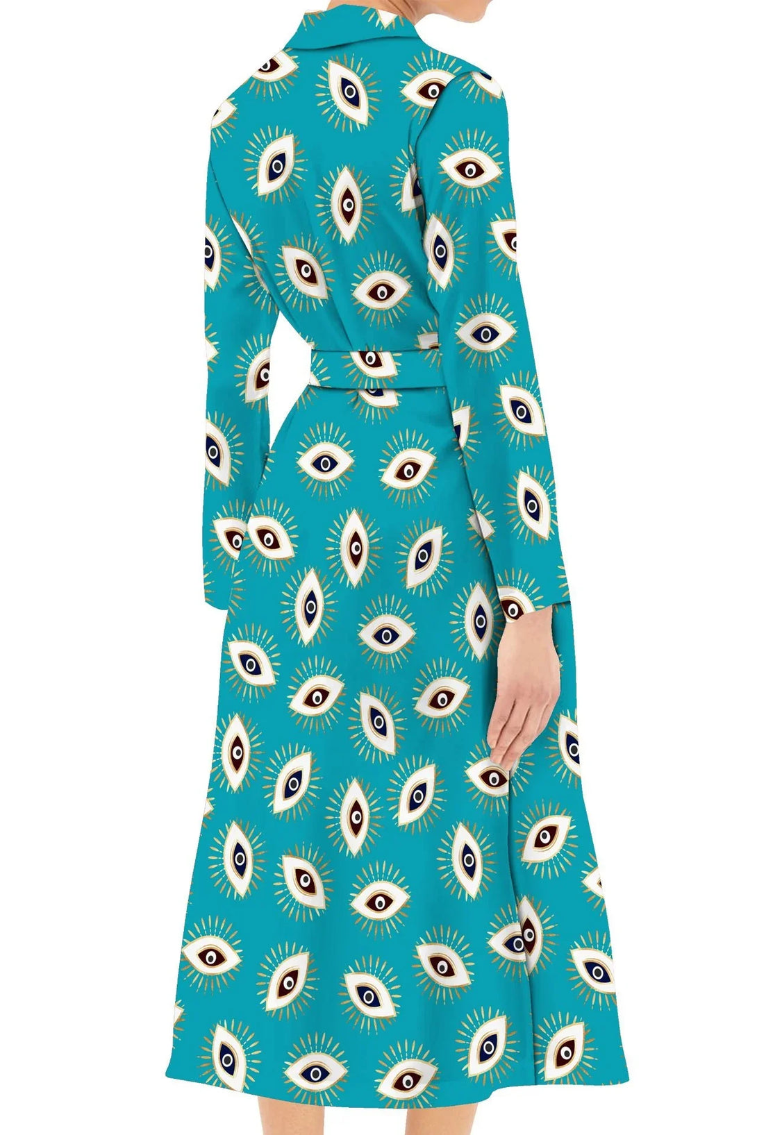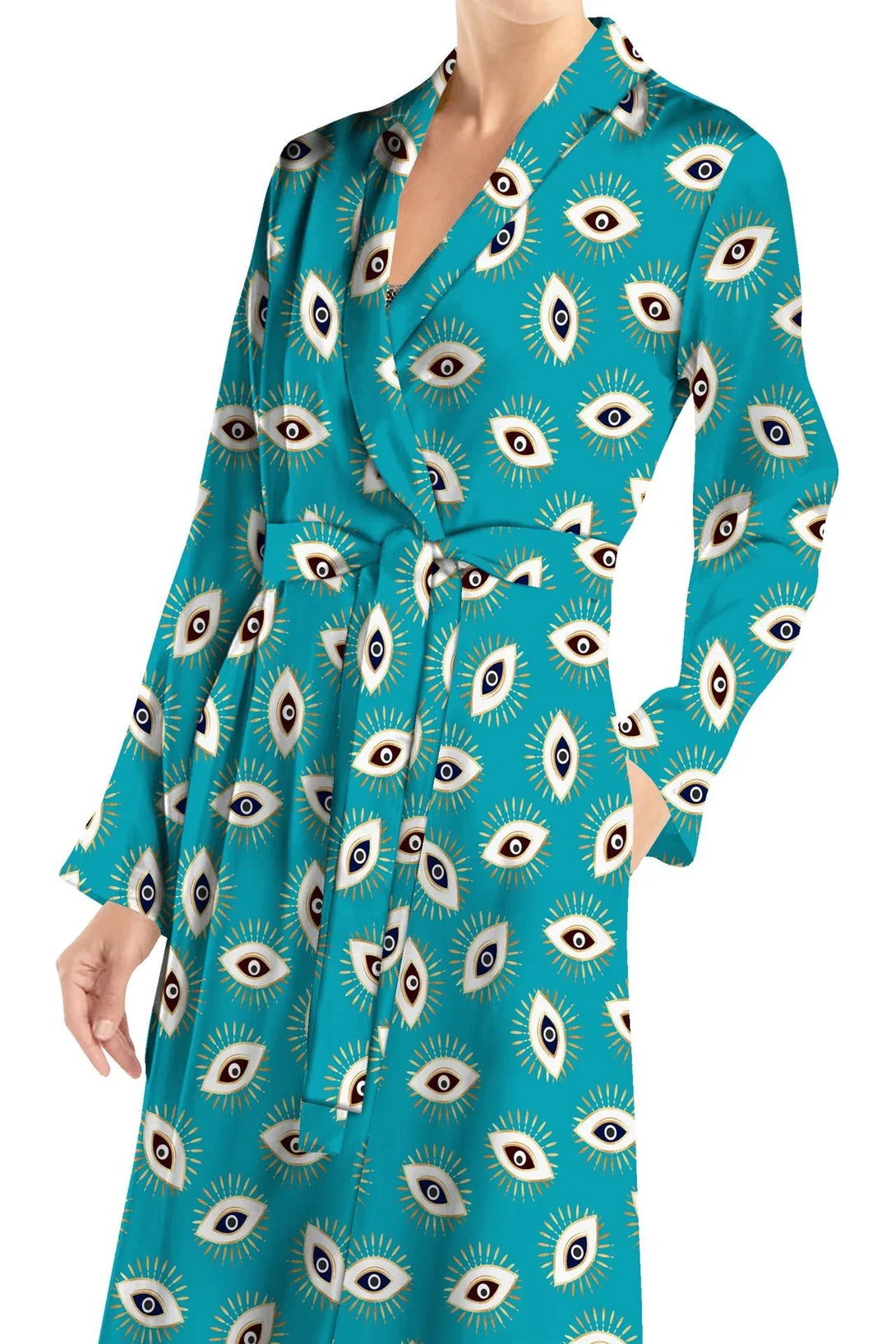 This aqua wrap dresses with sleeves is made of lustrous cupro silk and features an solid aqua, wrap dress midi length, wrap front midi dress, at Kyle X Shahida. Wear it loose or cinch the belted waist to define your figure.
