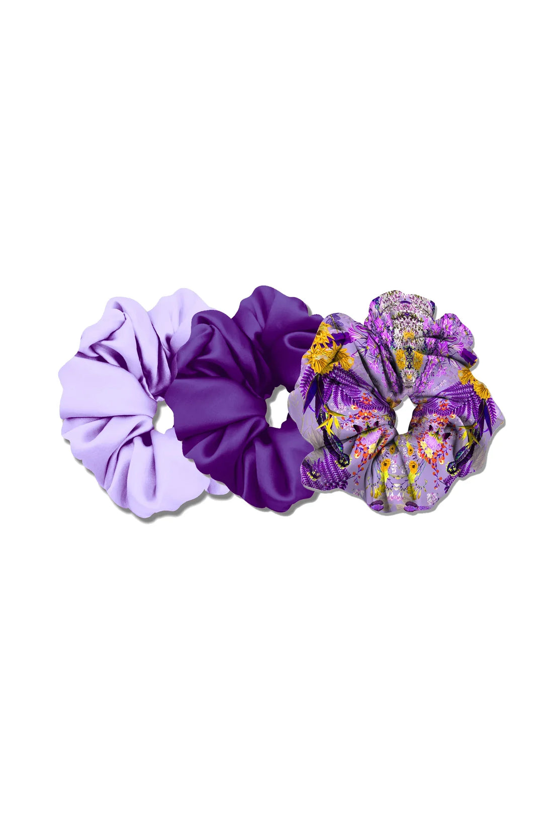 This set includes 1 Large x PurpleĀ SolidĀ scrunchies. 1 Large x Light Purple Solid scrunchies, 1Ā Large xĀ Multicolor PrintedĀ Ā scrunchies,