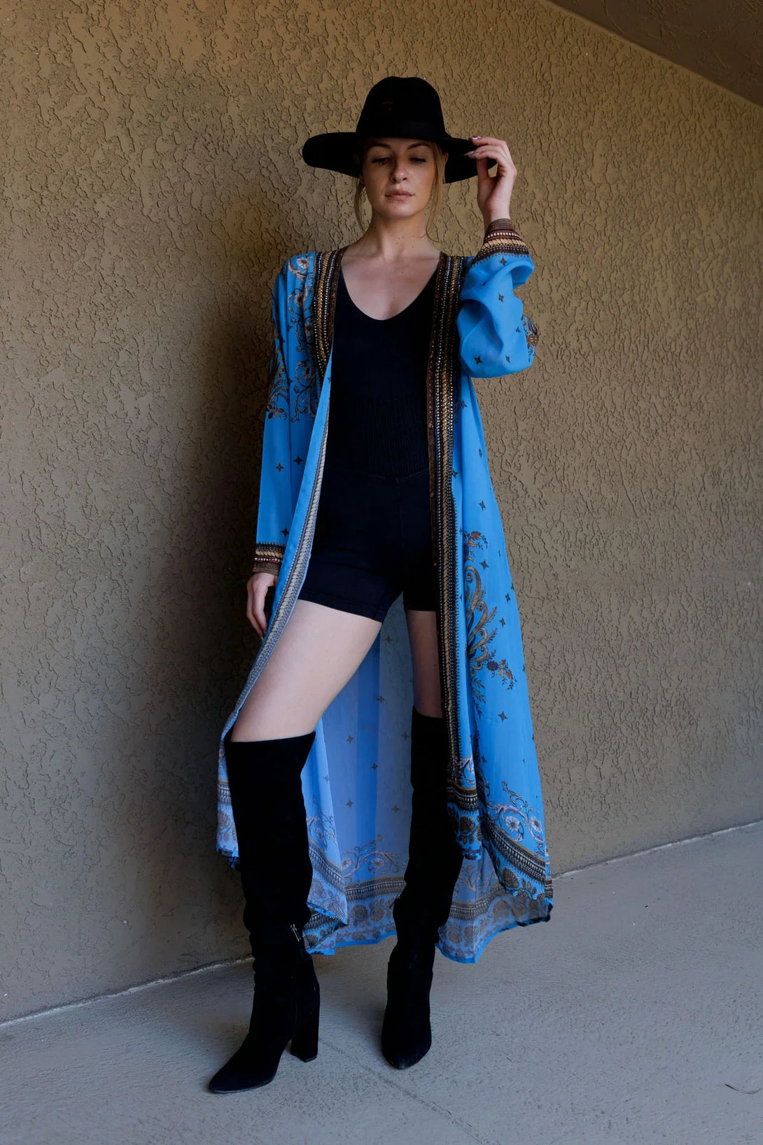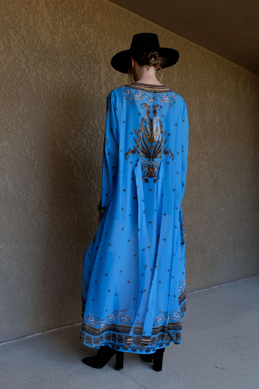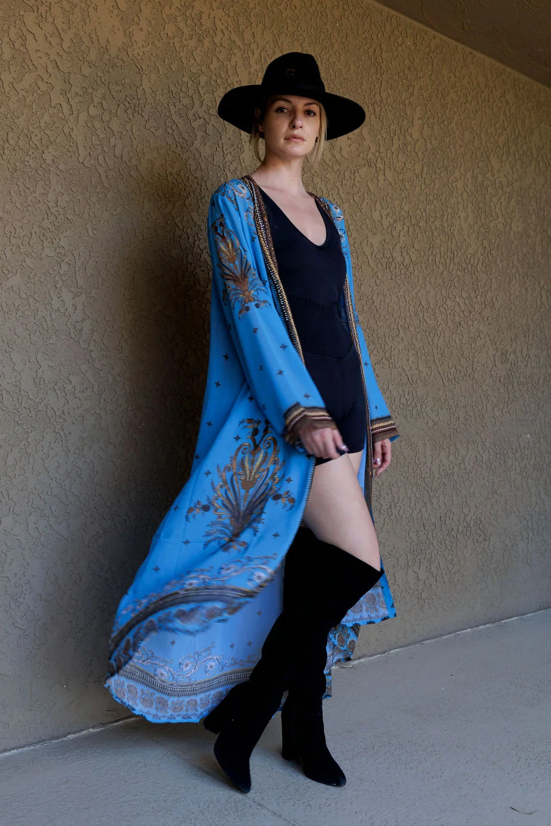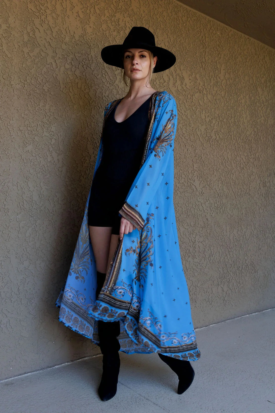 A lightweight, semi-sheer duster features a pretty print, tie waist, and sparkling rhinestone accents for boho-chic style, where its long sleeves adds an elegant look to your outfit, at Shahida Parides.