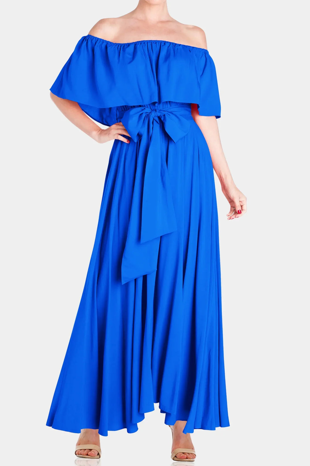 Elegant Off-Shoulder Blue Maxi Dress with Belt