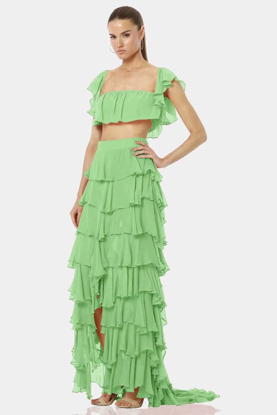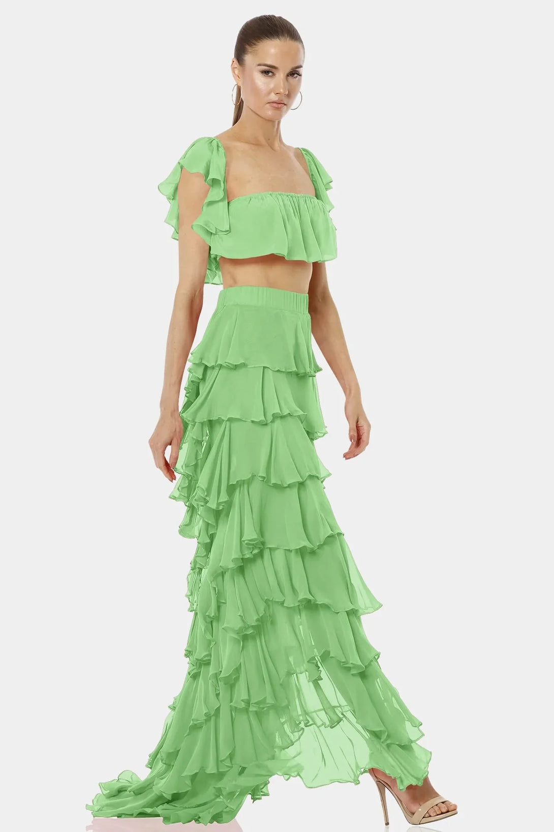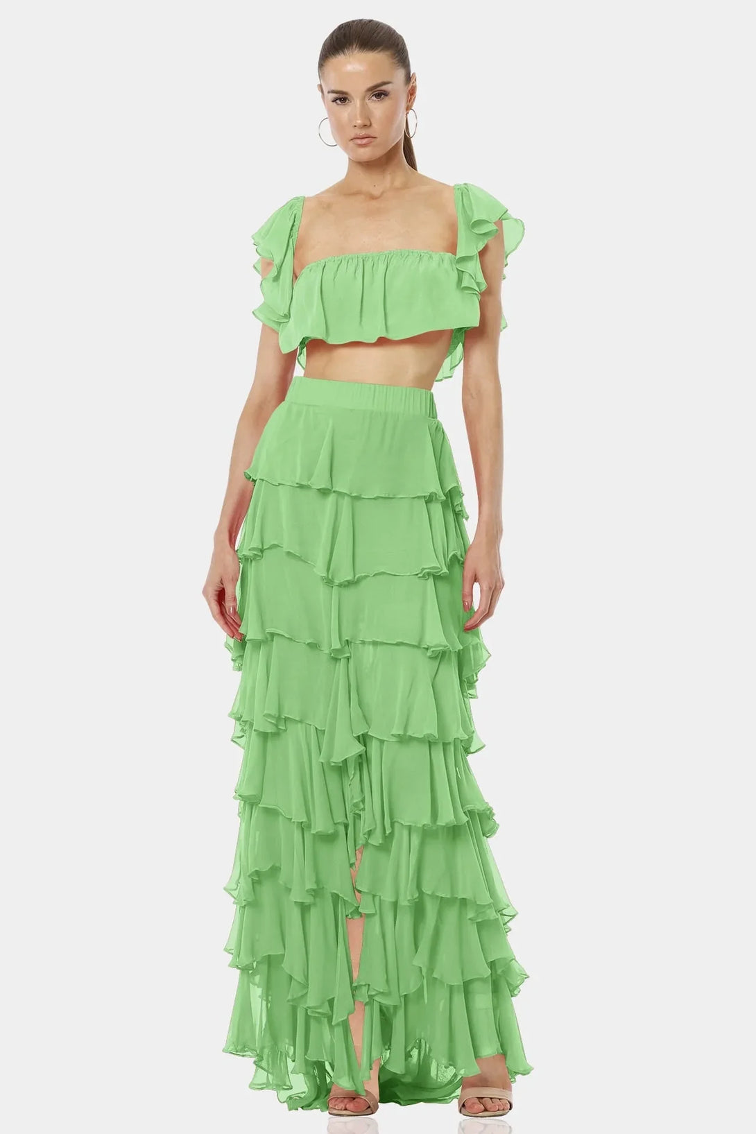 Nothing like Mint Green Long Skirt to make you feel fabulous, where its High Splits and crazy Ruffles can create an exotic look to make your vacations memorable.