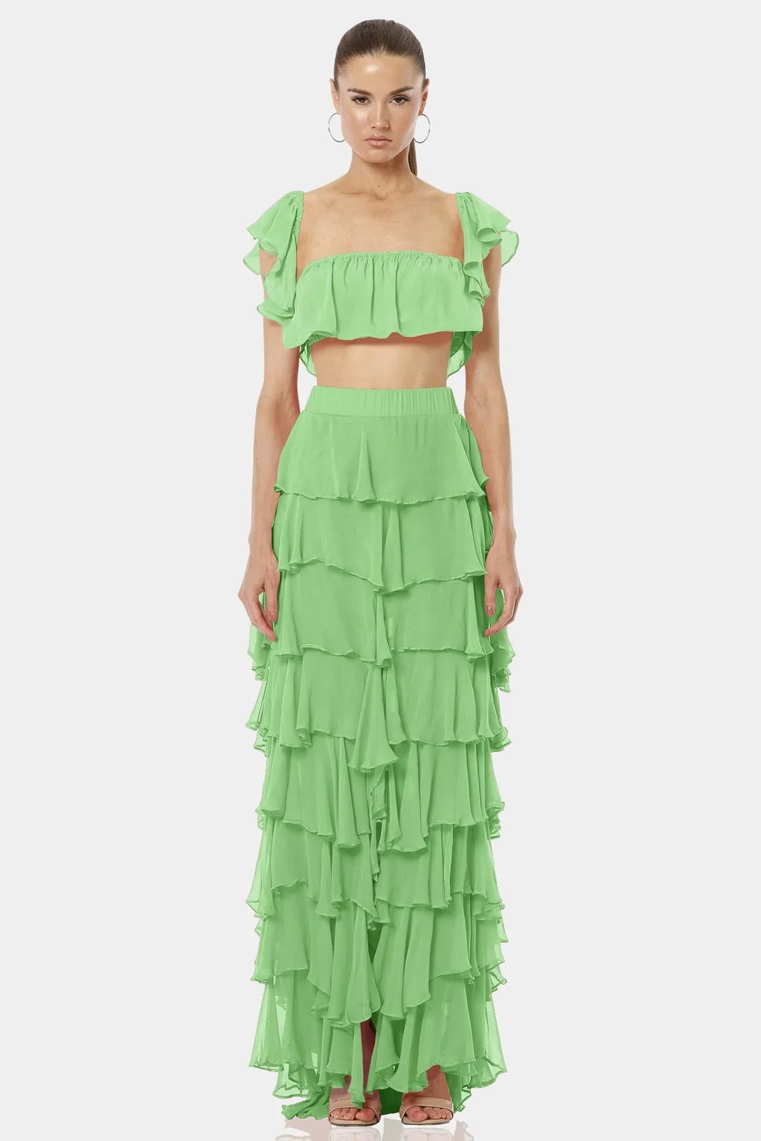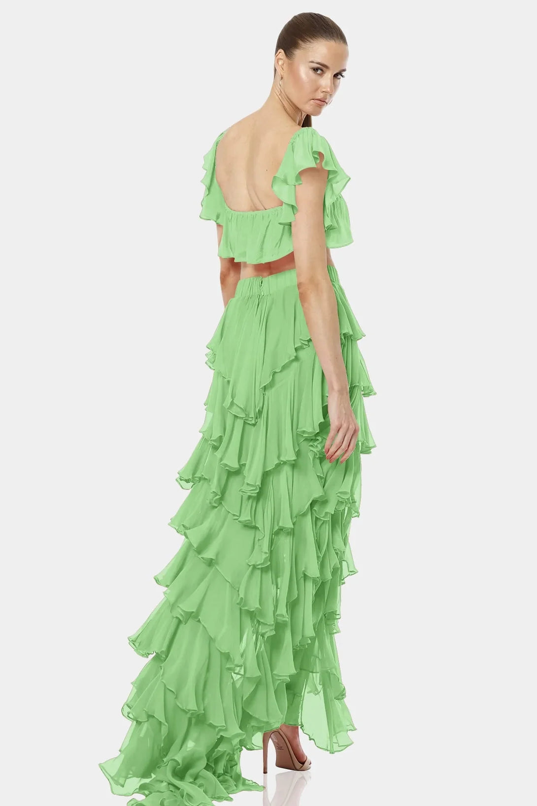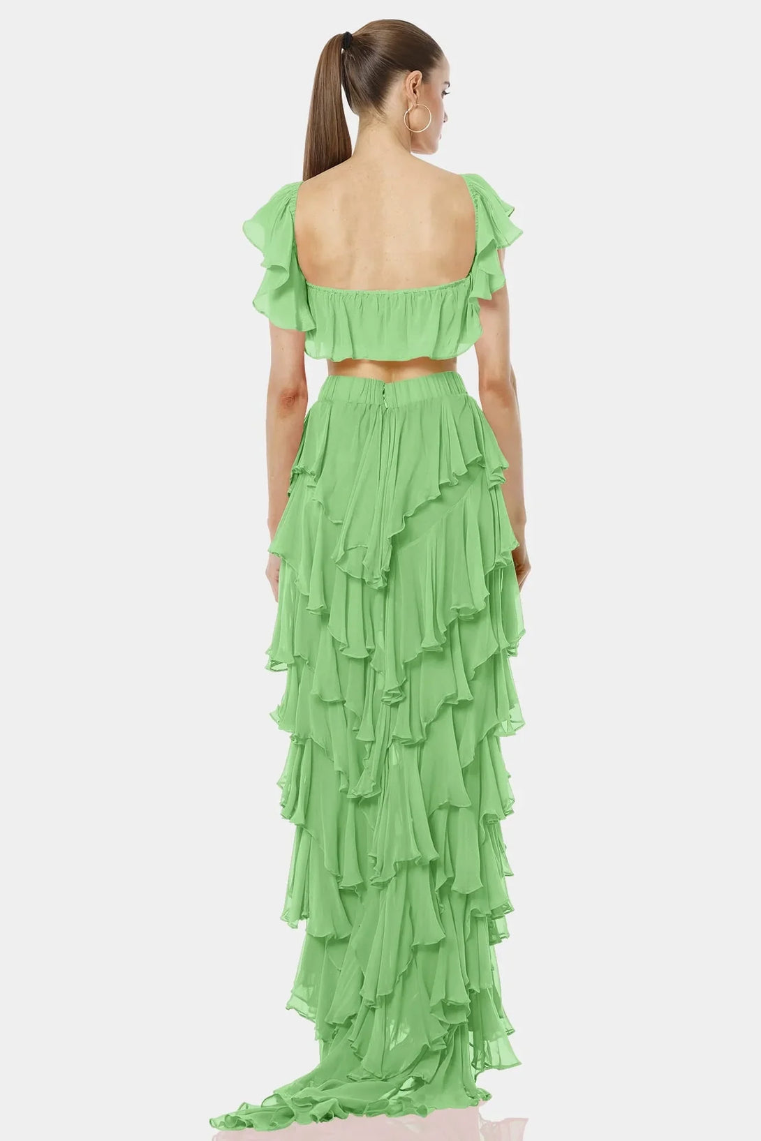 Nothing like Mint Green Long Skirt to make you feel fabulous, where its High Splits and crazy Ruffles can create an exotic look to make your vacations memorable.