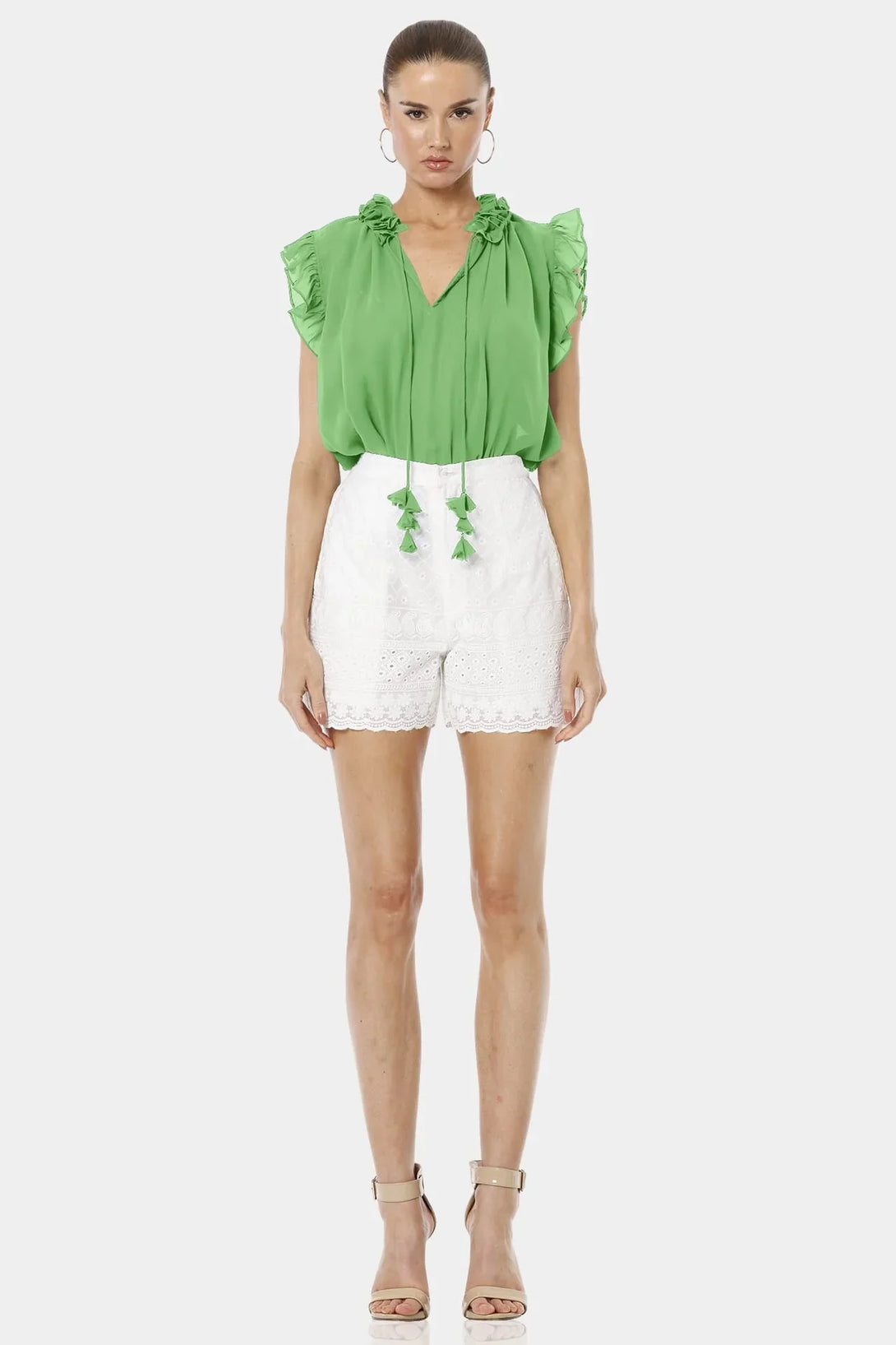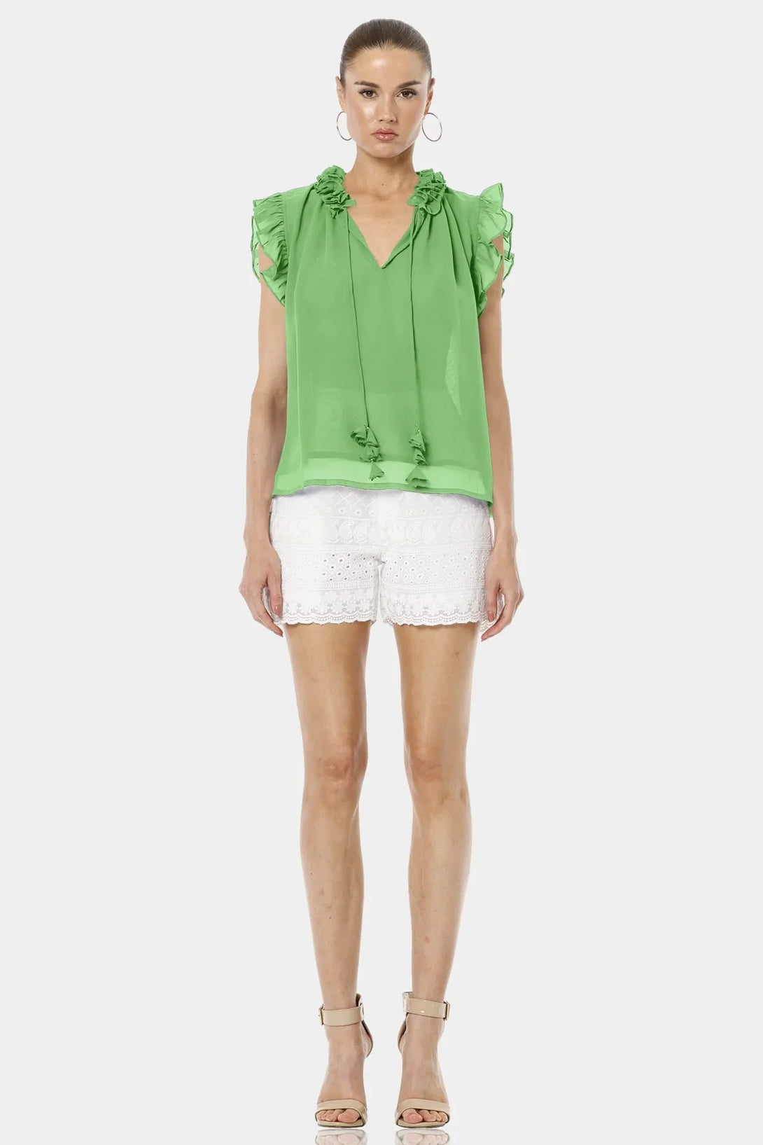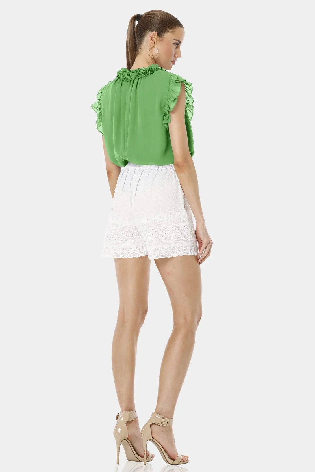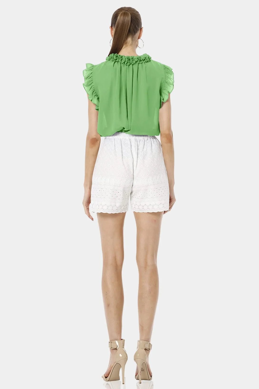 Mint Green never goes out of style get the look in this perfect Mint Green Ruffle Sleeve Top with Ruffle Neckline. Its Tie Up Neck can enhance your look with charming ruffles.