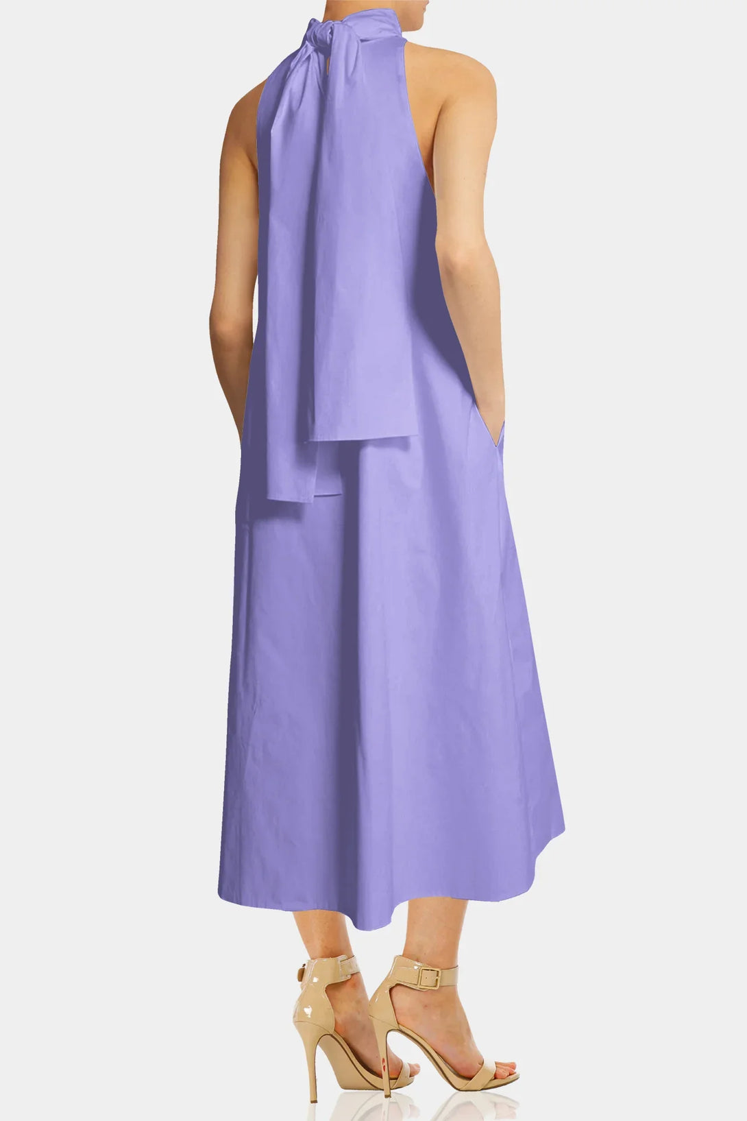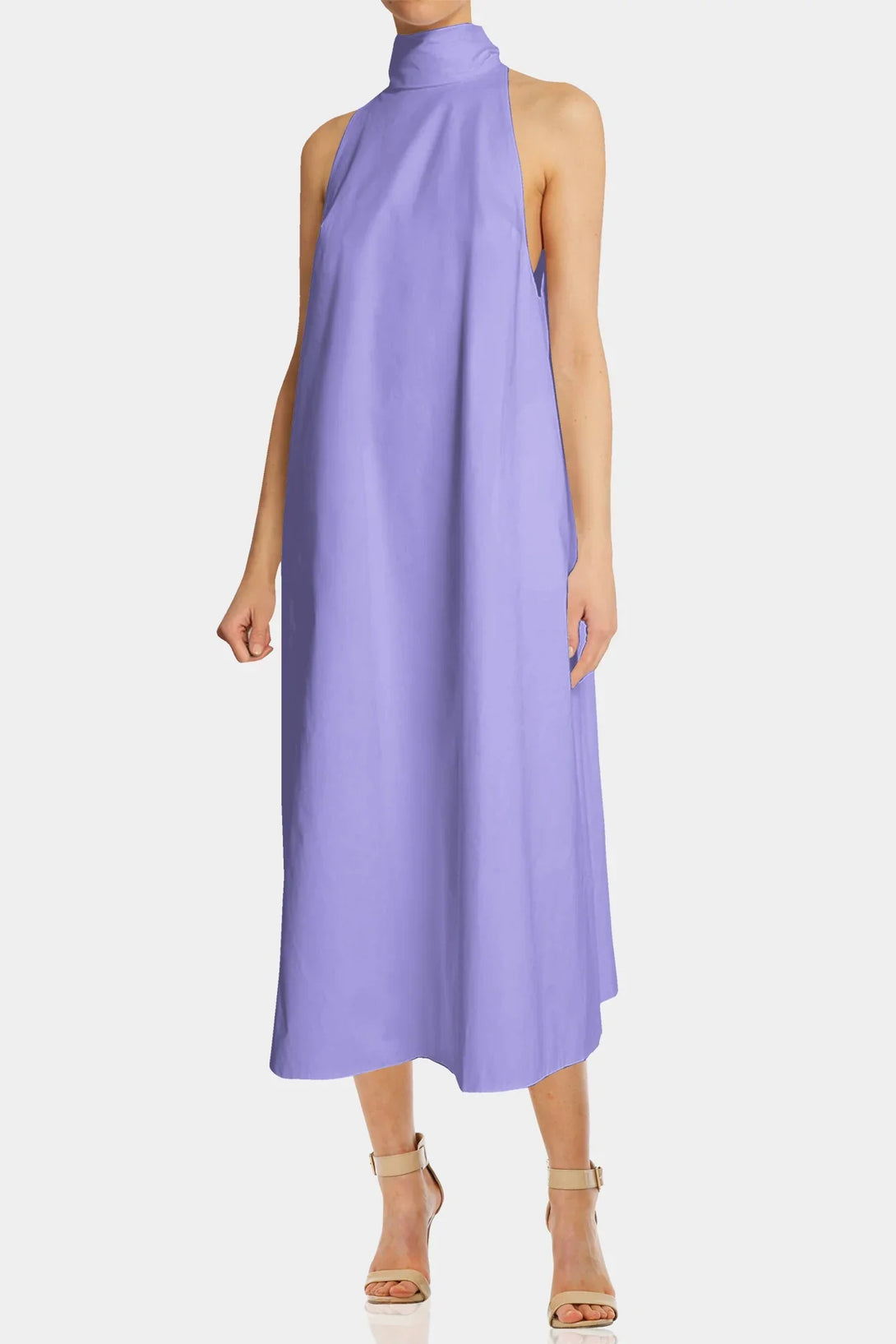 Elevate your look with this regal Light  purple midi dress, crafted for timeless elegance. The high neckline and sleeveless cut create a refined silhouette, while the flowing fabric adds a touch of effortless grace. Ideal for formal occasions, brunch dates, or stylish vacations, this dress is a must-have for a confident, fashion-forward statement.