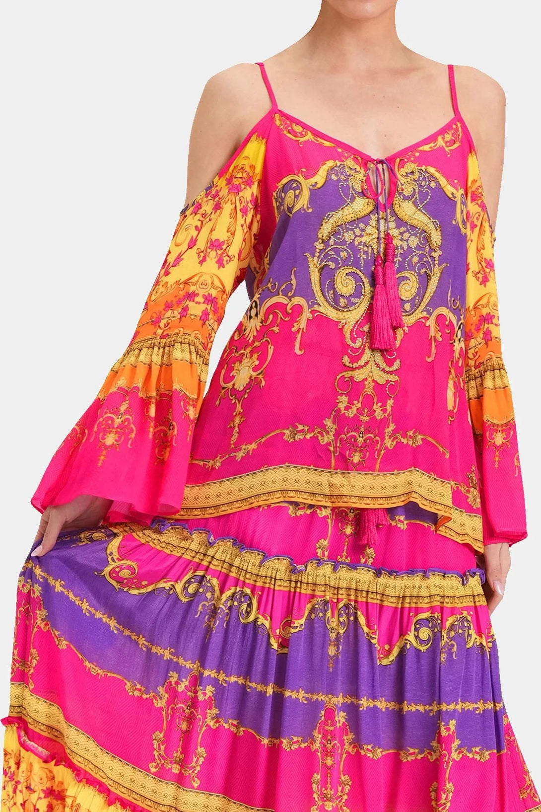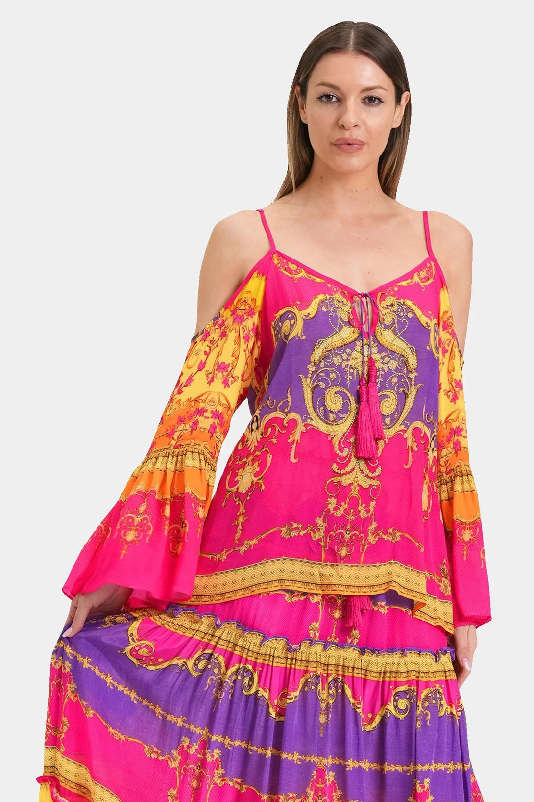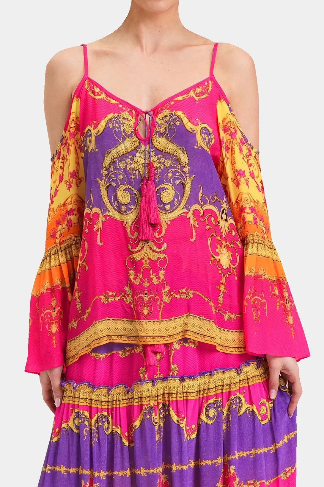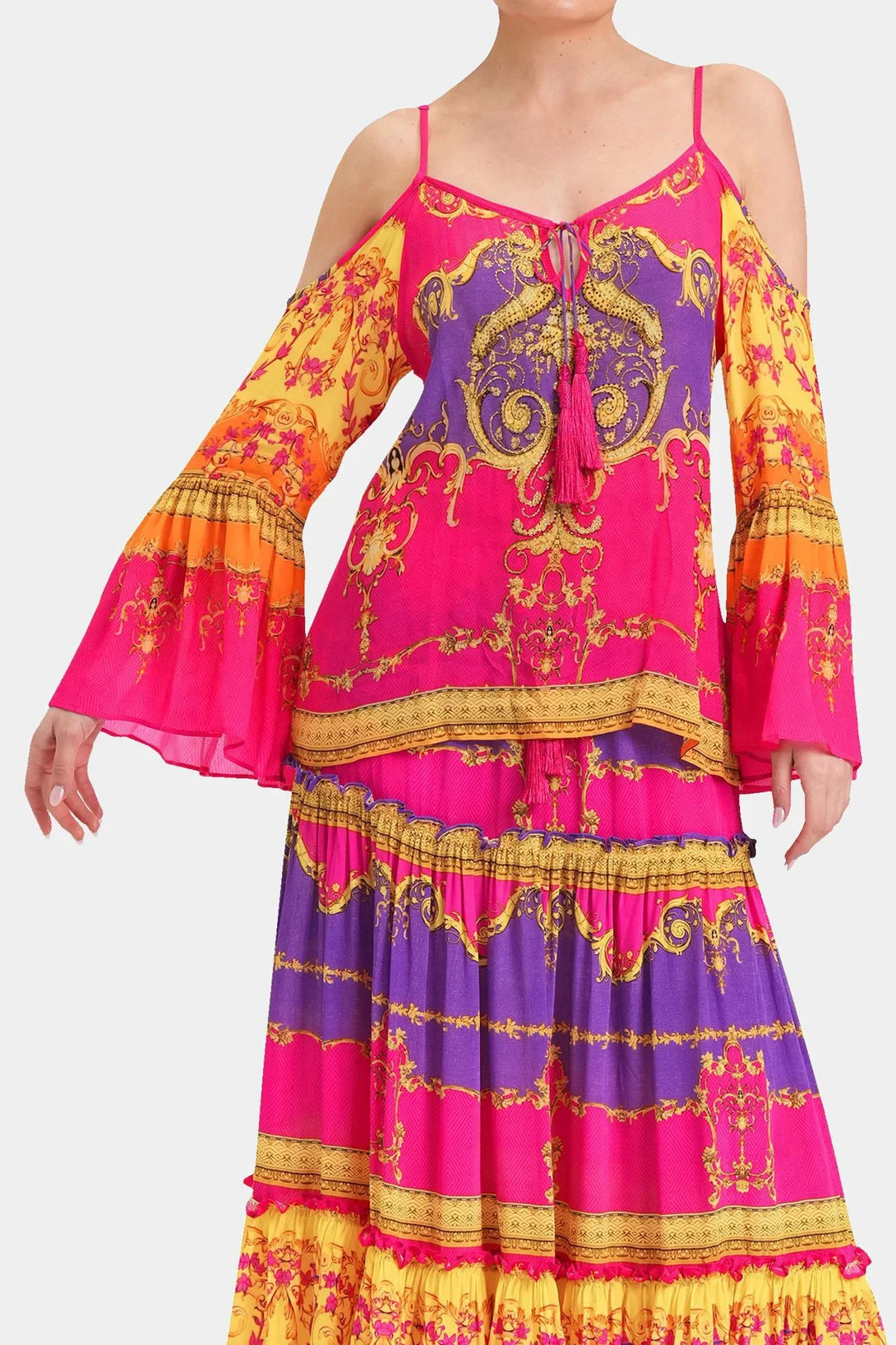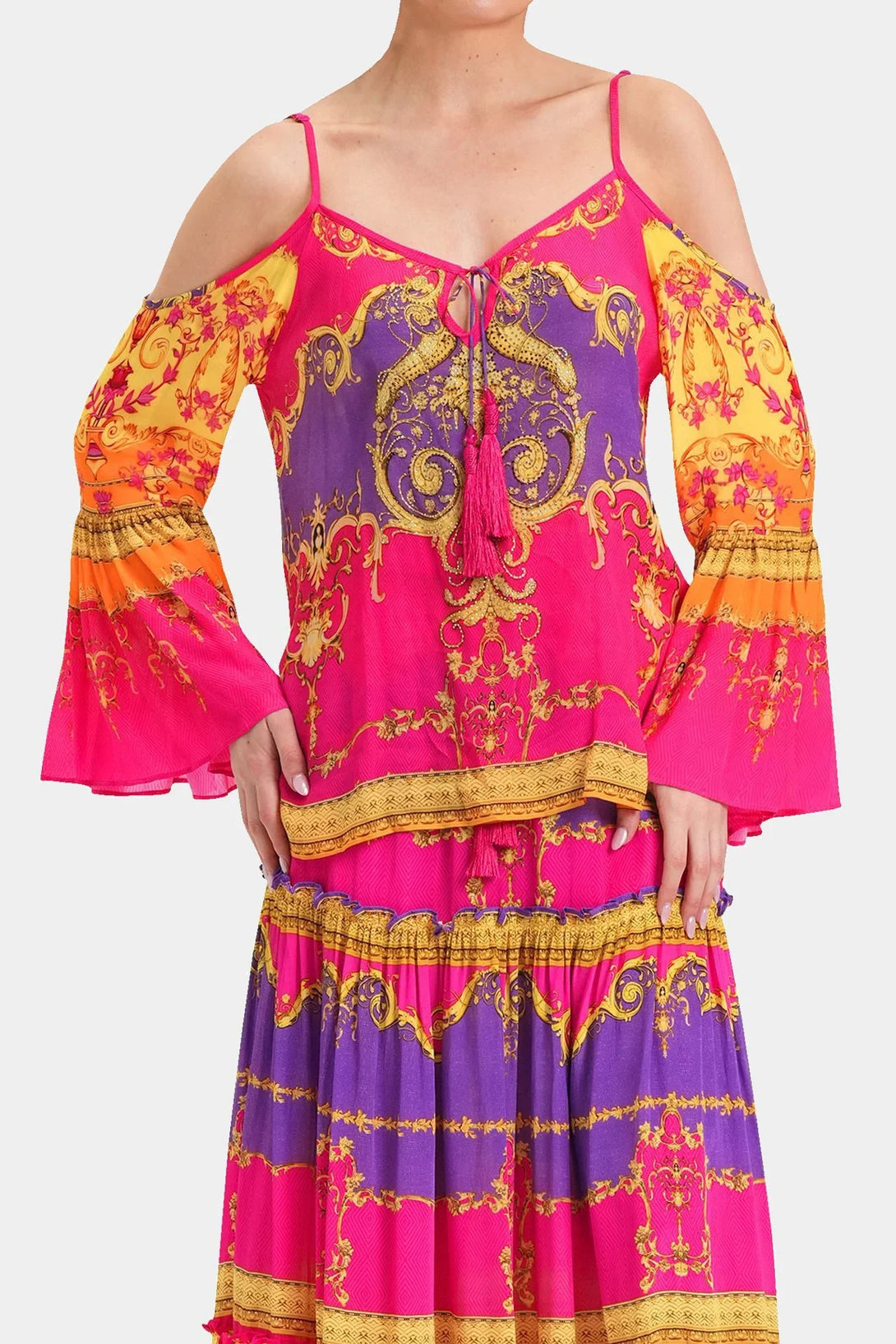 This trending summer top is perfect upper wear to create a statement look, which you can carry with matching bottom wear, which features cold shoulders, spaghetti straps, long bell sleeves, at Shahida Parides.