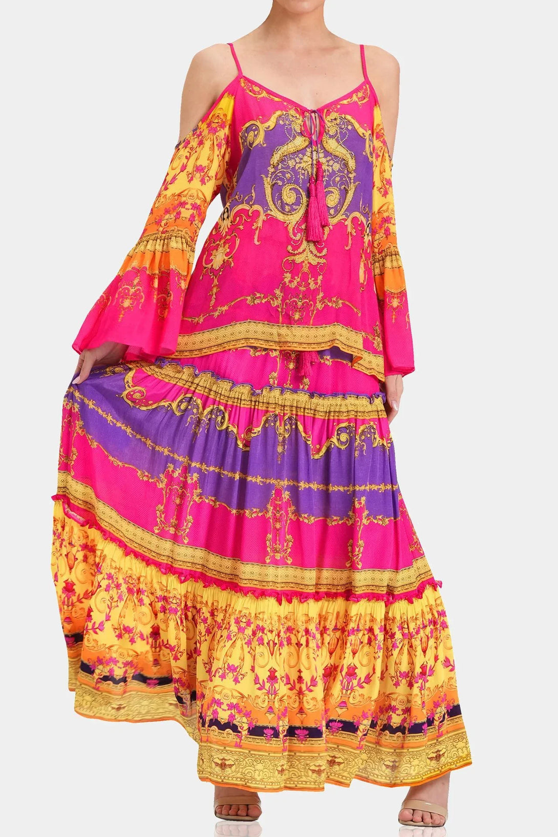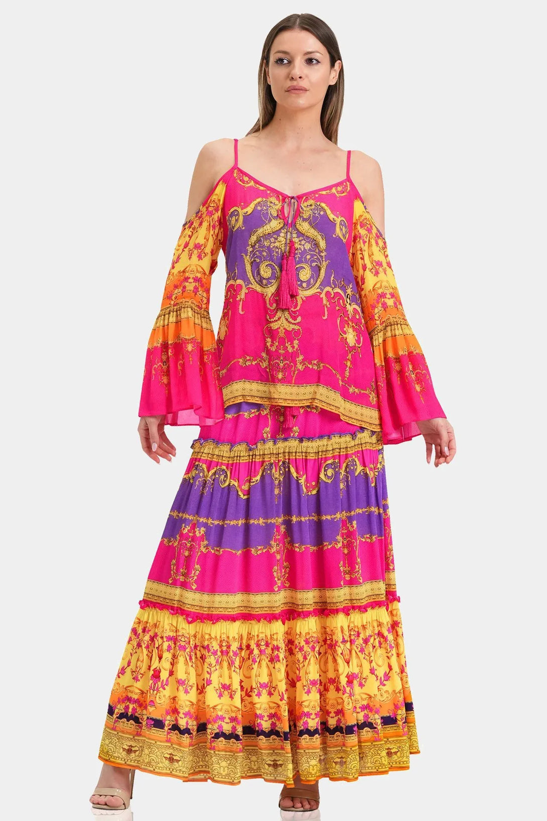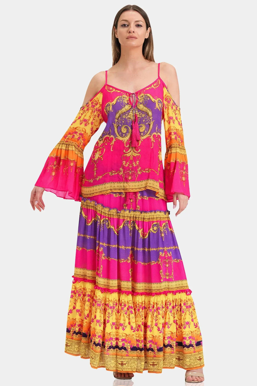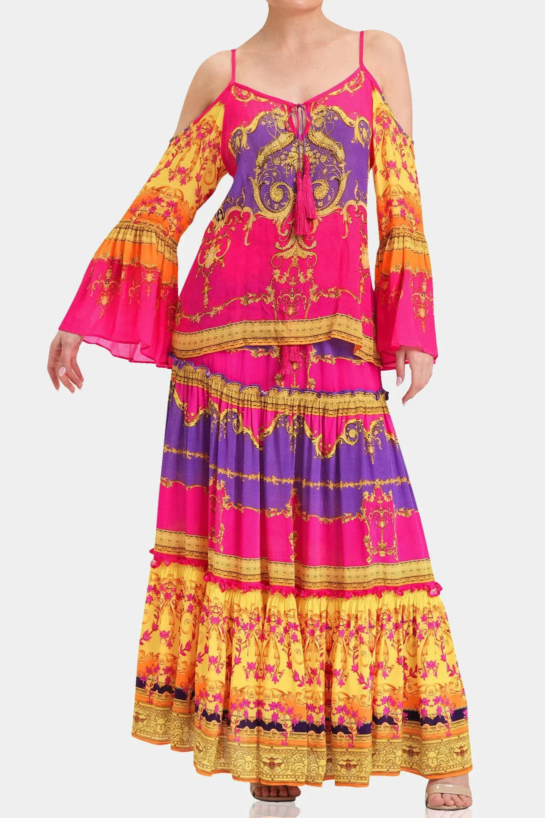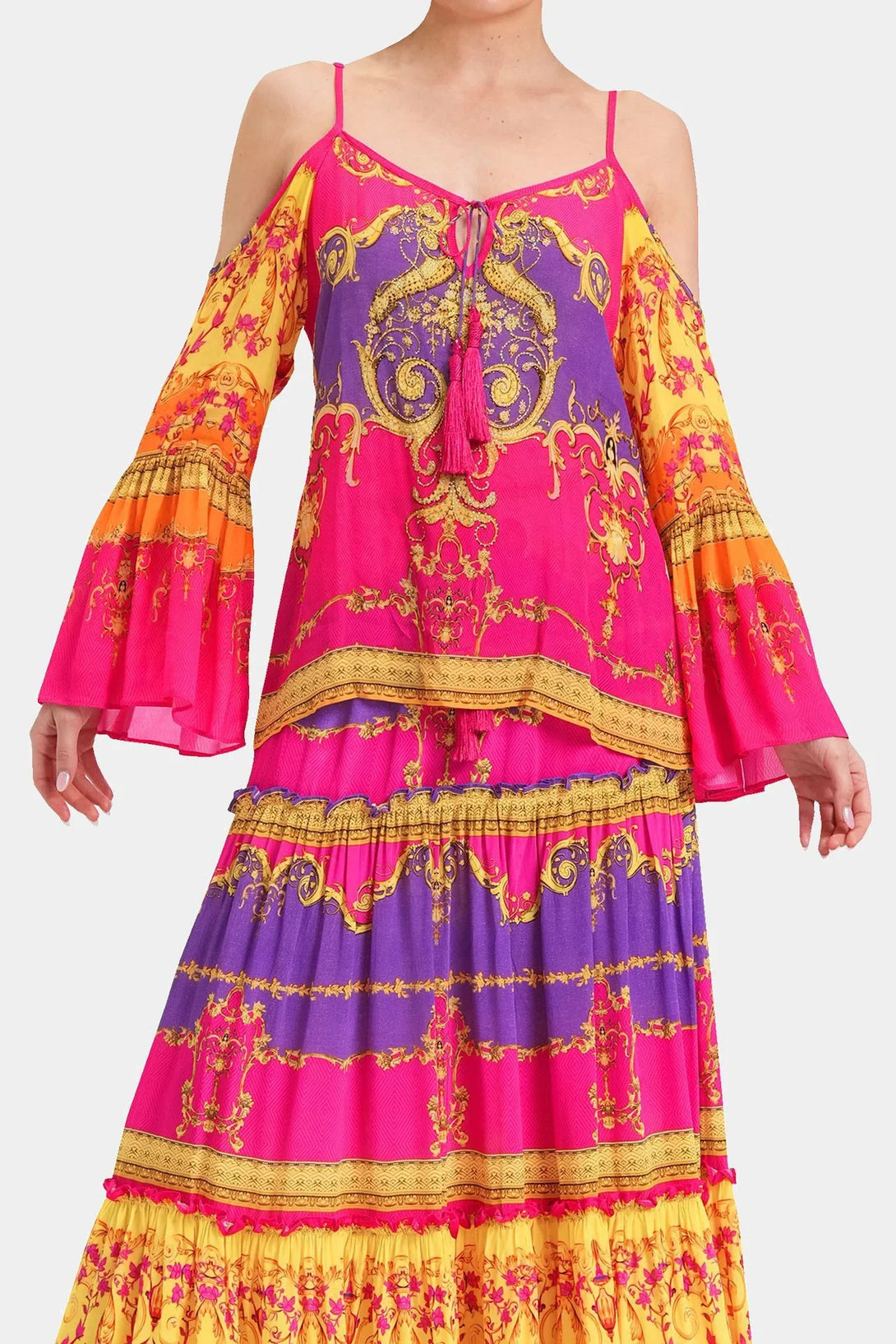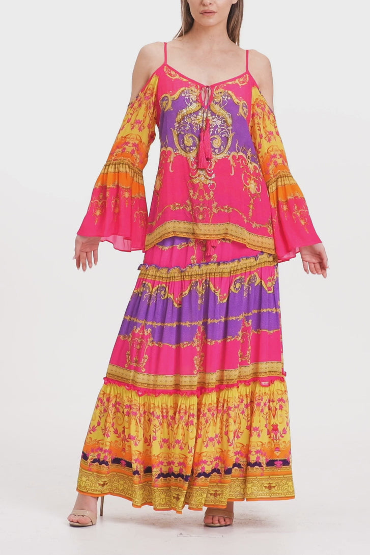 This trending summer top is perfect upper wear to create a statement look, which you can carry with matching bottom wear, which features cold shoulders, spaghetti straps, long bell sleeves, at Shahida Parides.