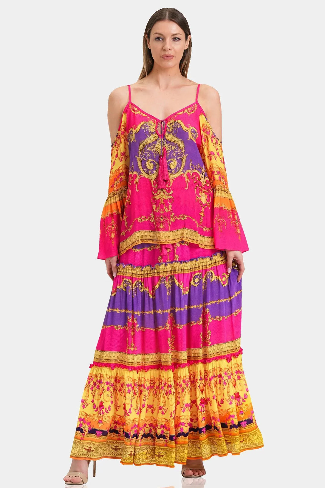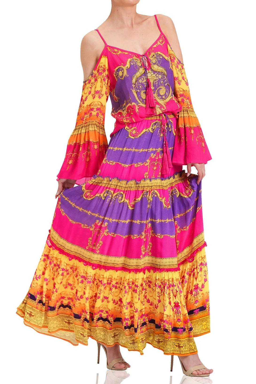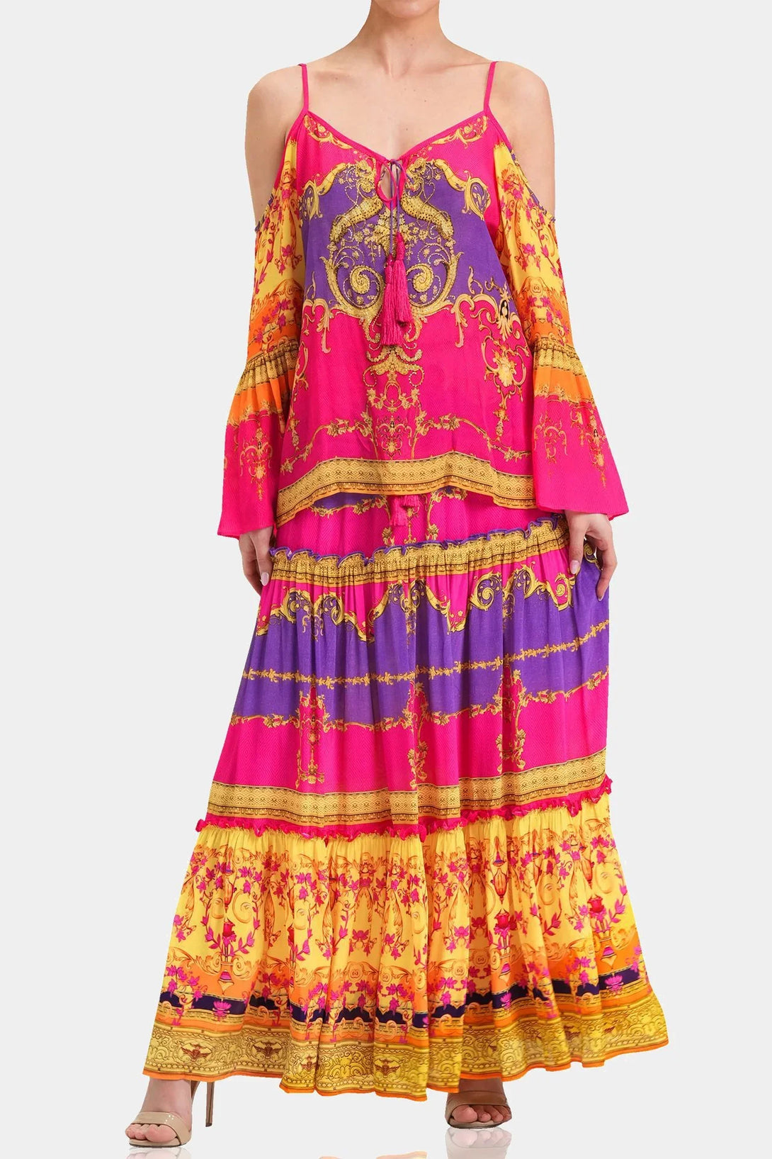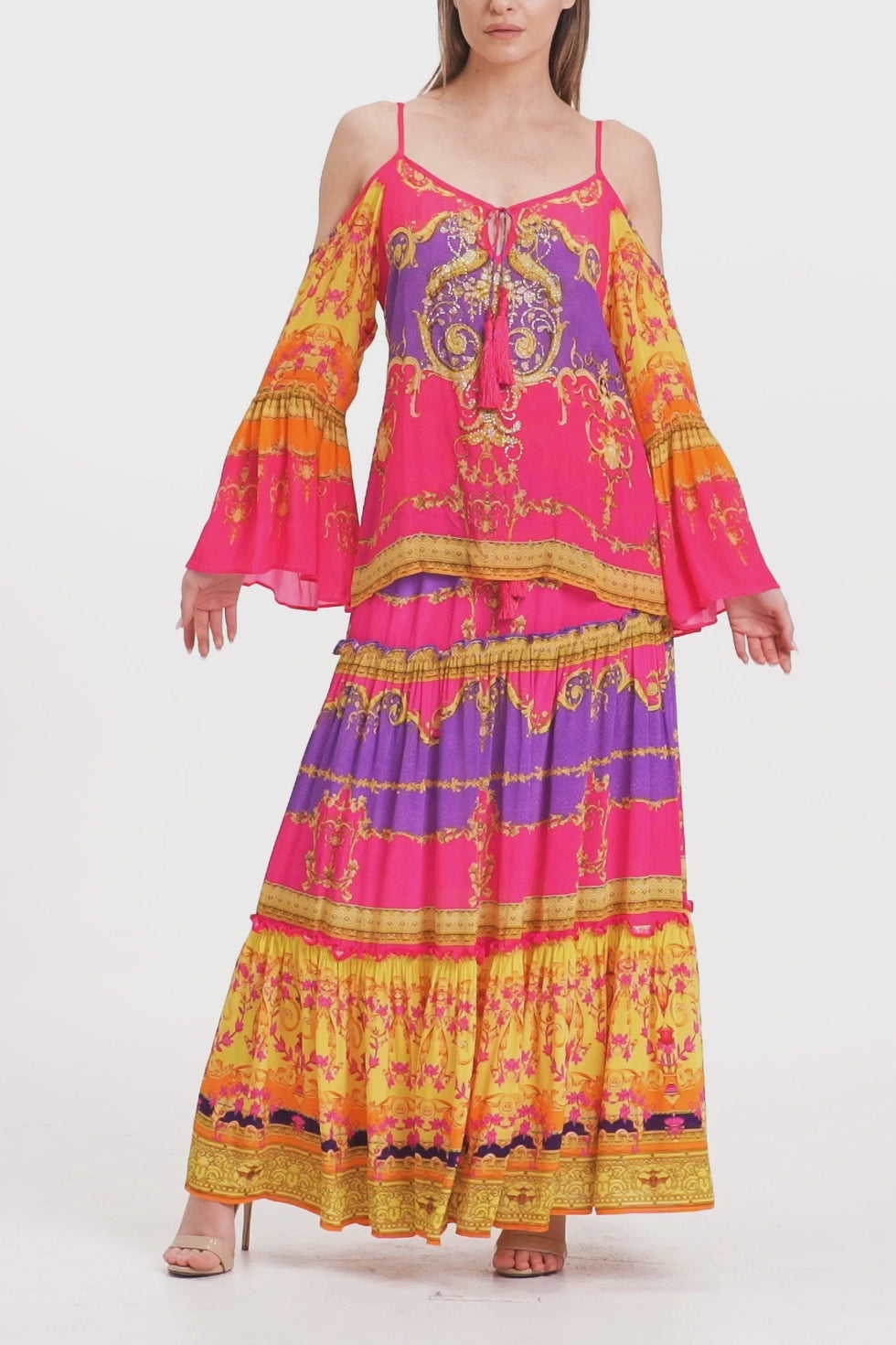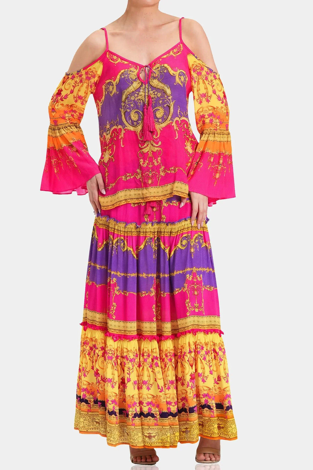 This trending summer top is perfect upper wear to create a statement look, which you can carry with matching bottom wear, which features cold shoulders, spaghetti straps, long bell sleeves, at Shahida Parides.