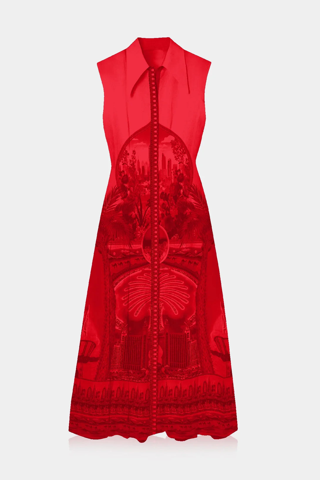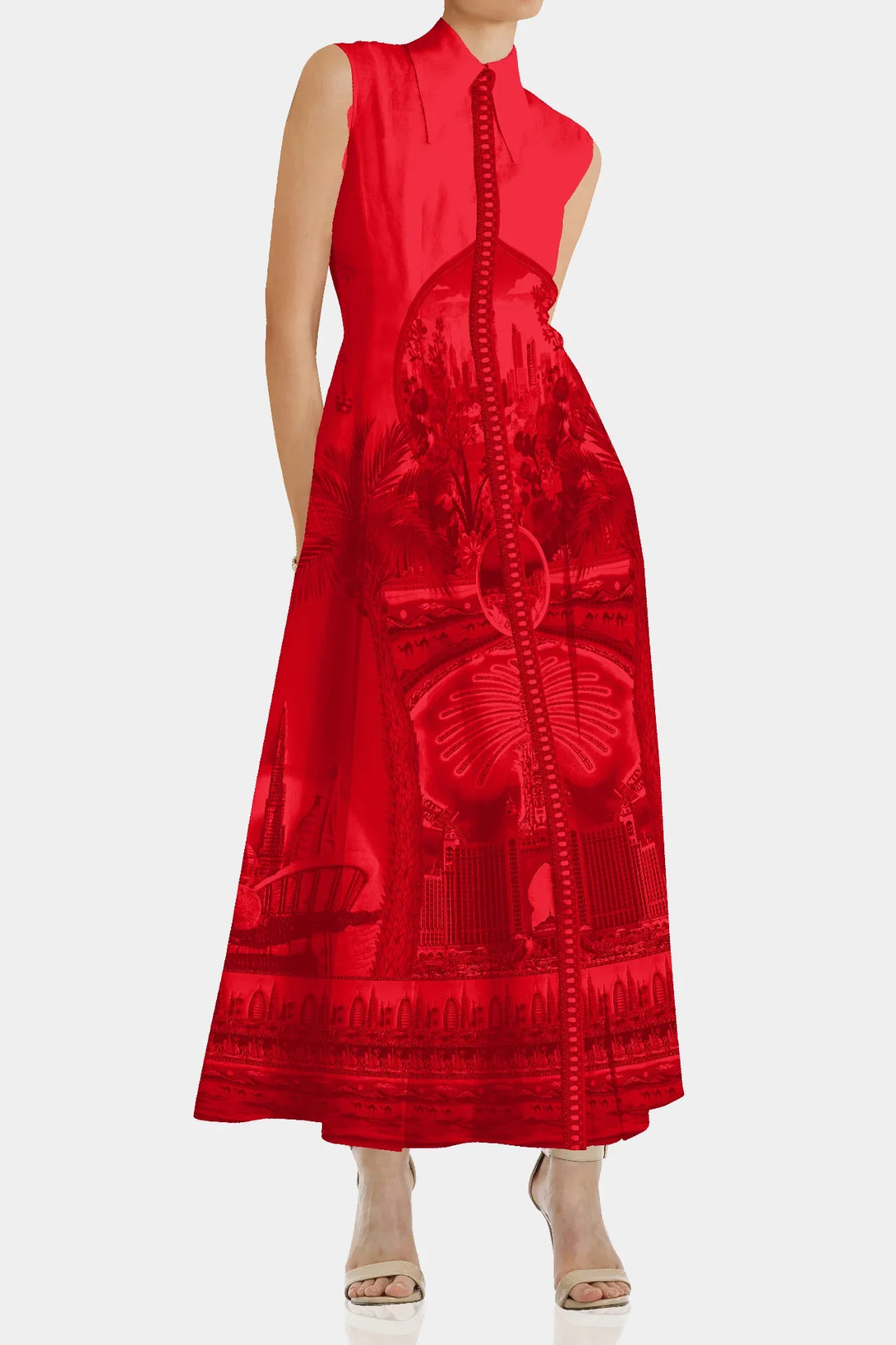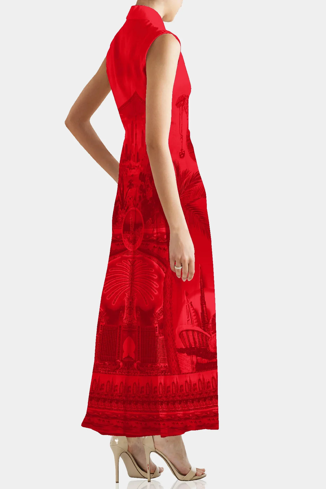 Explore our collections which features collared neckline, in sleeveless maxi dress style, in Dubai print, designed by Shahida Parides.