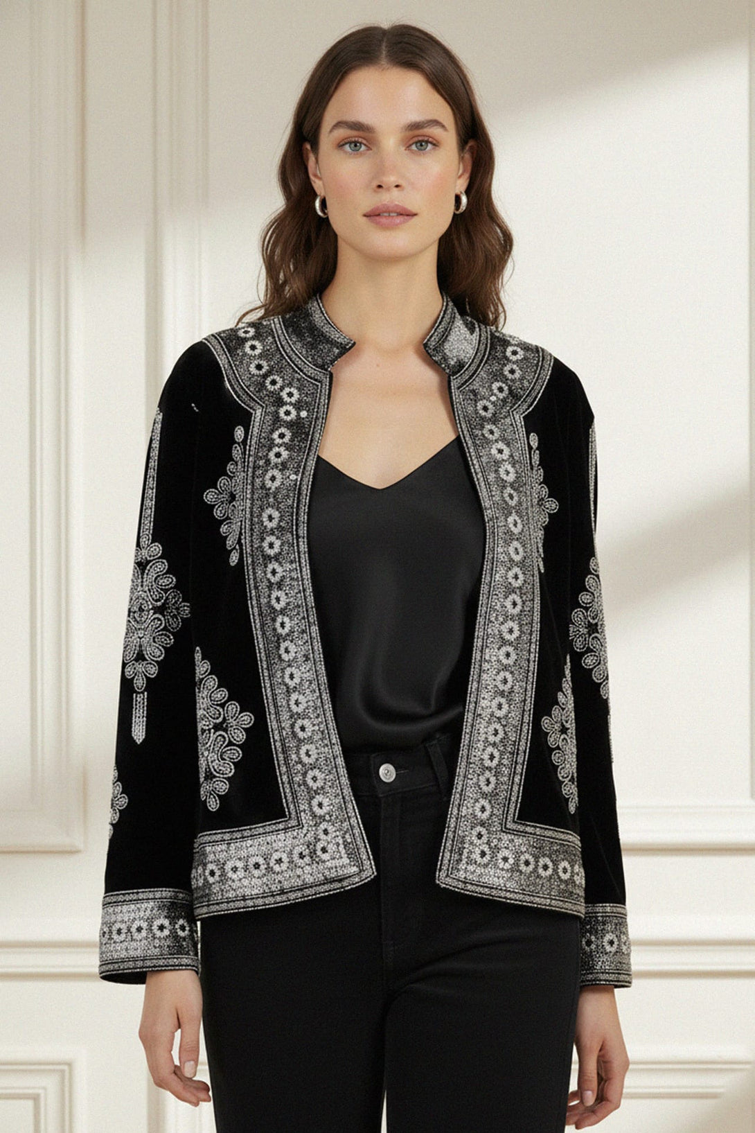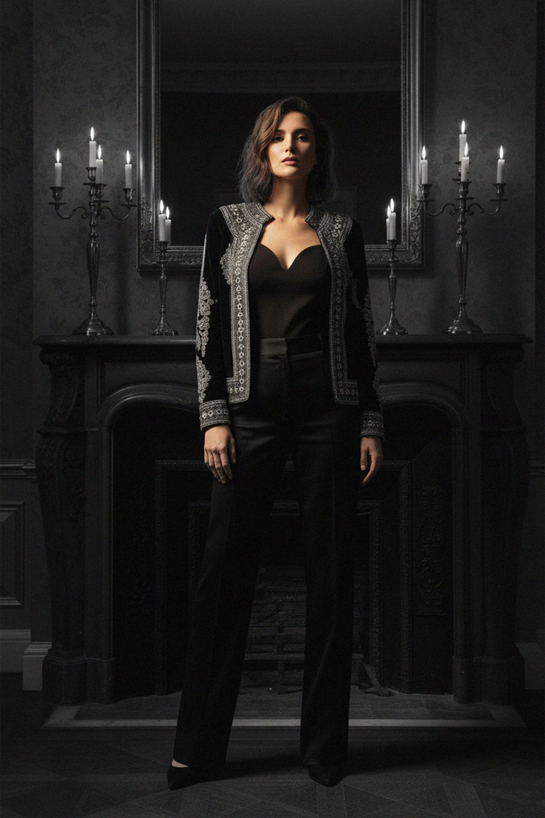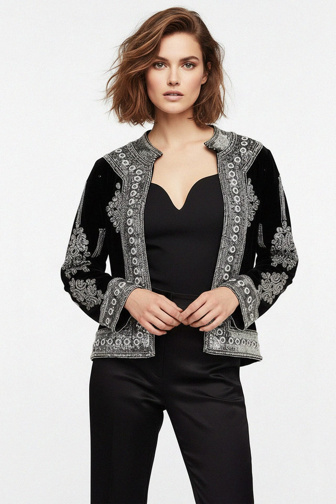 Indulge in luxury with our Embellished Black Velvet Jacket, designed for women who love timeless sophistication. Crafted from plush black velvet, this jacket features intricate hand-embellished details that shimmer under any light. Its structured silhouette and soft texture make it the perfect choice for evening parties, galas, and formal dinners. Pair it with tailored pants for a refined look or drape it over a dress for a touch of vintage-inspired glamour.