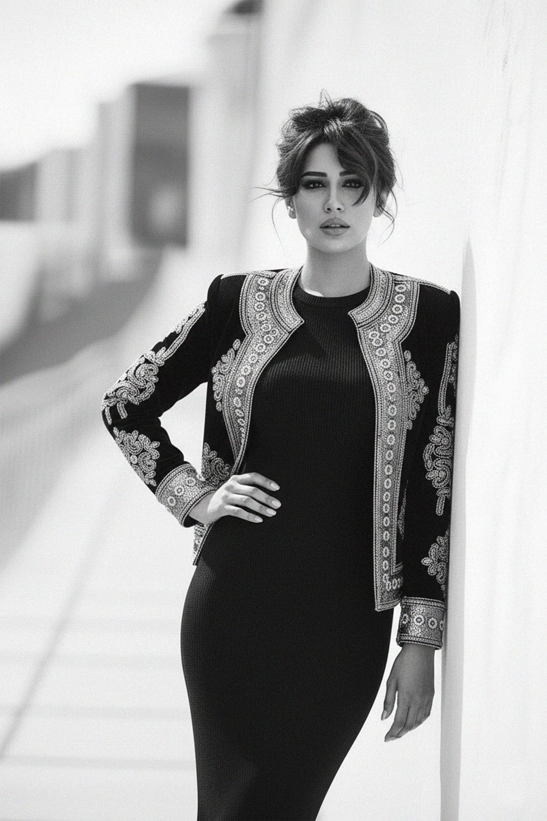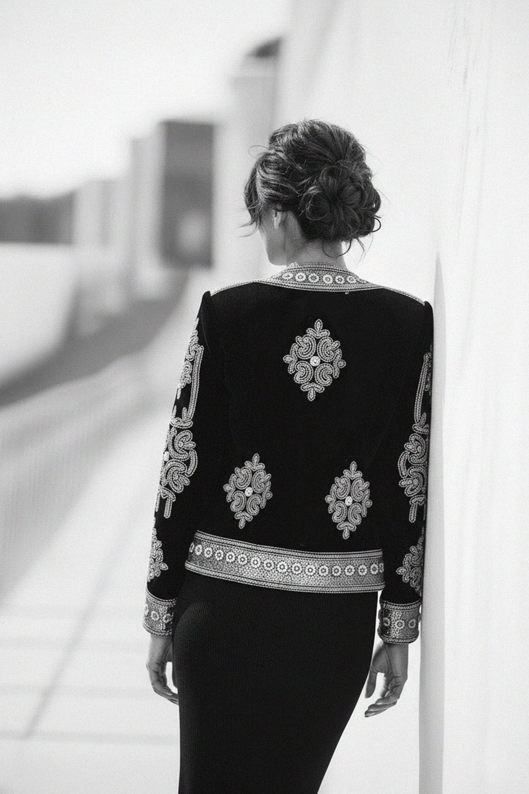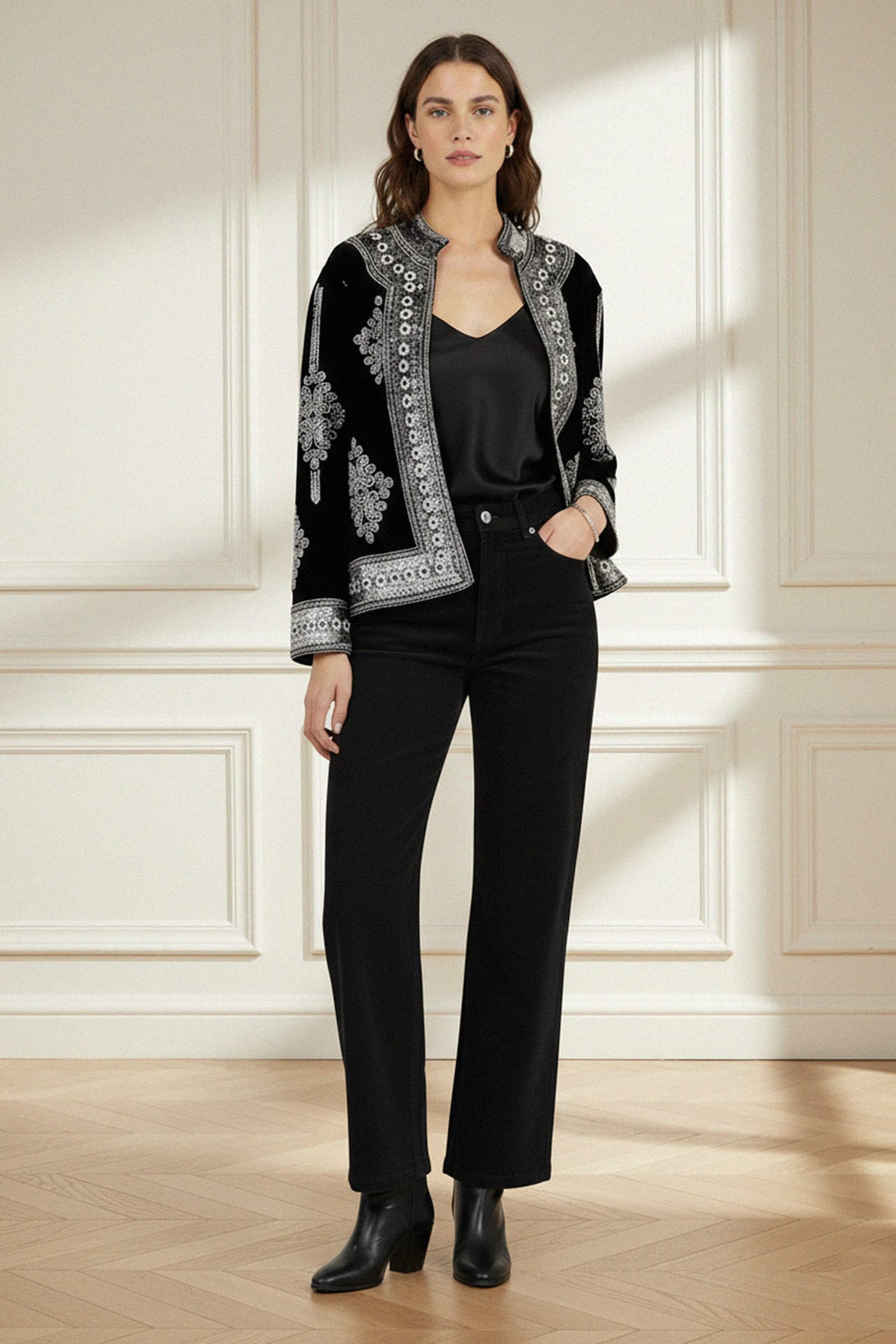 Indulge in luxury with our Embellished Black Velvet Jacket, designed for women who love timeless sophistication. Crafted from plush black velvet, this jacket features intricate hand-embellished details that shimmer under any light. Its structured silhouette and soft texture make it the perfect choice for evening parties, galas, and formal dinners. Pair it with tailored pants for a refined look or drape it over a dress for a touch of vintage-inspired glamour.