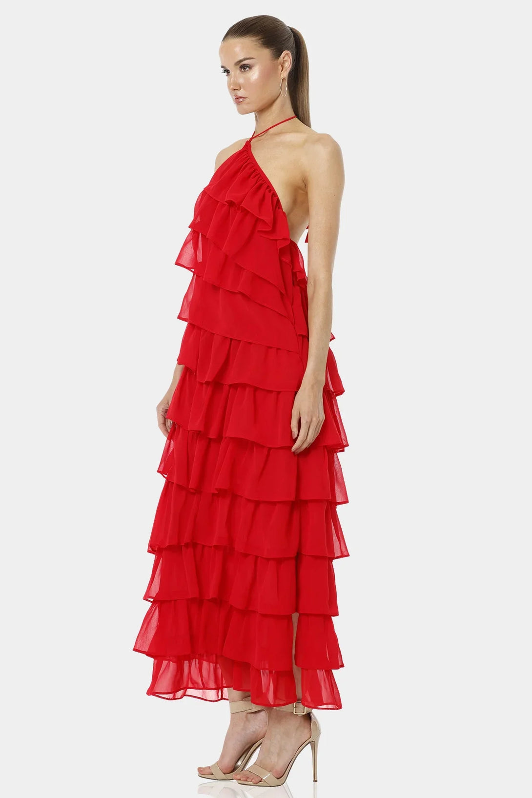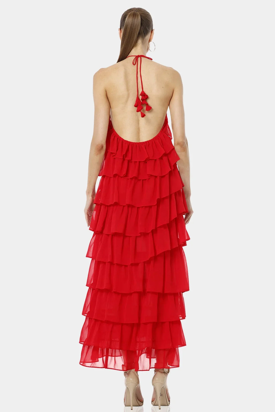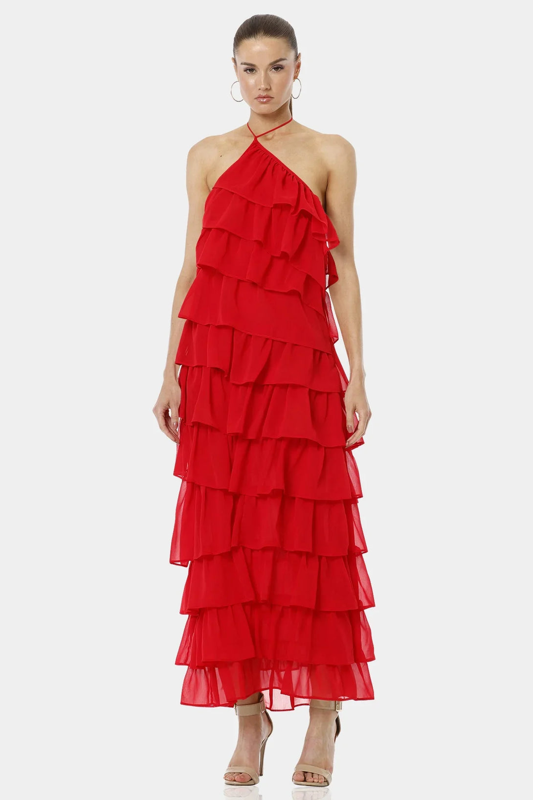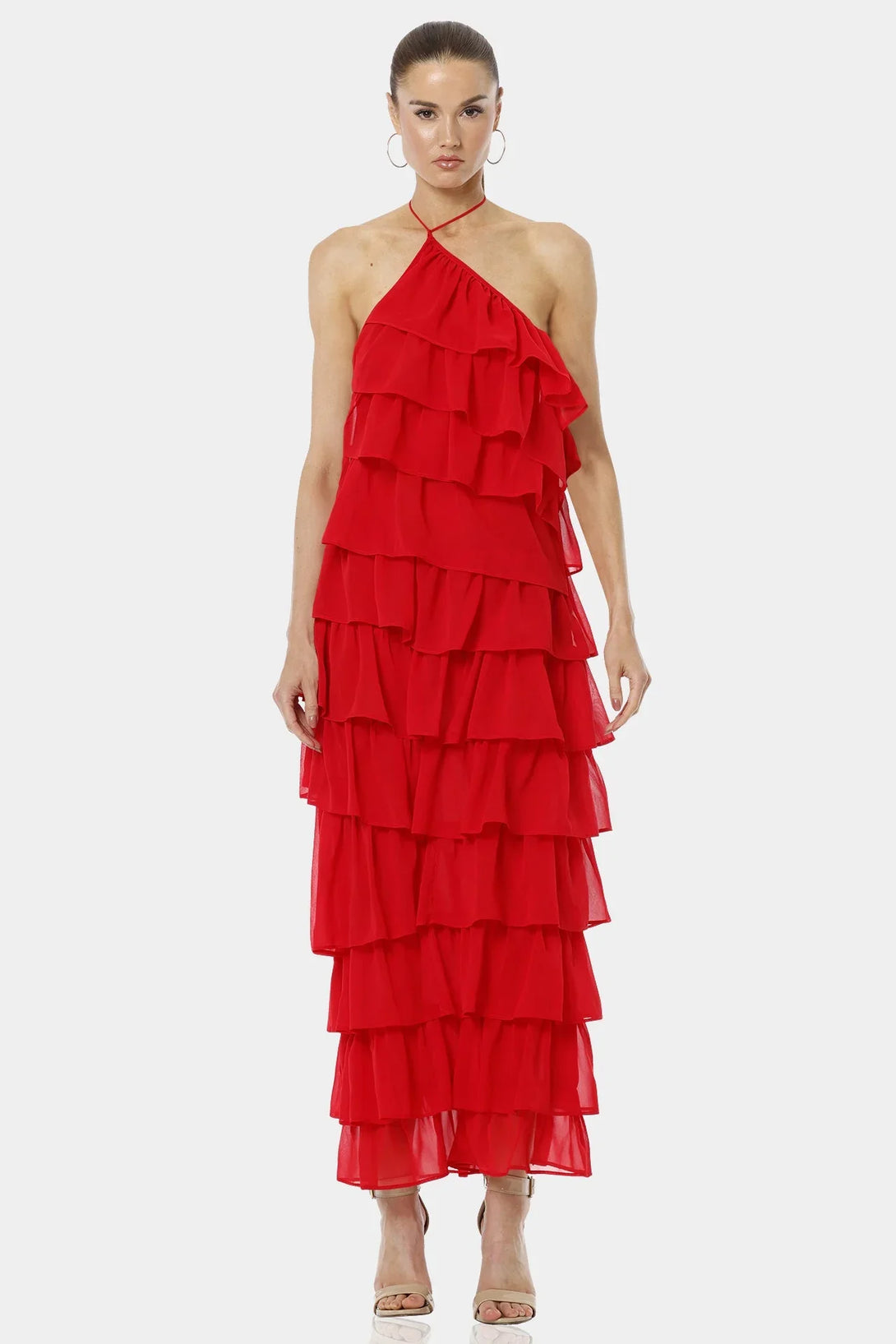 Atalanta Spicy Red Tiered Ruffle Dress With Halter Neckline