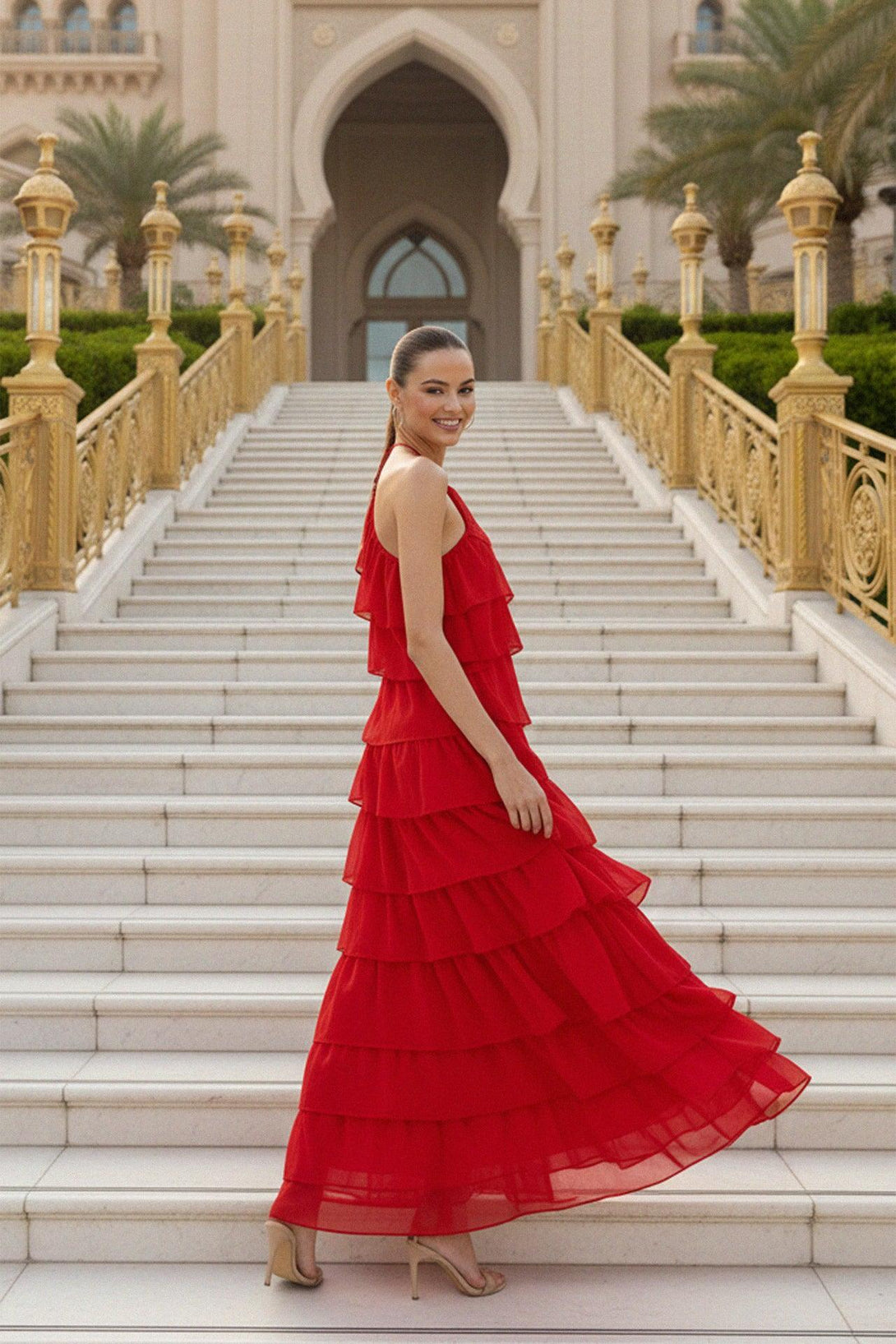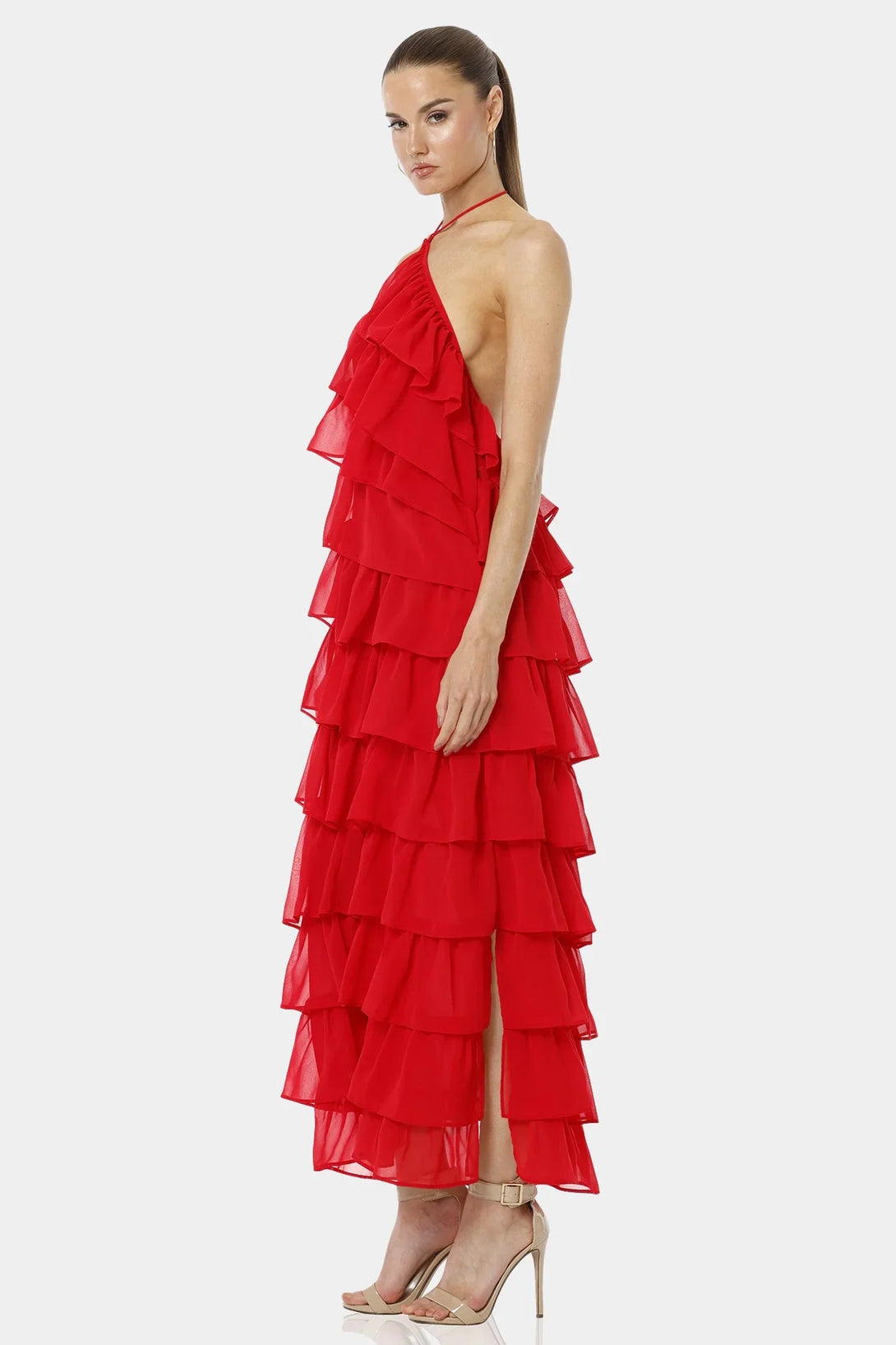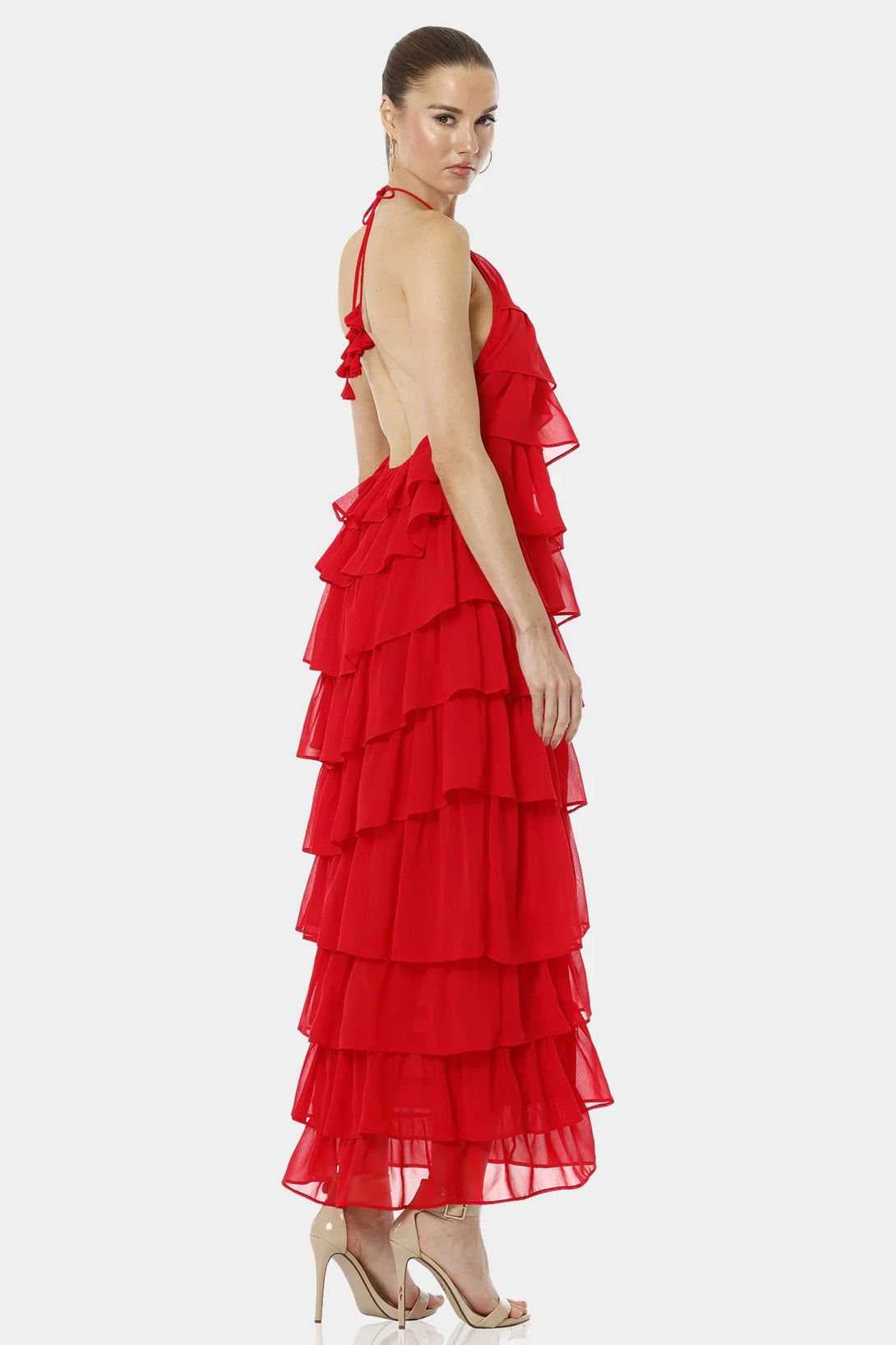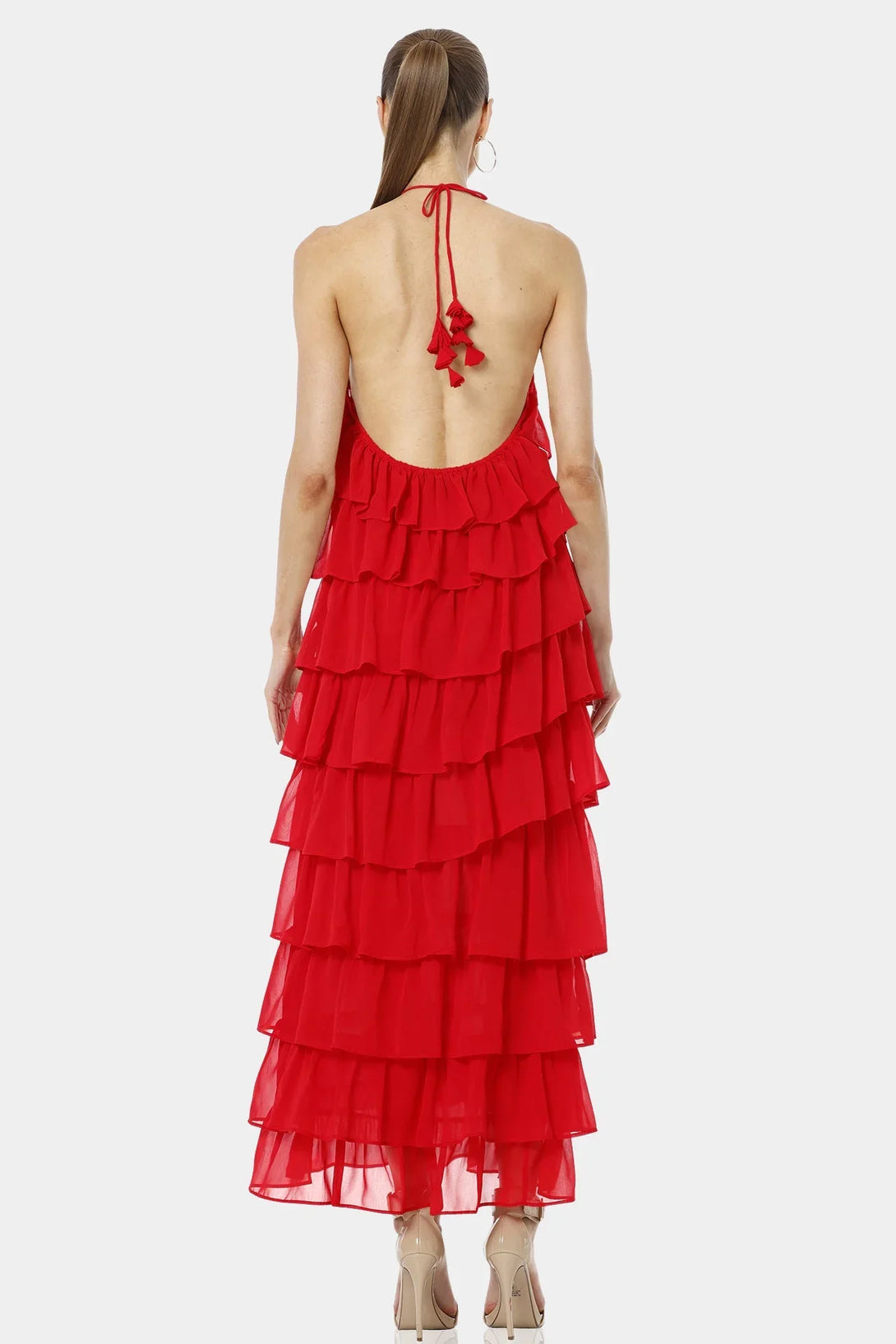 Atalanta Spicy Red Tiered Ruffle Dress With Halter Neckline