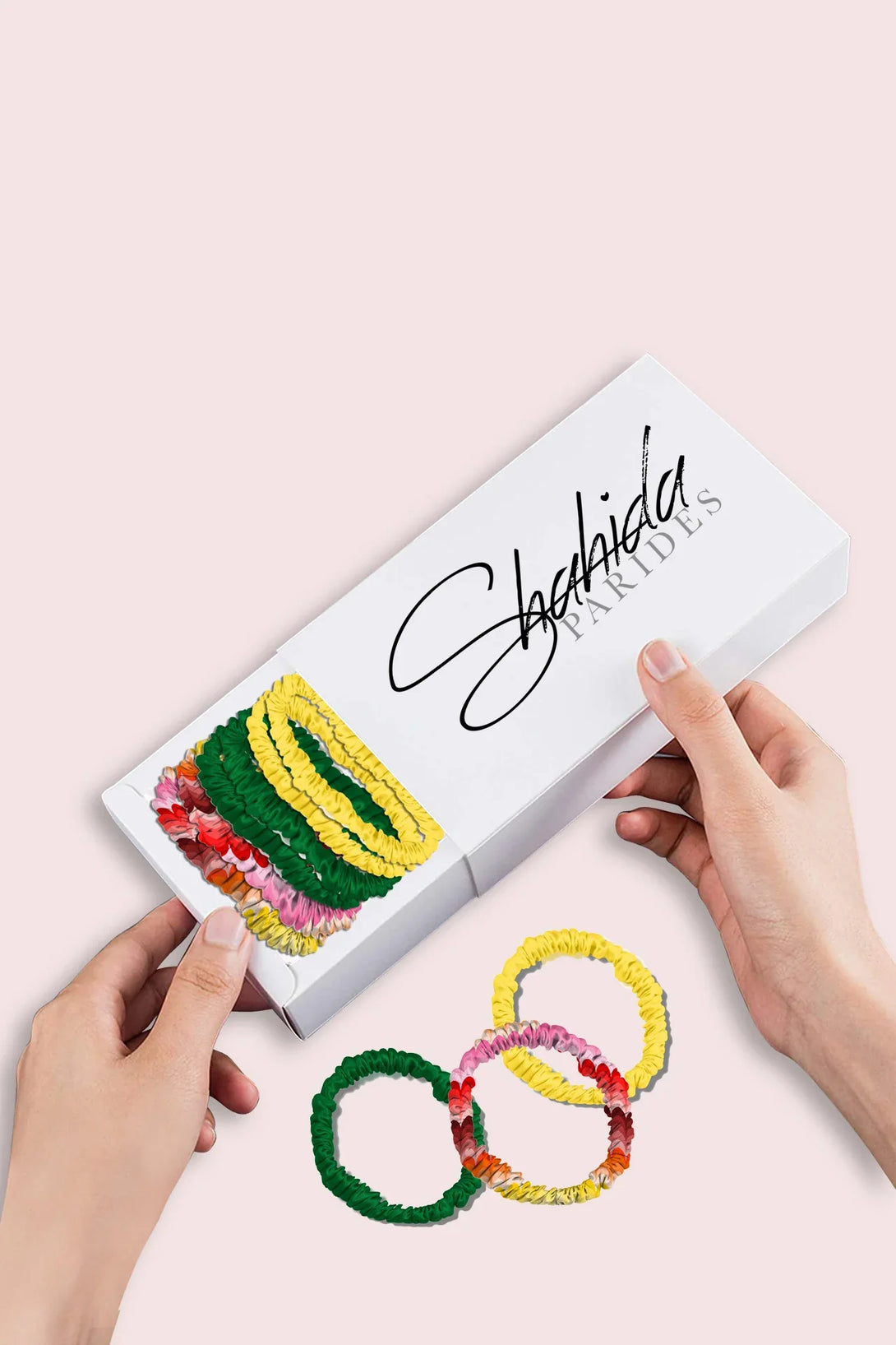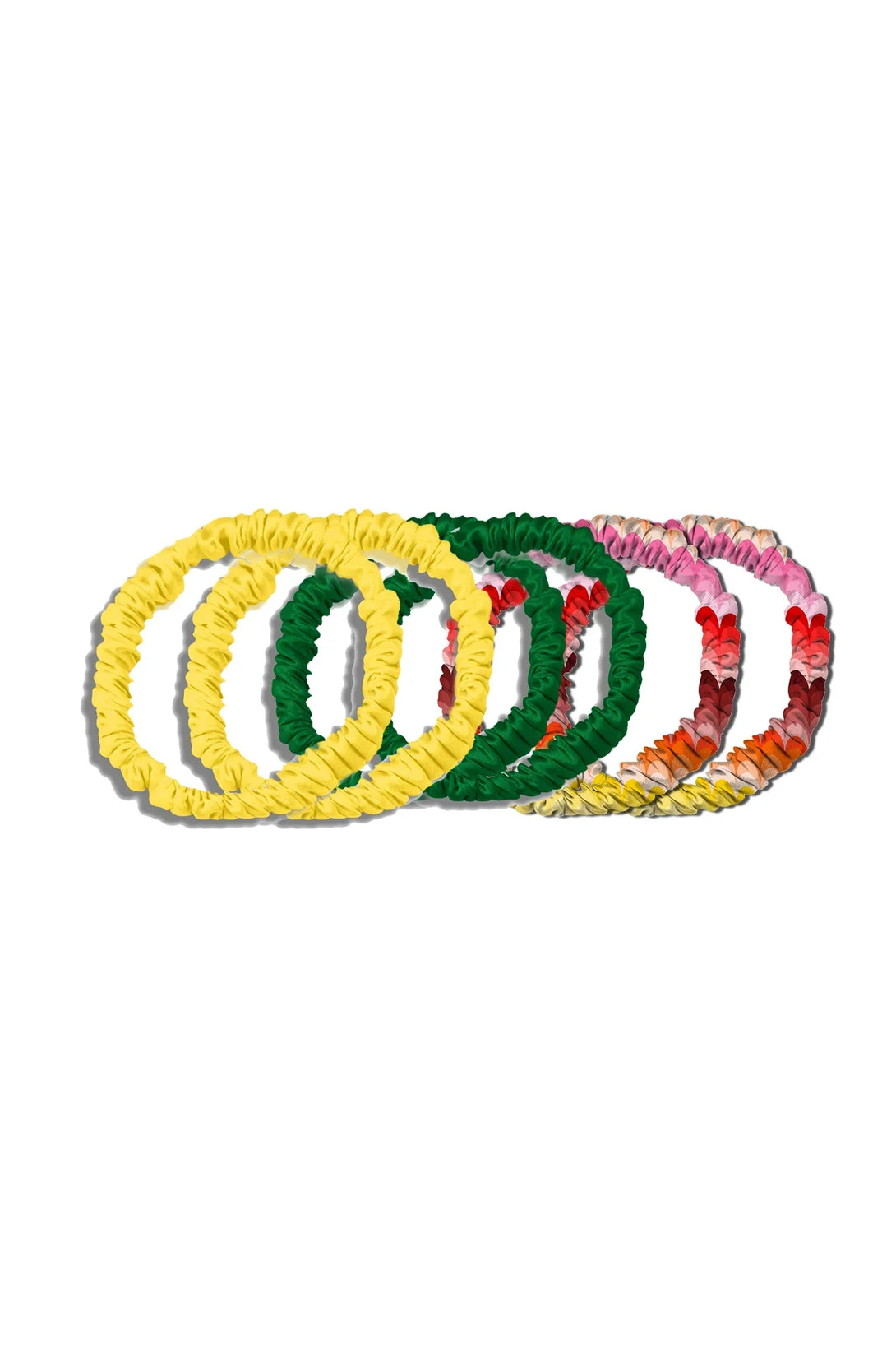 2 Small x Multicolor Print scrunchies. 2 Small x Green scrunchies, 2 Small x Yellow scrunchies