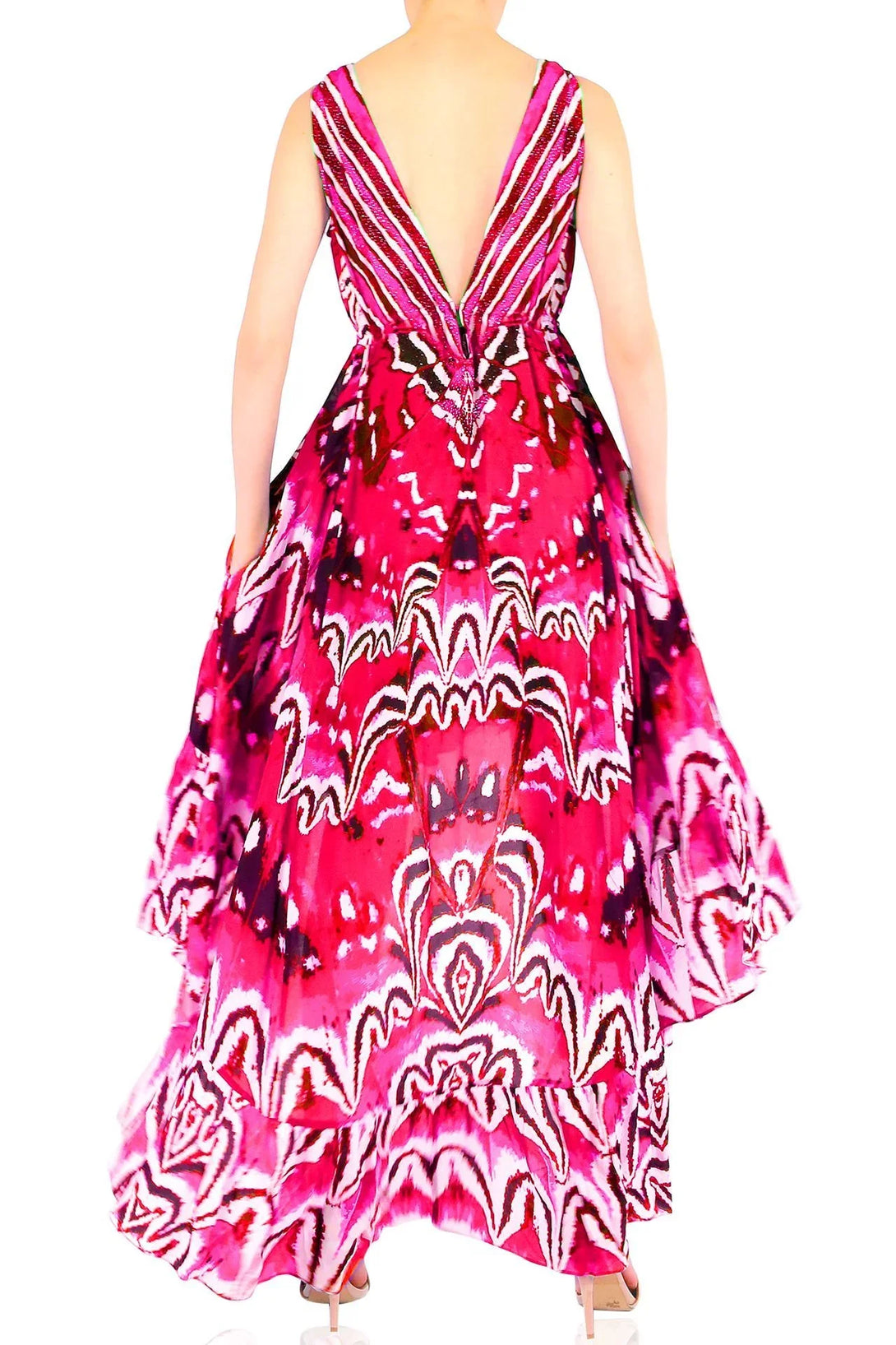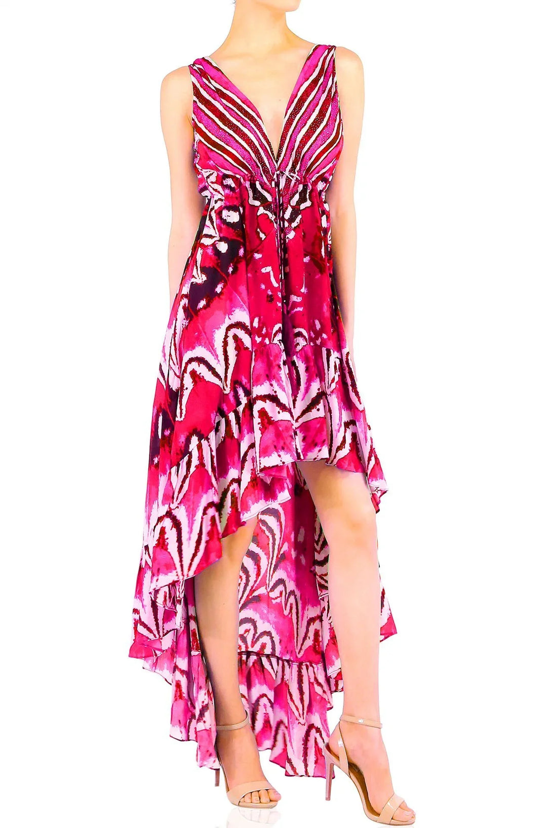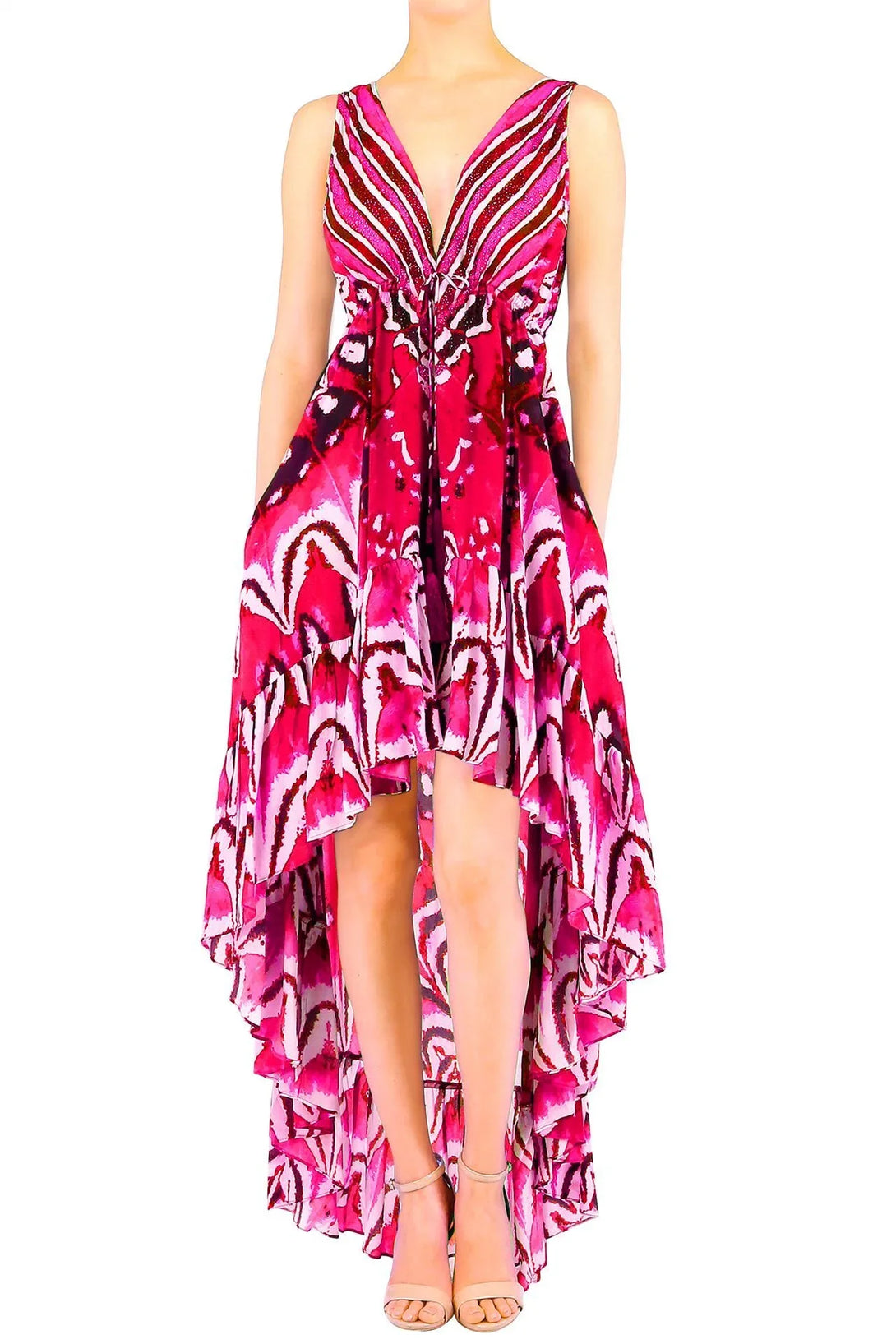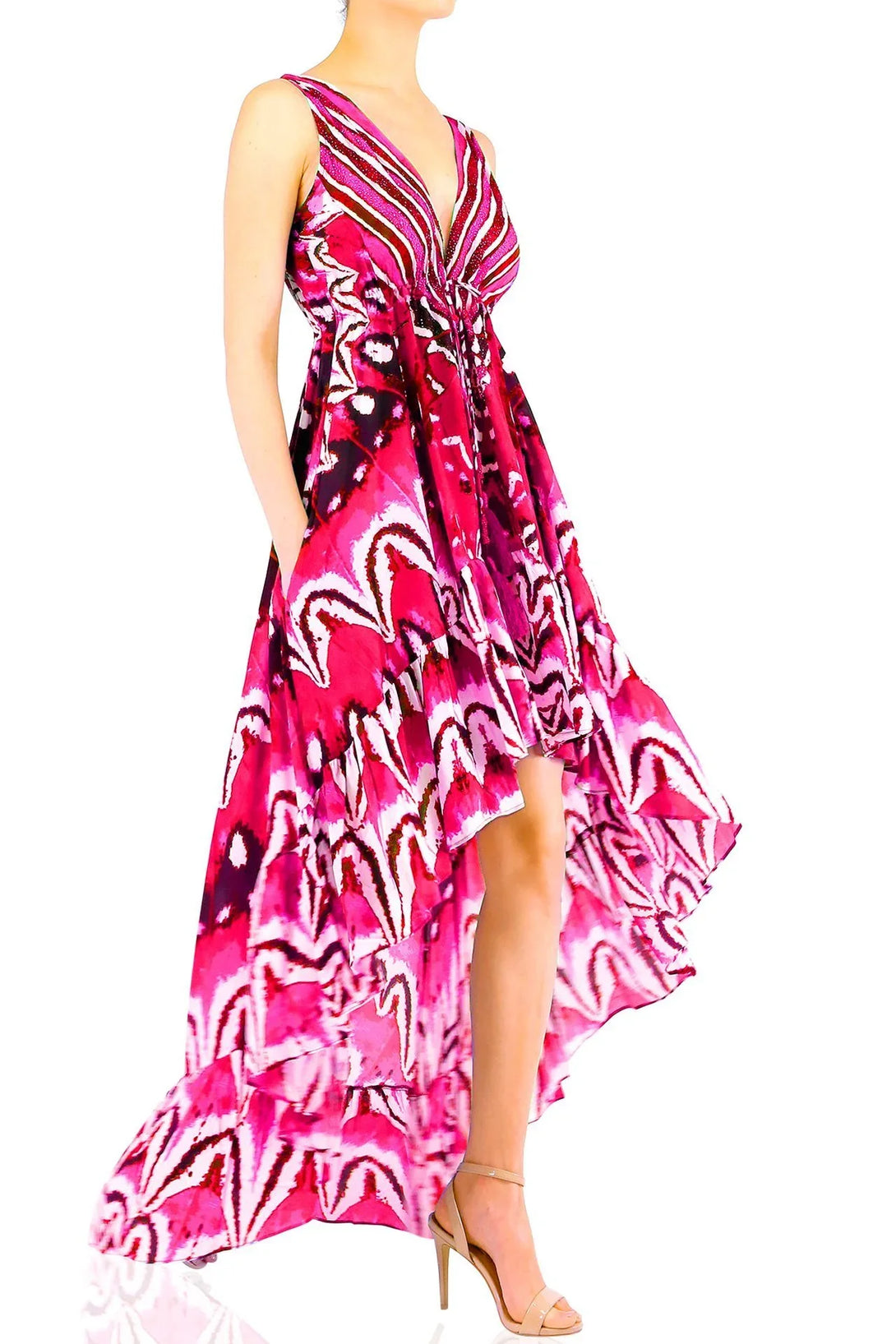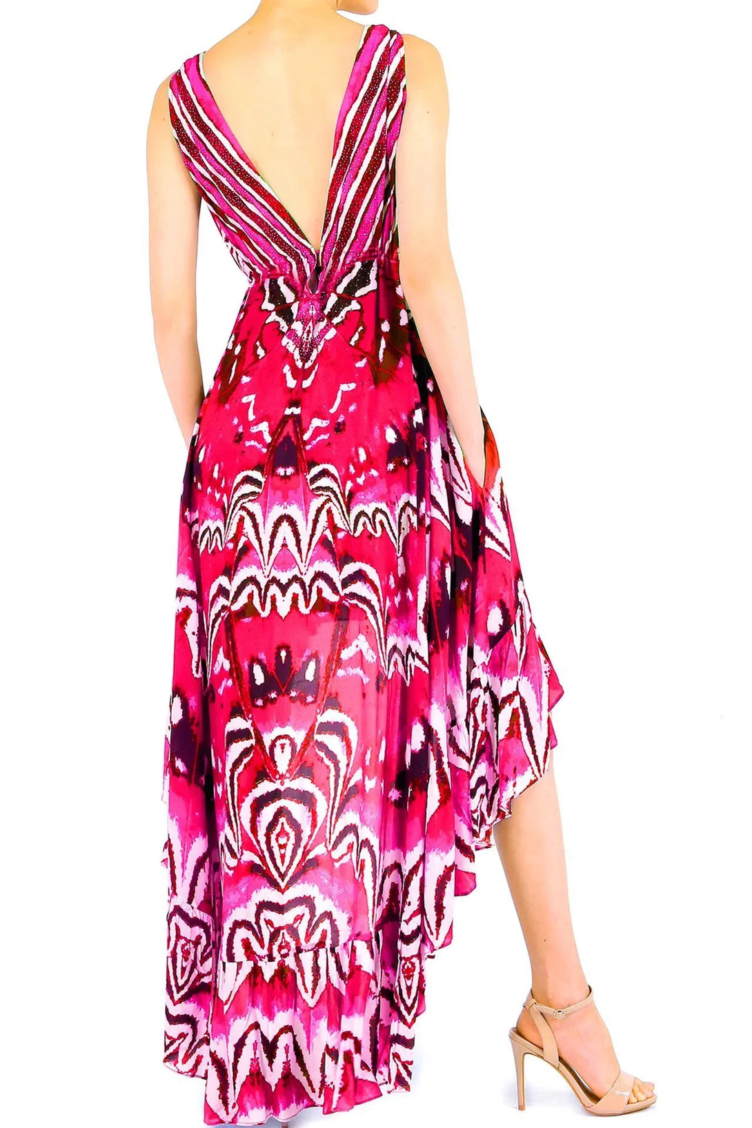 Make a dramatic entrance in a high/low maxi dress featuring vibrant, mixed prints for a boho-chic look.