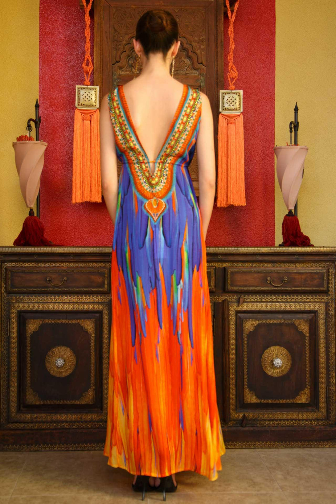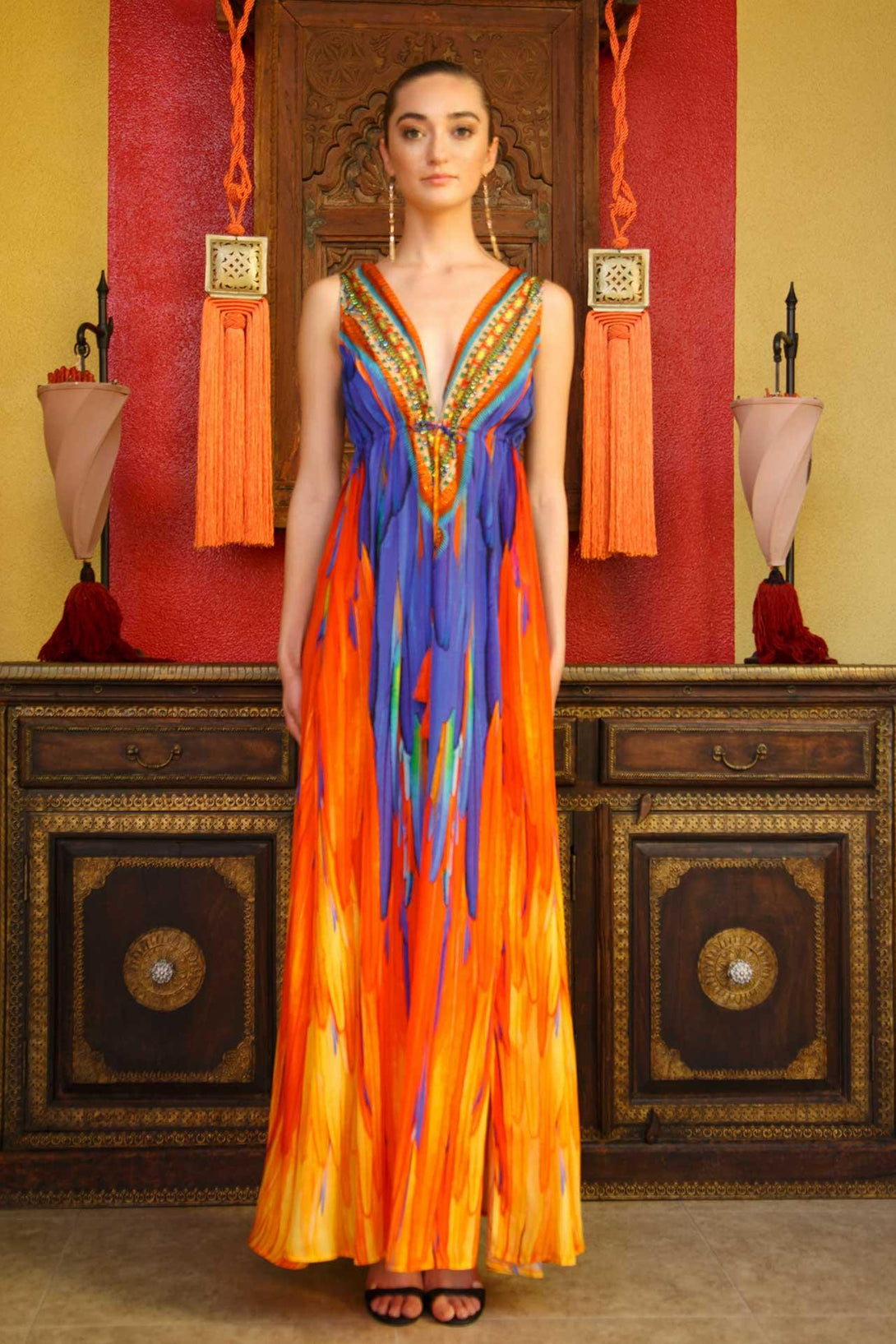 A vibrant printed that ignites the room. This, my dear, is the maxi dress of your dreams. Crafted from fabric that flows like liquid silk, it caresses your curves, creating a silhouette both elegant and alluring.