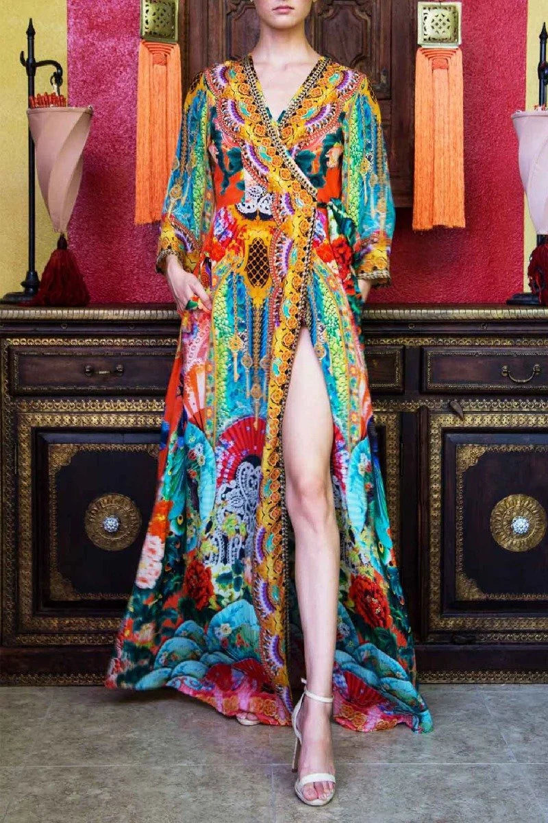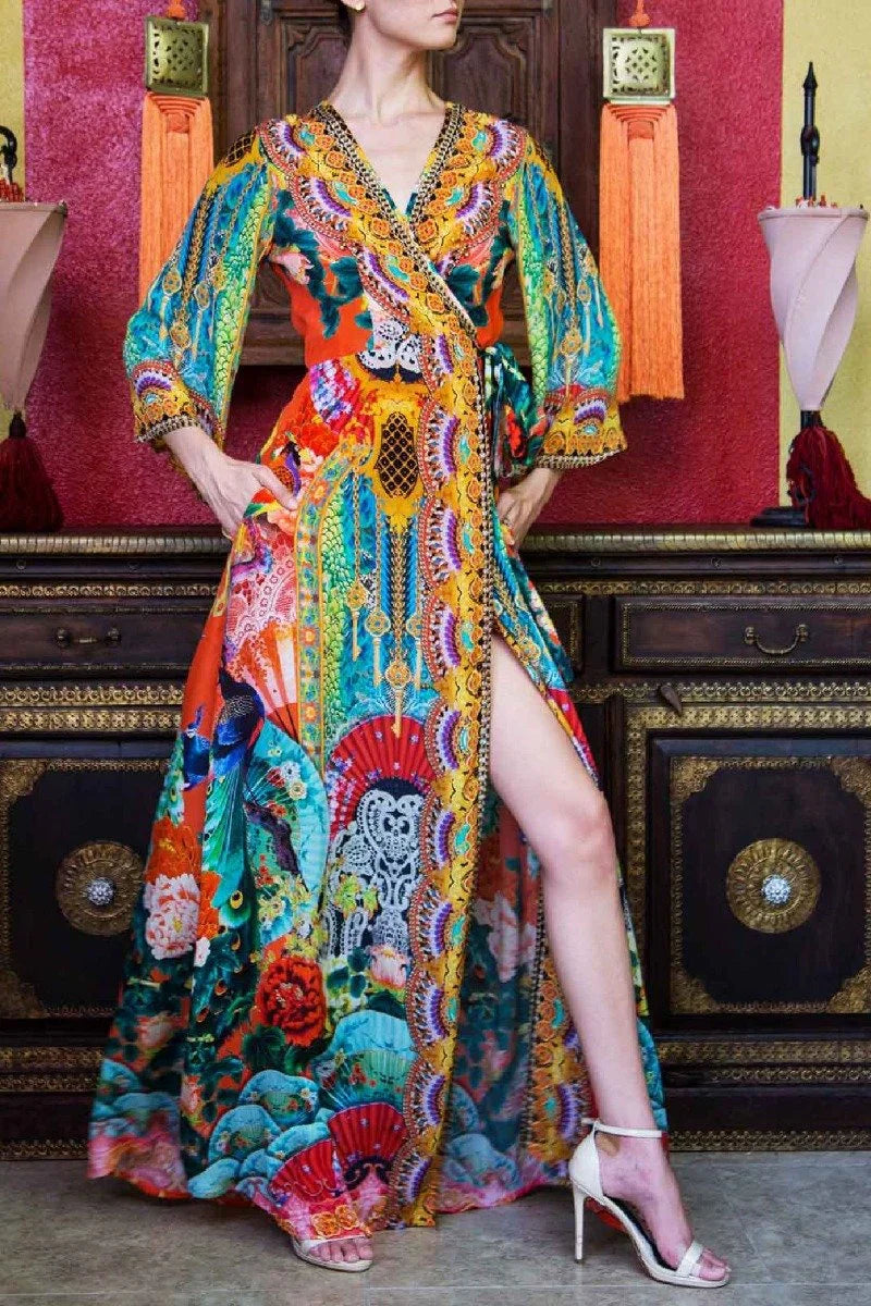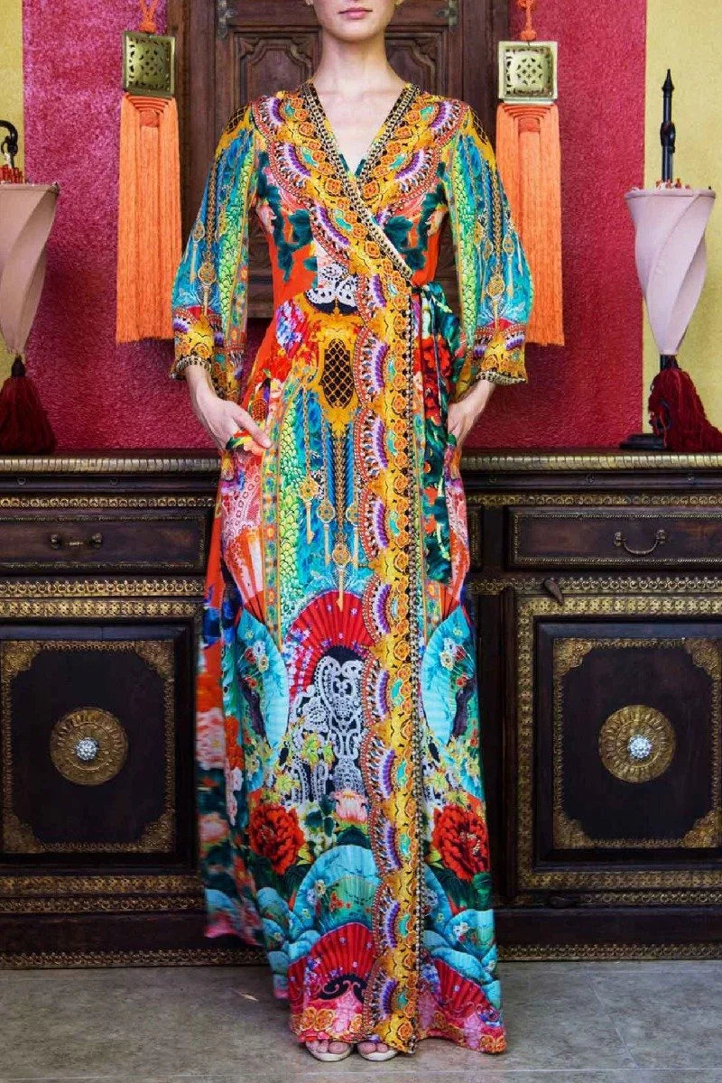 This isn't just a dress; it's an enigma draped in elegance. The long wrap maxi dress with long sleeves whispers of timeless romance and effortless mystery, inviting you to embrace your inner femme fatale, one flowing silhouette at a time.