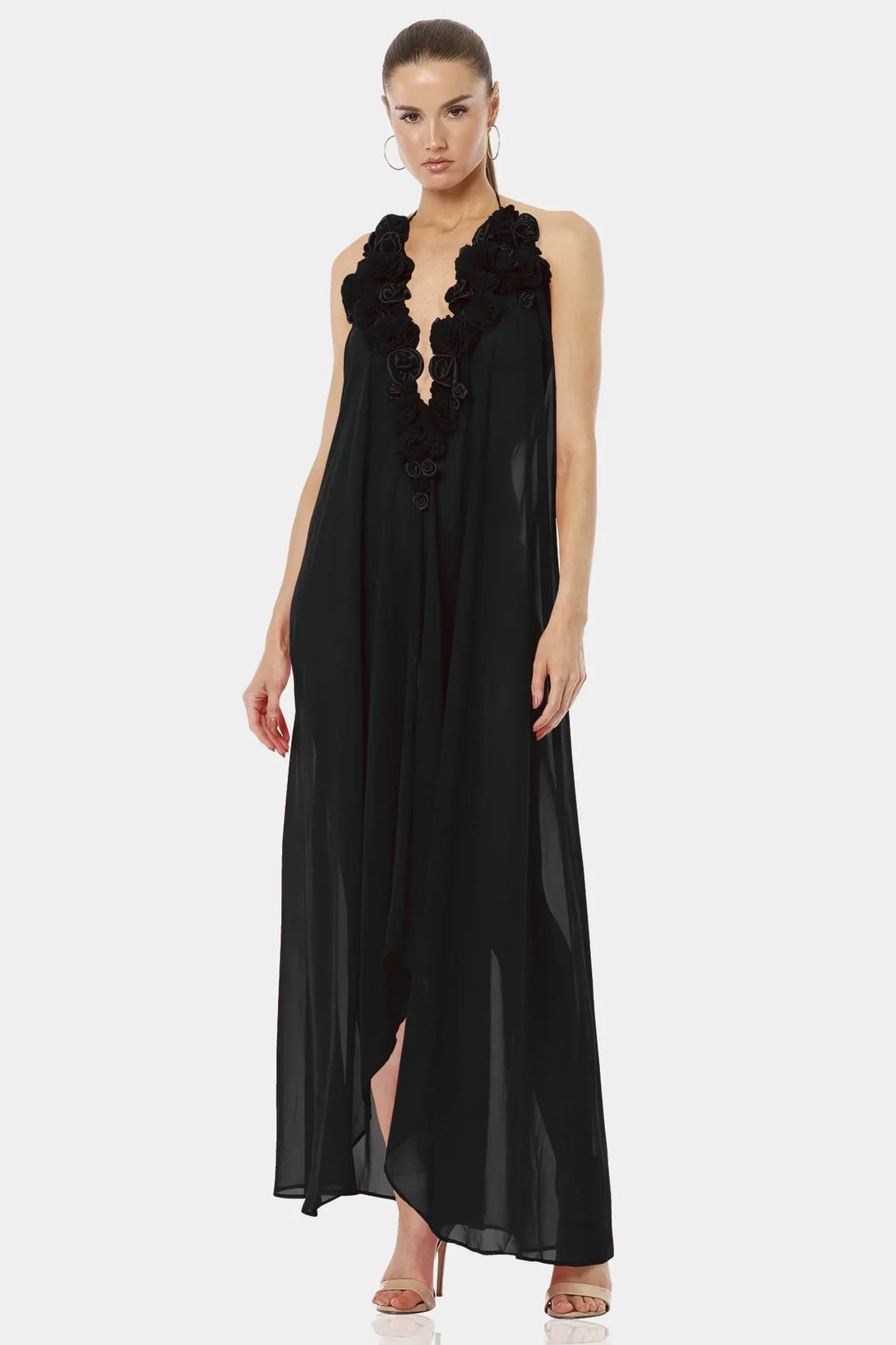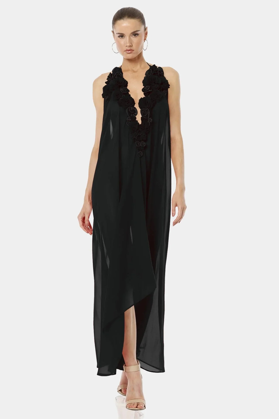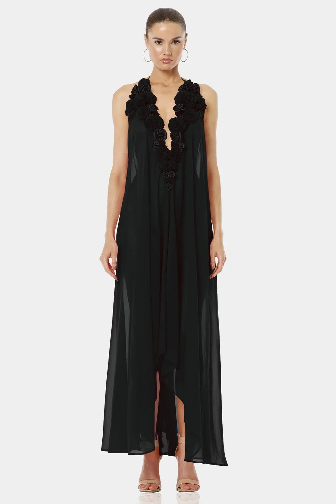 A well-chosen outfit can really say a lot about you, this dark black sheer maxi dress is embellished with 3D rose flowers which looks ultimate. Featuring a flowy maxi dress in a floor sweeping length, to complete the look wear statement earrings.