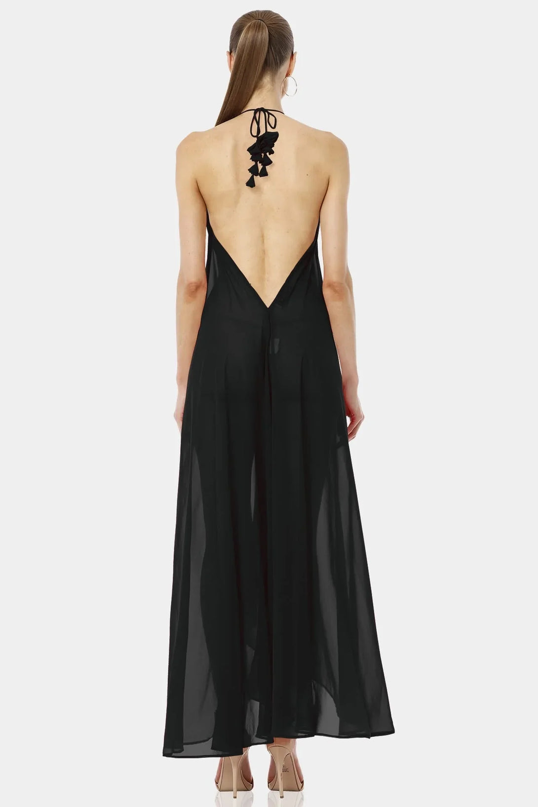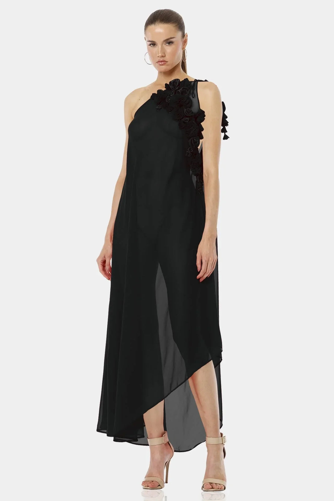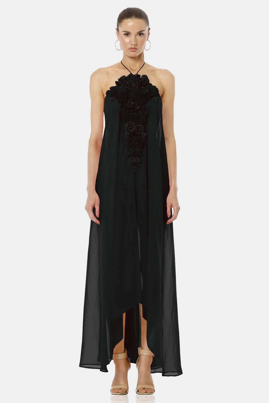 A well-chosen outfit can really say a lot about you, this dark black sheer maxi dress is embellished with 3D rose flowers which looks ultimate. Featuring a flowy maxi dress in a floor sweeping length, to complete the look wear statement earrings.