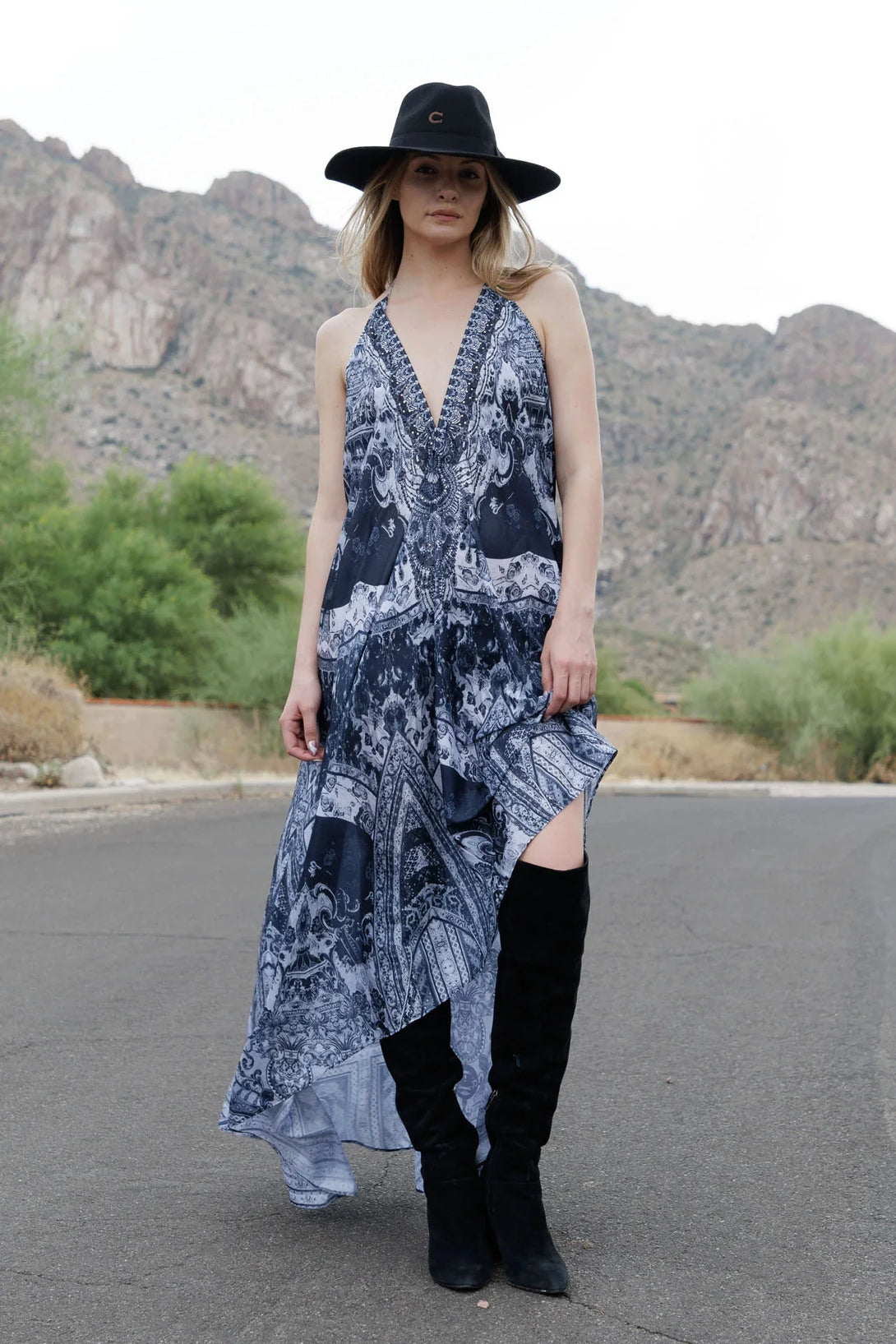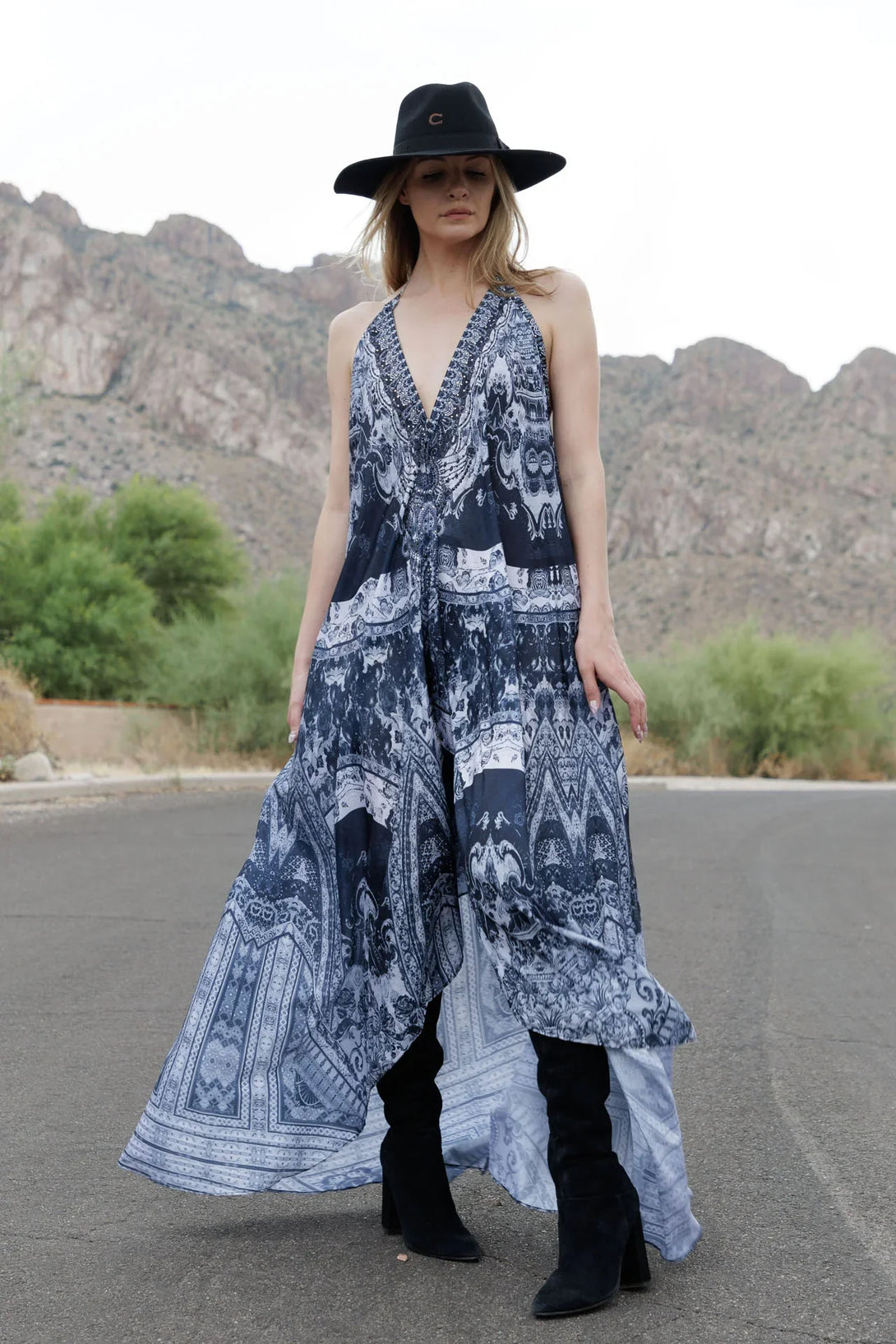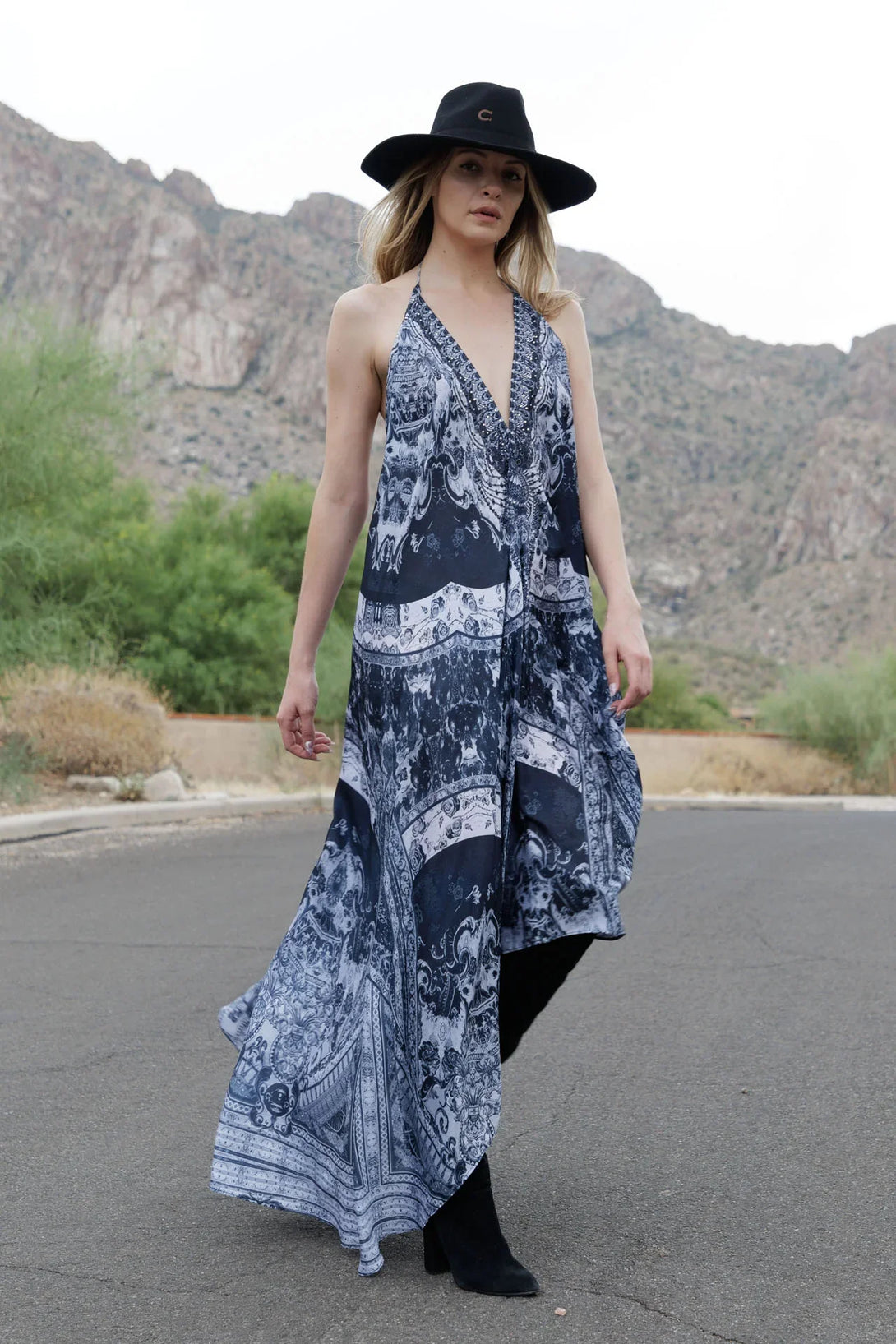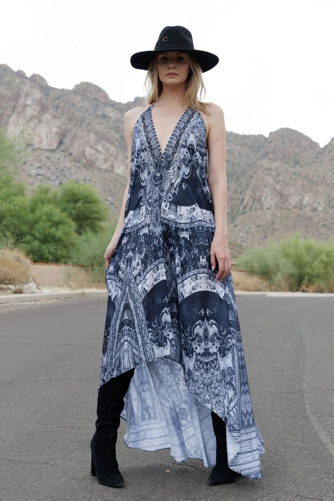 Elevate your looks with this printed maxi dress, which can be styled with with the high heels, a pair of earrings and open straight hairs, which is designed by Shahida Parides.