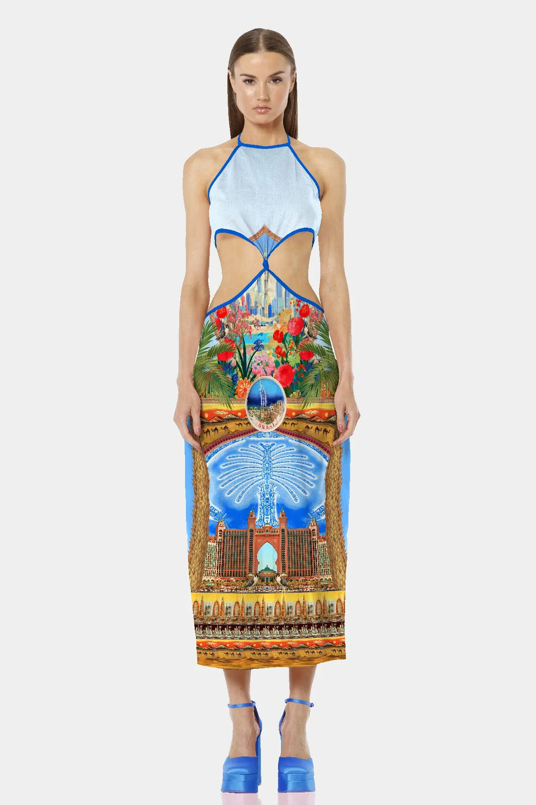Turn your outfit, from basic to occasion wear, just by carrying this with minimal accessories to partywear jewelry, high heels, a designer clutch or stylish hairstyle, where this dress features front halter neckline, cut out maxi dress, sleeveless dress, and long dress with designer back and style, designed by Shahida Parides.