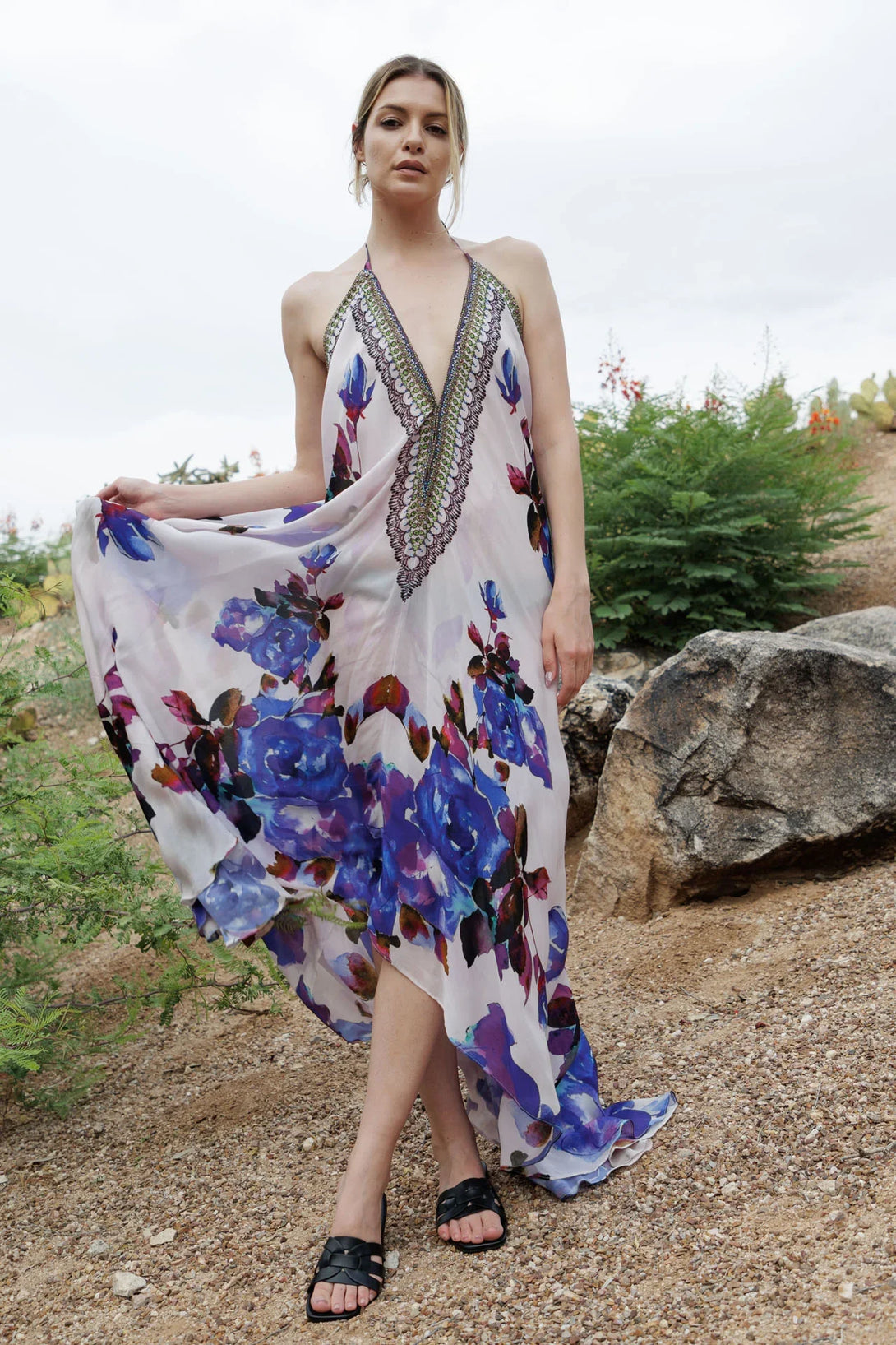 This designer maxi dress, with multi way dress, style which can be styled in 3 ways, like halter neck, one shoulder, and off shoulder, where its floral print add a touch of elegance into your outfit, which is designed by Shahida Parides.