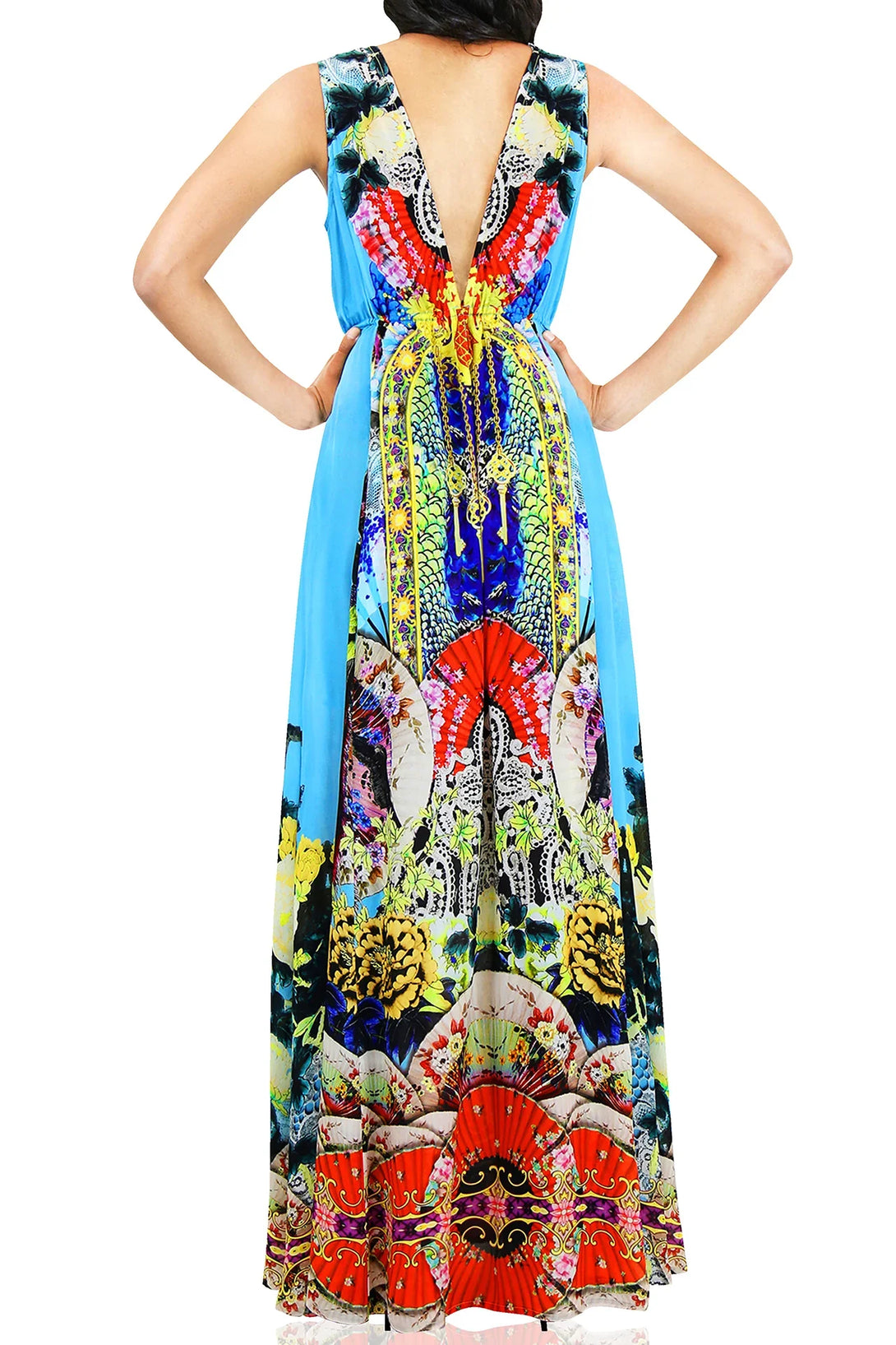A vibrant printed that ignites the room. This, my dear, is the maxi dress of your dreams. Crafted from fabric that flows like liquid silk, it caresses your curves, creating a silhouette both elegant and alluring.