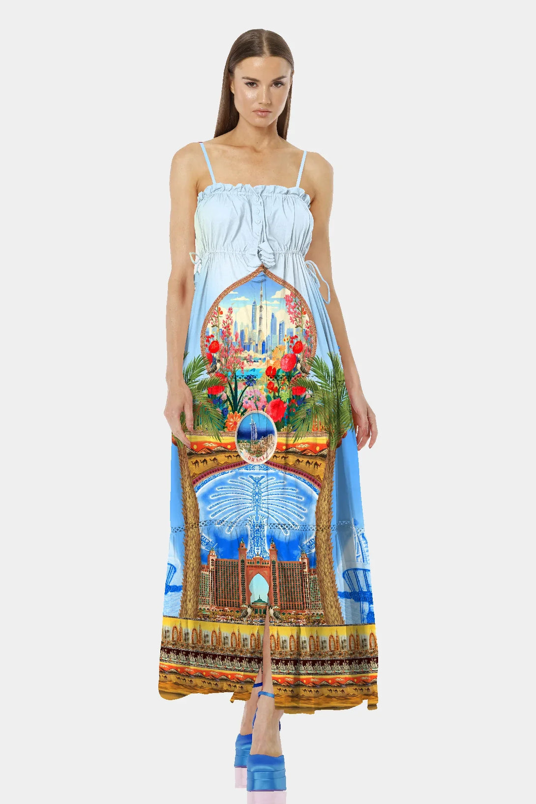 Turn your outfit, from basic to occasion wear, just by carrying this with minimal accessories to partywear jewelry, high heels, a designer clutch or stylish hairstyle, where this dress features square neckline, sleeveless dress, and long tiered dress, designed by Shahida Parides.