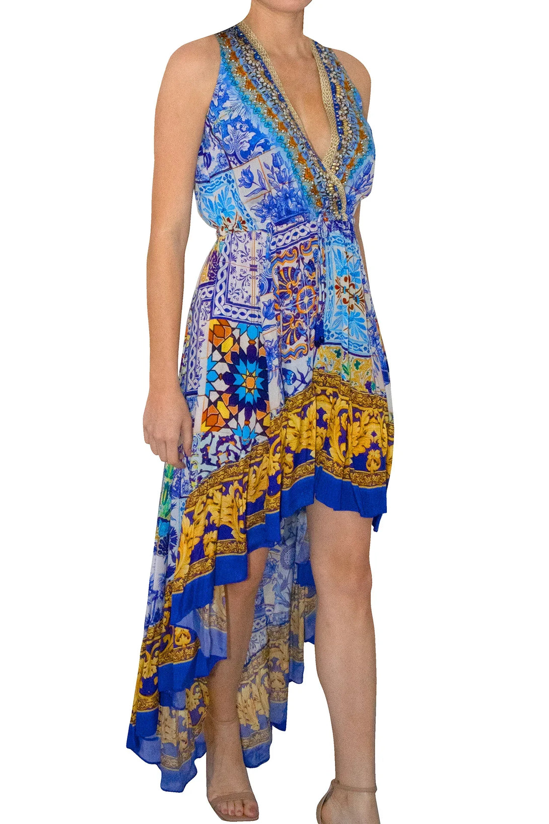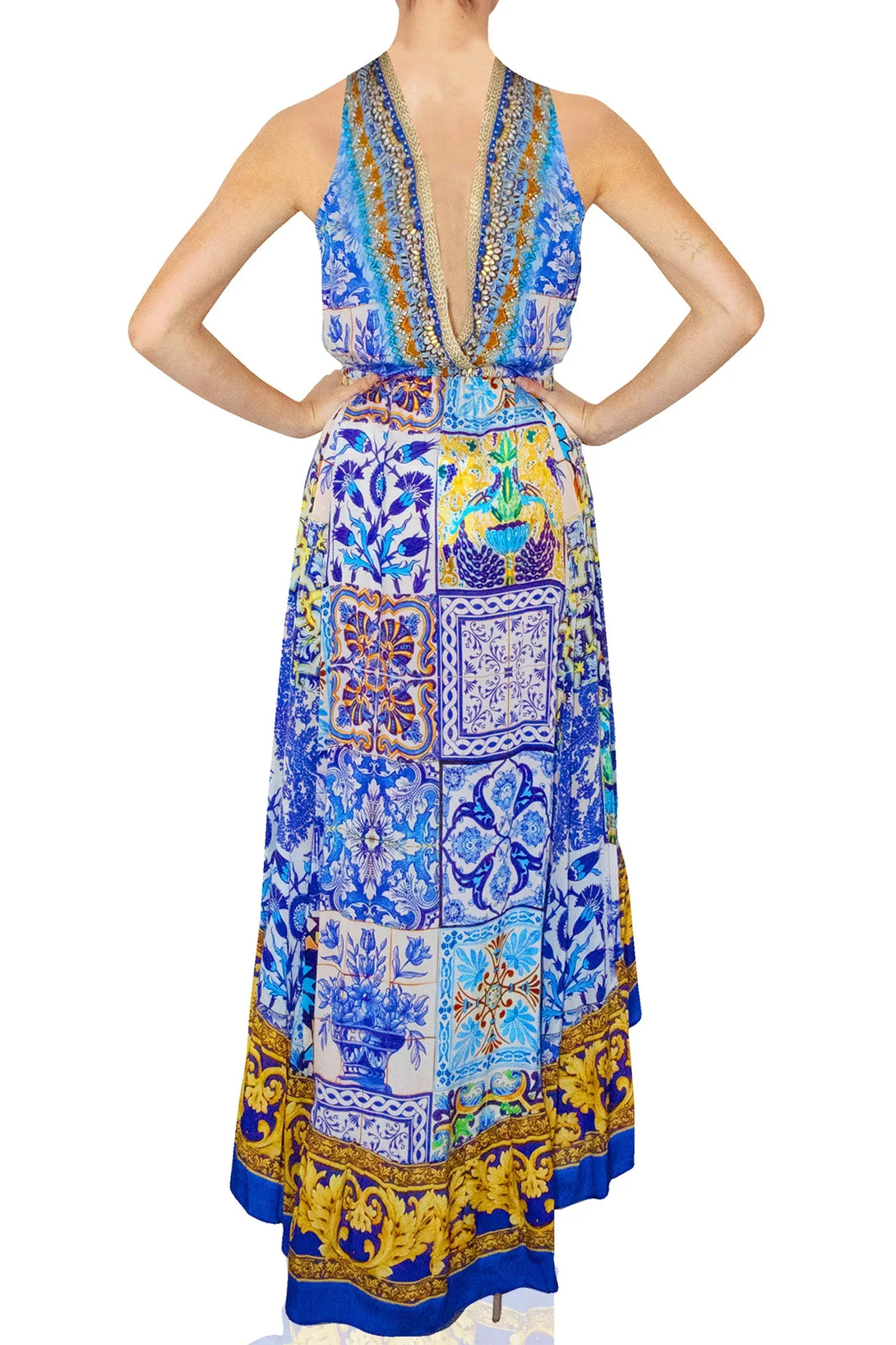 Make a dramatic entrance in a high/low maxi dress featuring vibrant, mixed prints for a boho-chic look.