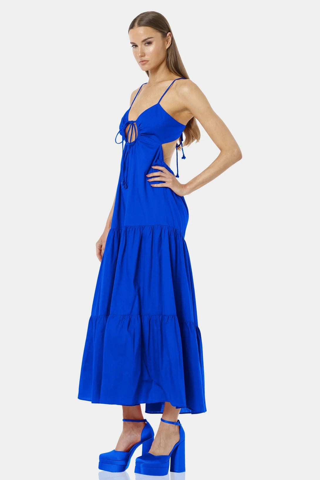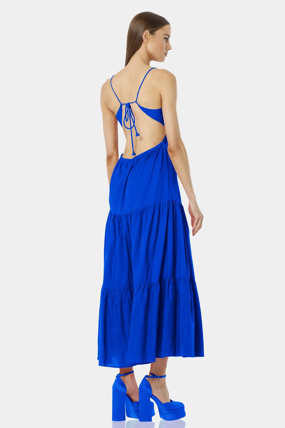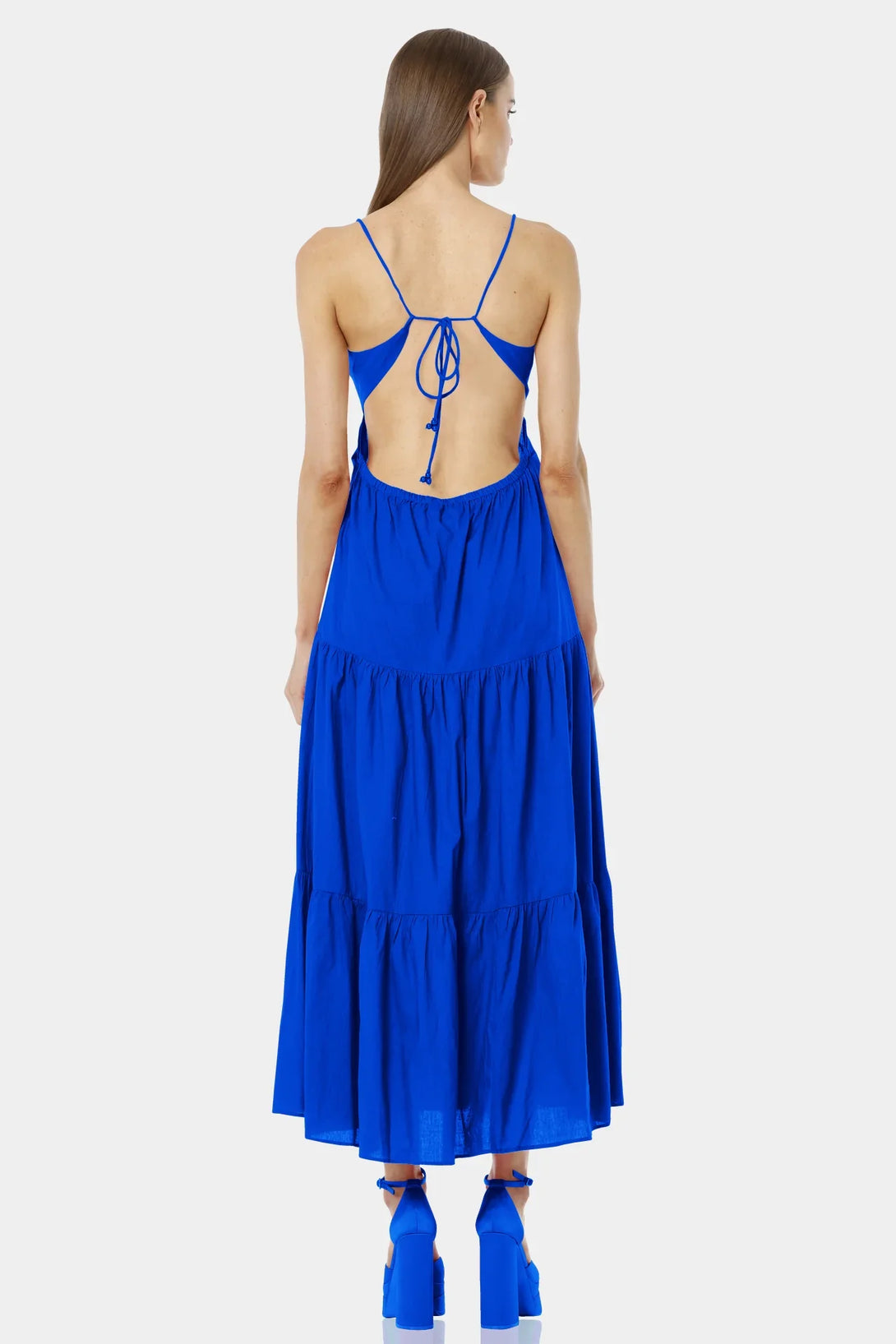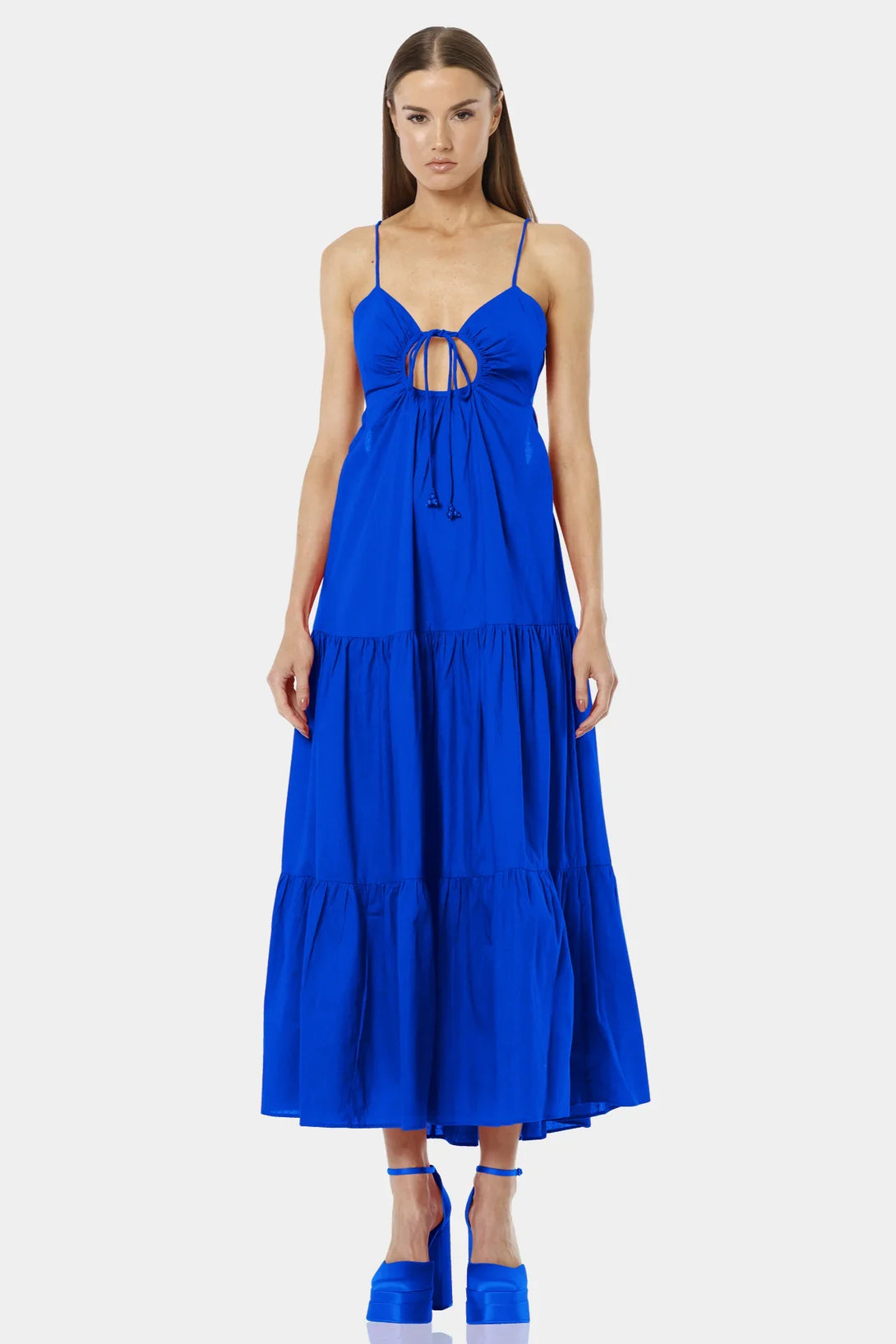 Turn your outfit, from basic to occasion wear, just by carrying this with minimal accessories to partywear jewelry, high heels, a designer clutch or stylish hairstyle, where this dress features sweetheart tie-up neck, sleeveless dress, and long tiered dress, designed by Shahida Parides.