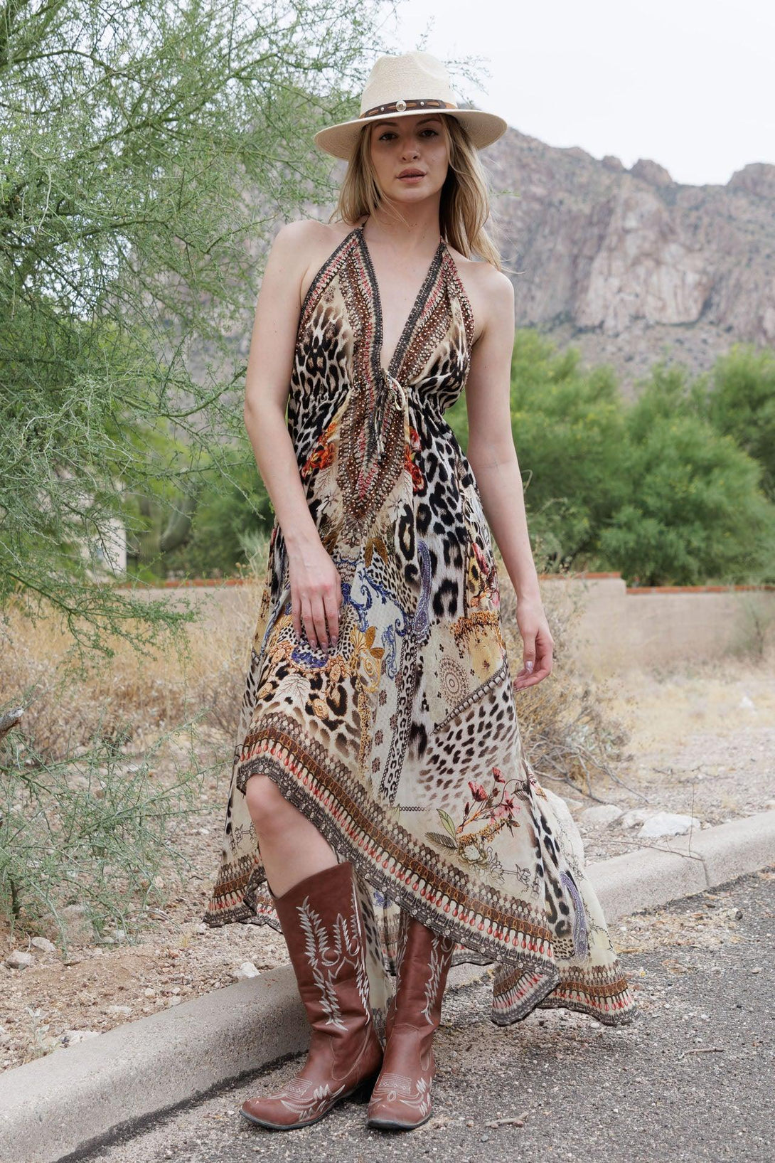 Elevate your looks with this boho maxi dress, which can be styled with with the high heels, a pair of earrings and open straight hairs, which is designed by Shahida Parides.