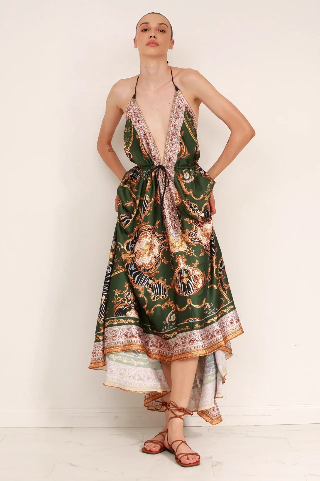 This long dress, with multiway dress style which can be styled in 3 ways, like one shoulder, halter neck, and off shoulder, where its print add a touch of elegance into your outfit, which is designed by Shahida Parides.