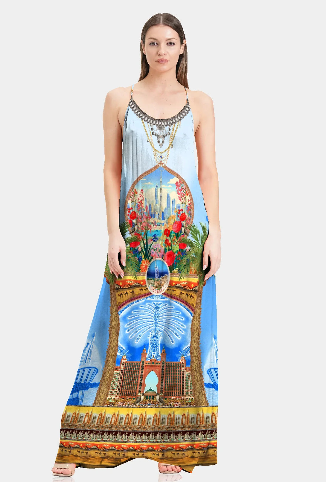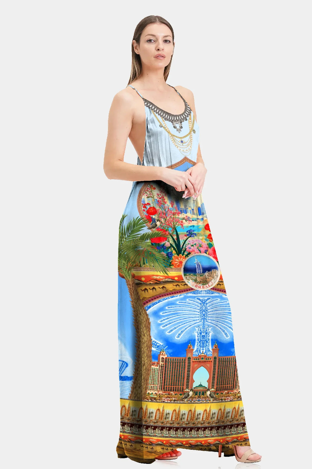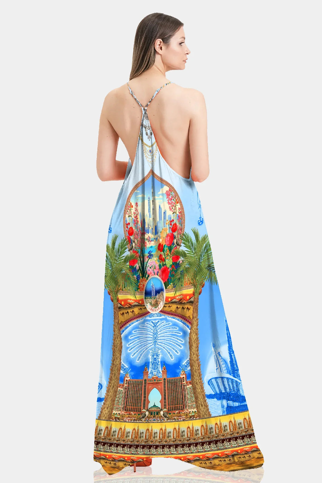 Embrace your femininity in this long summer dresses, where designer backless maxi dress gently accentuates your back and shoulders, creating a look that's both flattering and effortlessly charming, available at Shahida Parides.