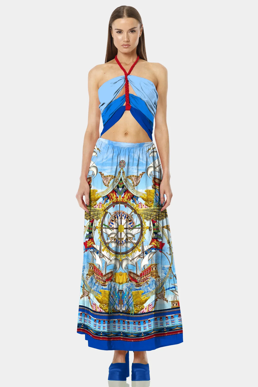 Turn your outfit, from basic to occasion wear, just by carrying this with minimal accessories to stylish jewelry, where this dress features front halter neckline, cut out maxi dress with middle braided, sleeveless & backless dress style, designed by Shahida Parides.