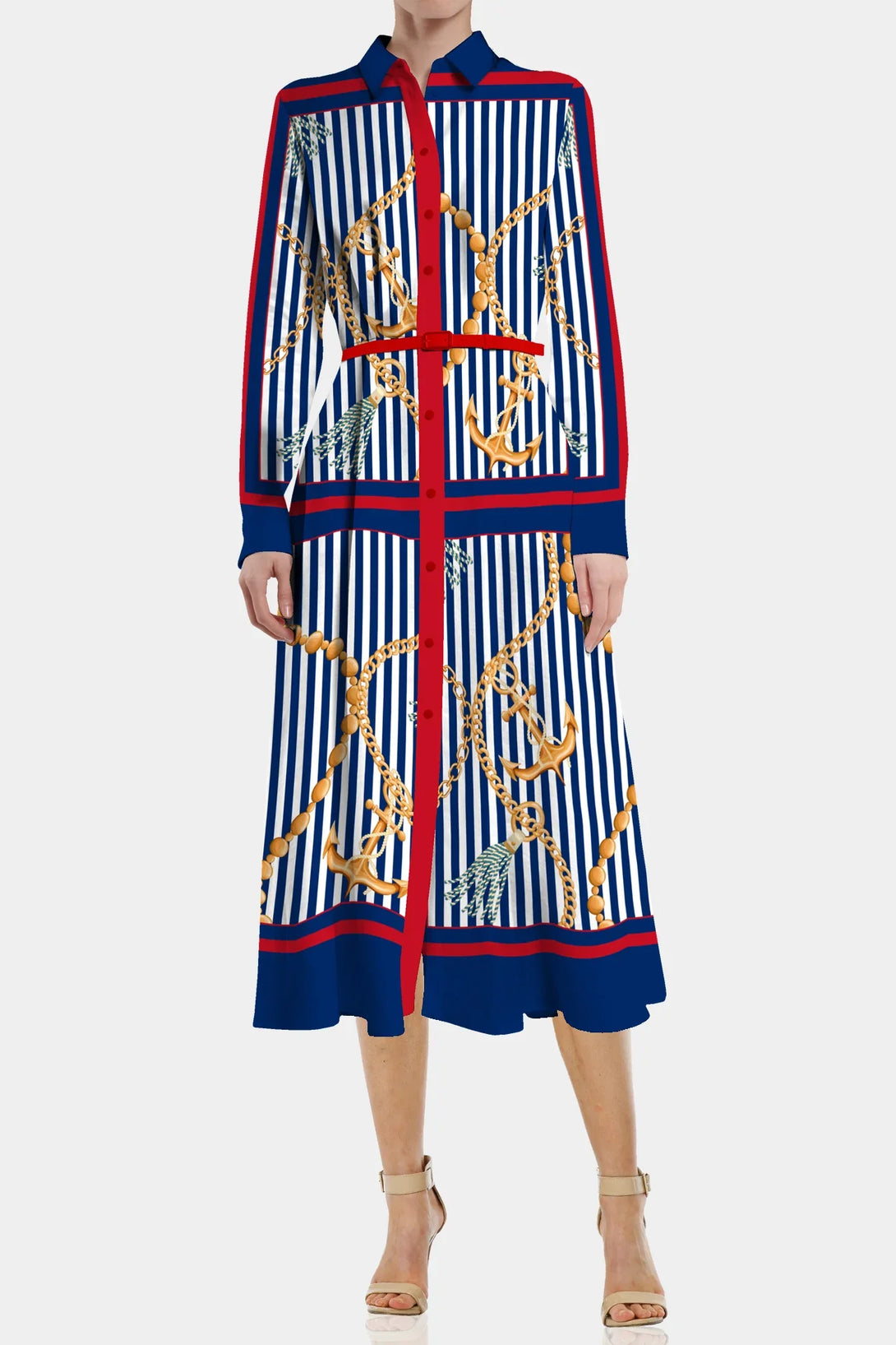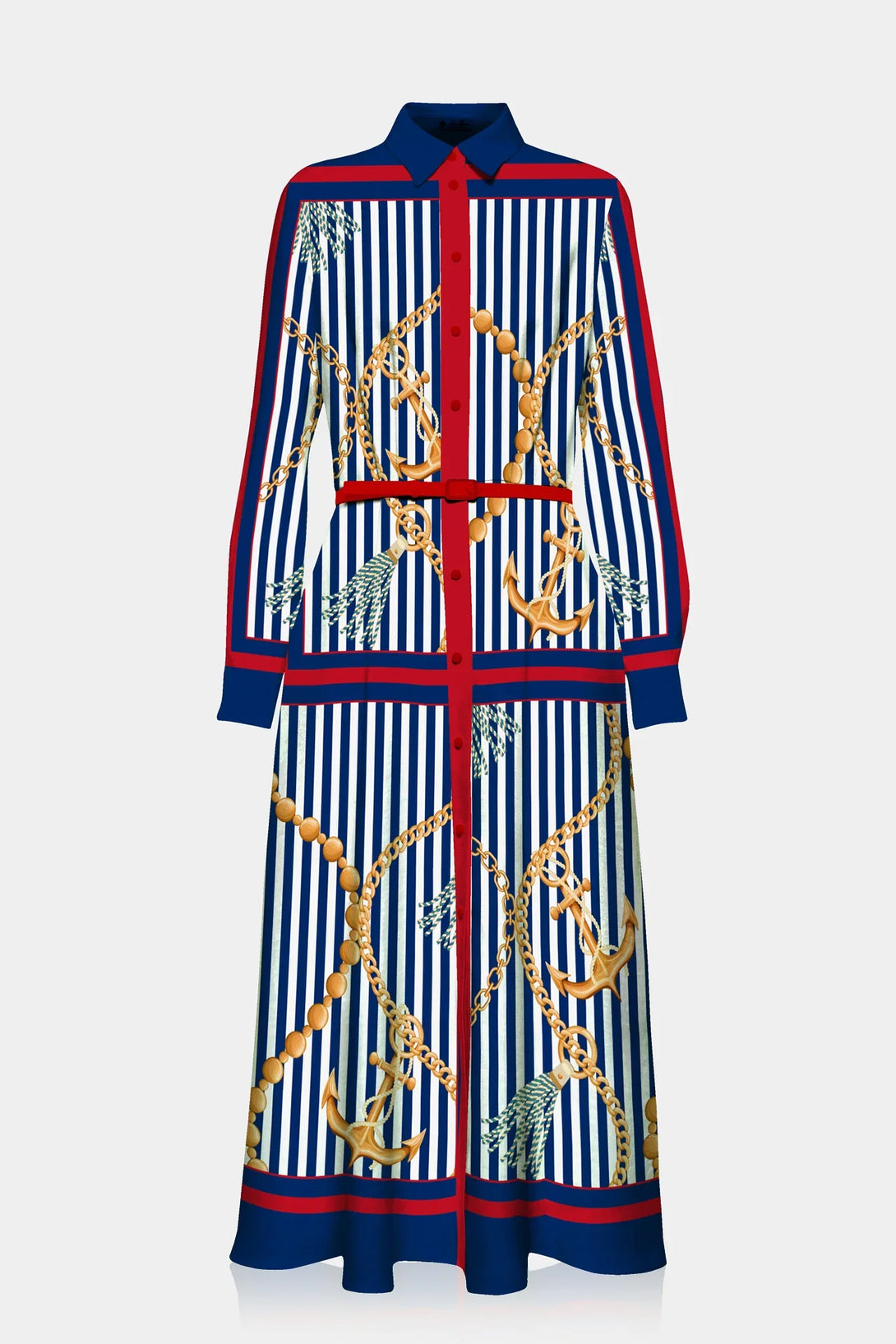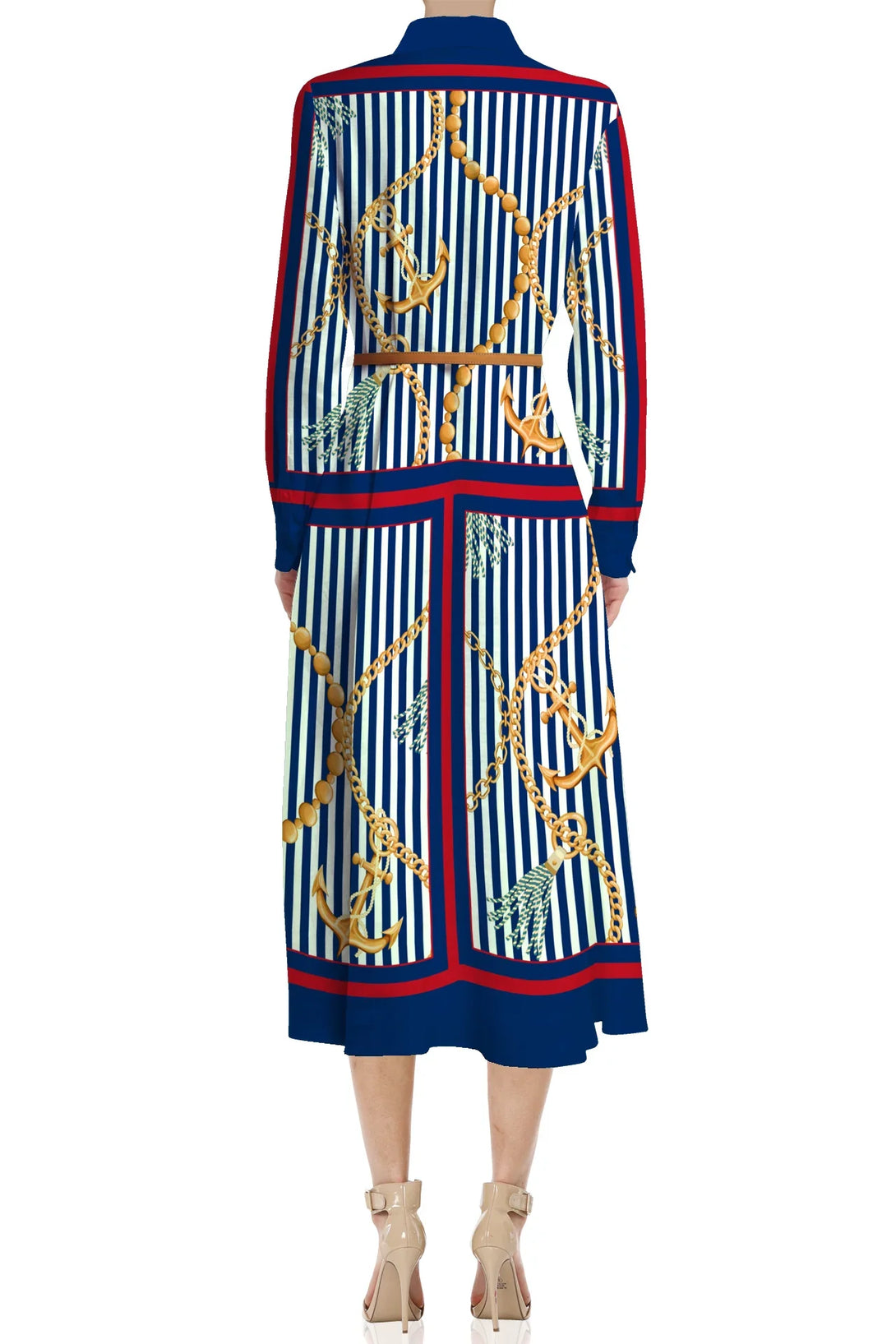 Explore Nautical Stripes collections which features collared neckline, in vertical stripes print, belted waist and long sleeve style, of midi shirt dress designed by Shahida Parides.