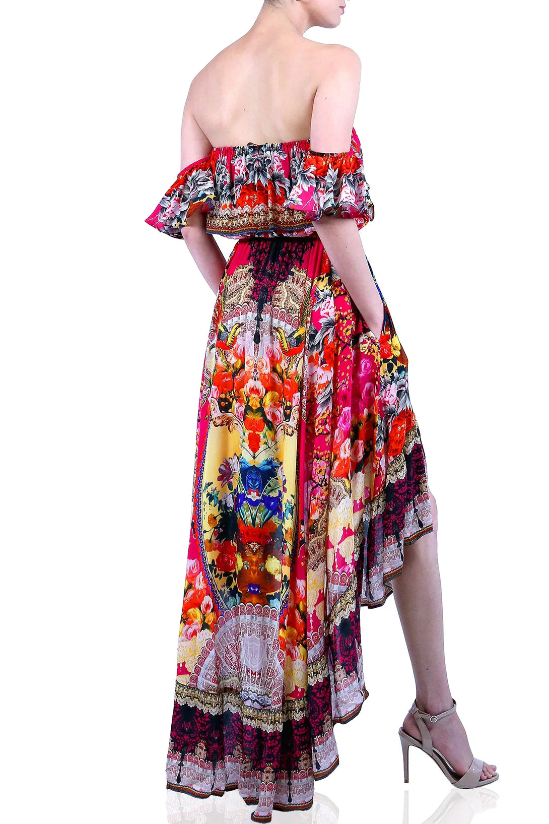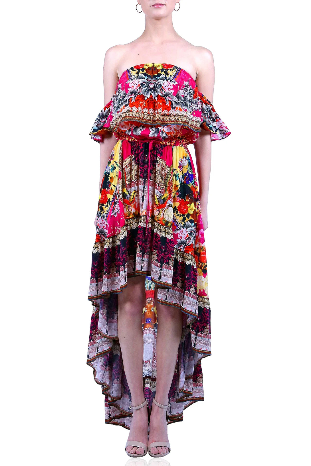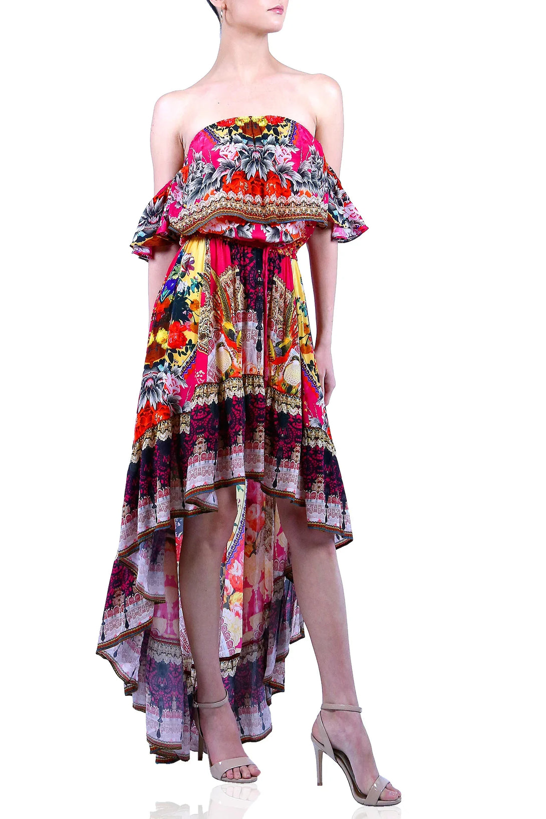 The neckline gently drapes off one shoulder, showcasing a hint of skin and framing your collarbone. Cascading ruffles add a touch of playful femininity that flows down the length of the dress.