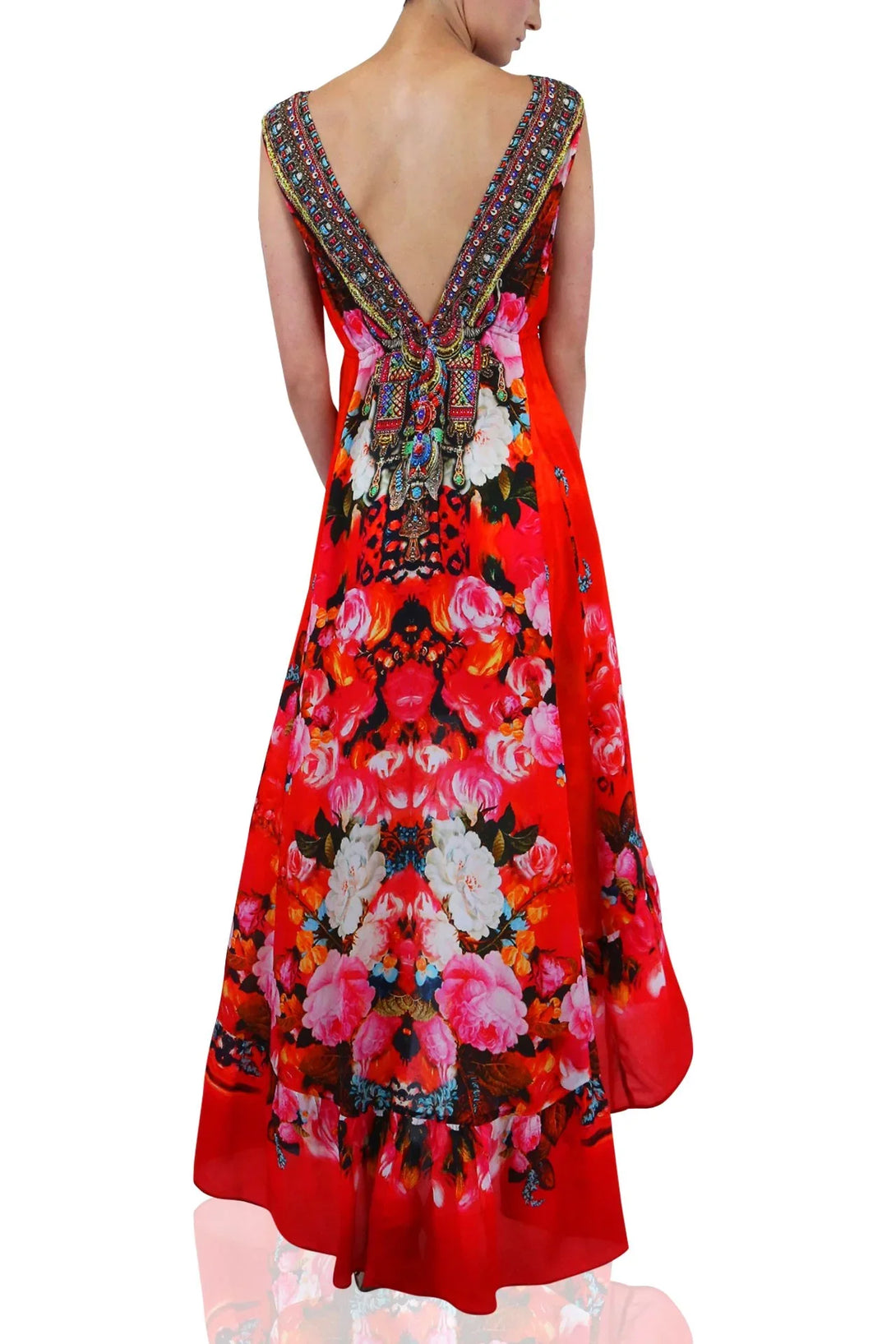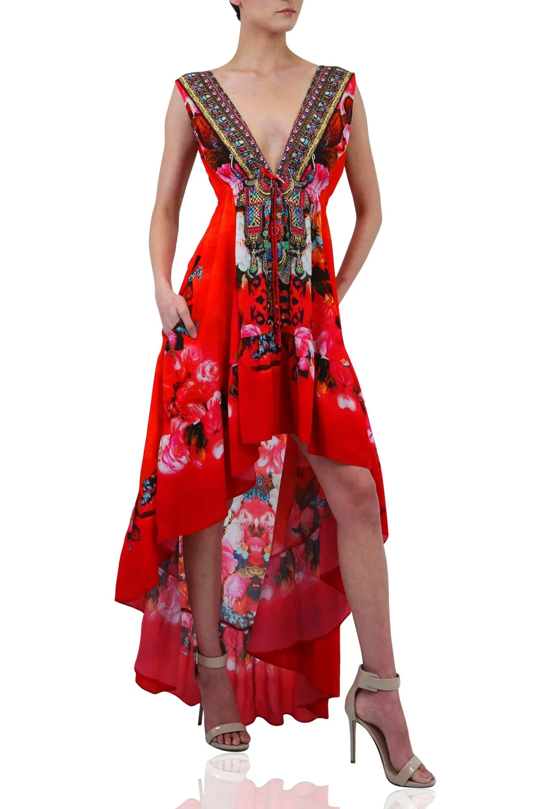 A vibrant printed that ignites the room. This, my dear, is the maxi dress of your dreams. Crafted from fabric that flows like liquid silk, it caresses your curves, creating a silhouette both elegant and alluring.