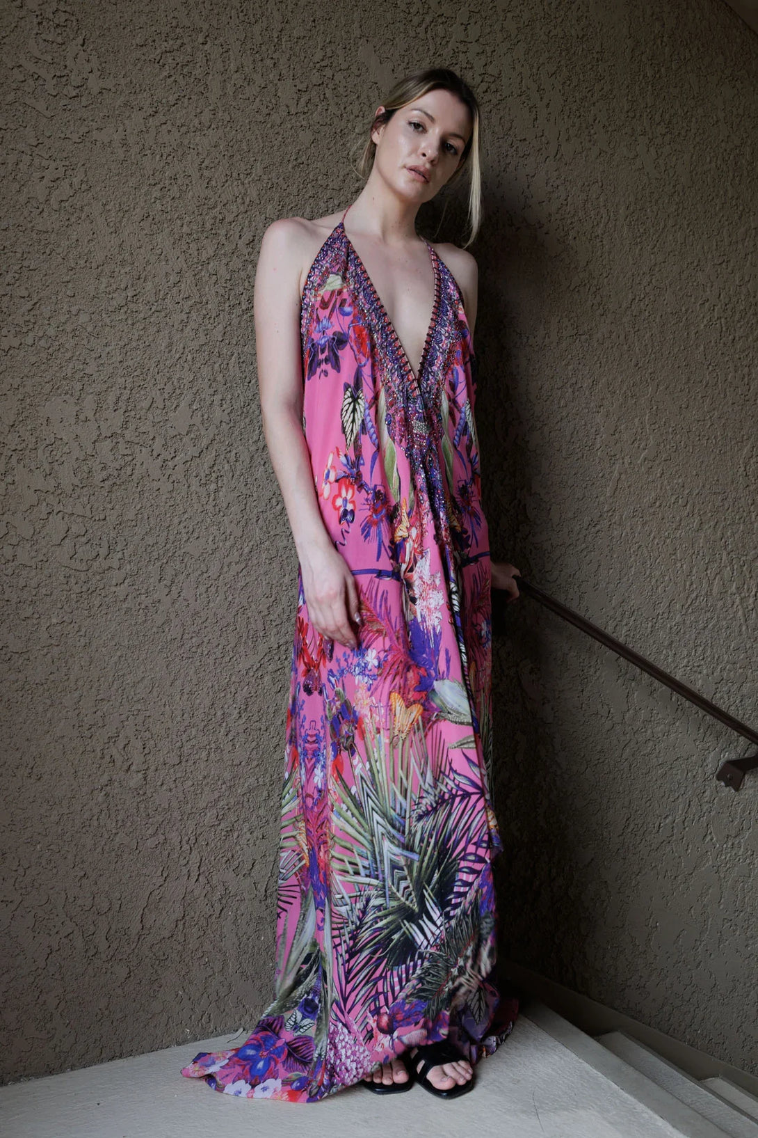 Elevate your looks with this printed maxi dress, which can be styled with with the high heels, a pair of earrings and open straight hairs, which is designed by Shahida Parides.