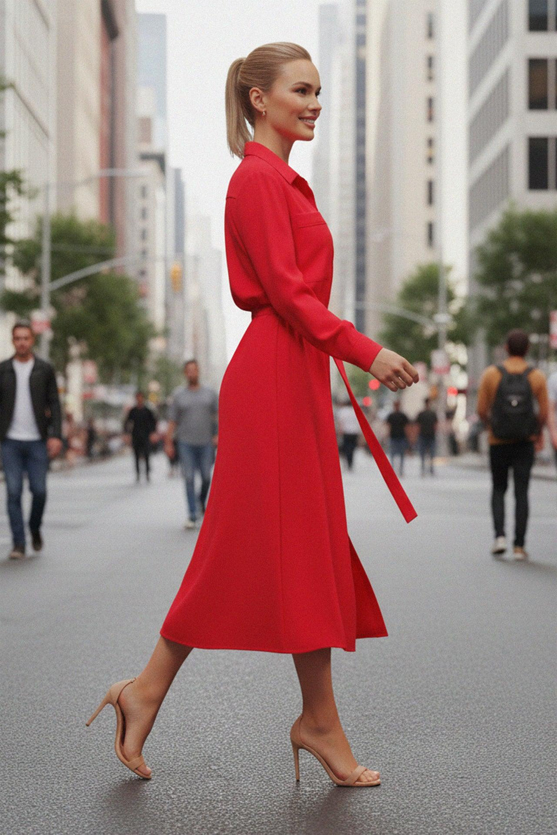 Explore collections which features collared neckline, in vertical stripes print, belted waist and long sleeve style, of midi shirt dress designed by Shahida Parides.