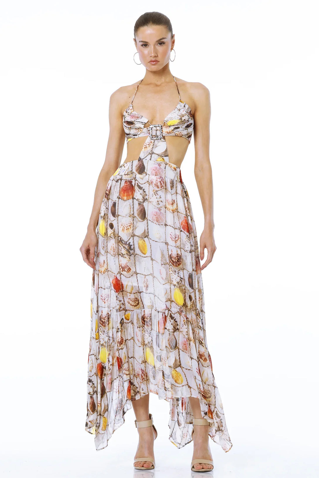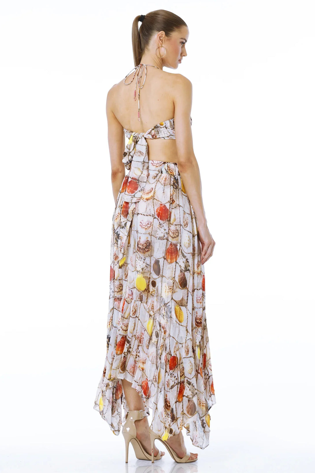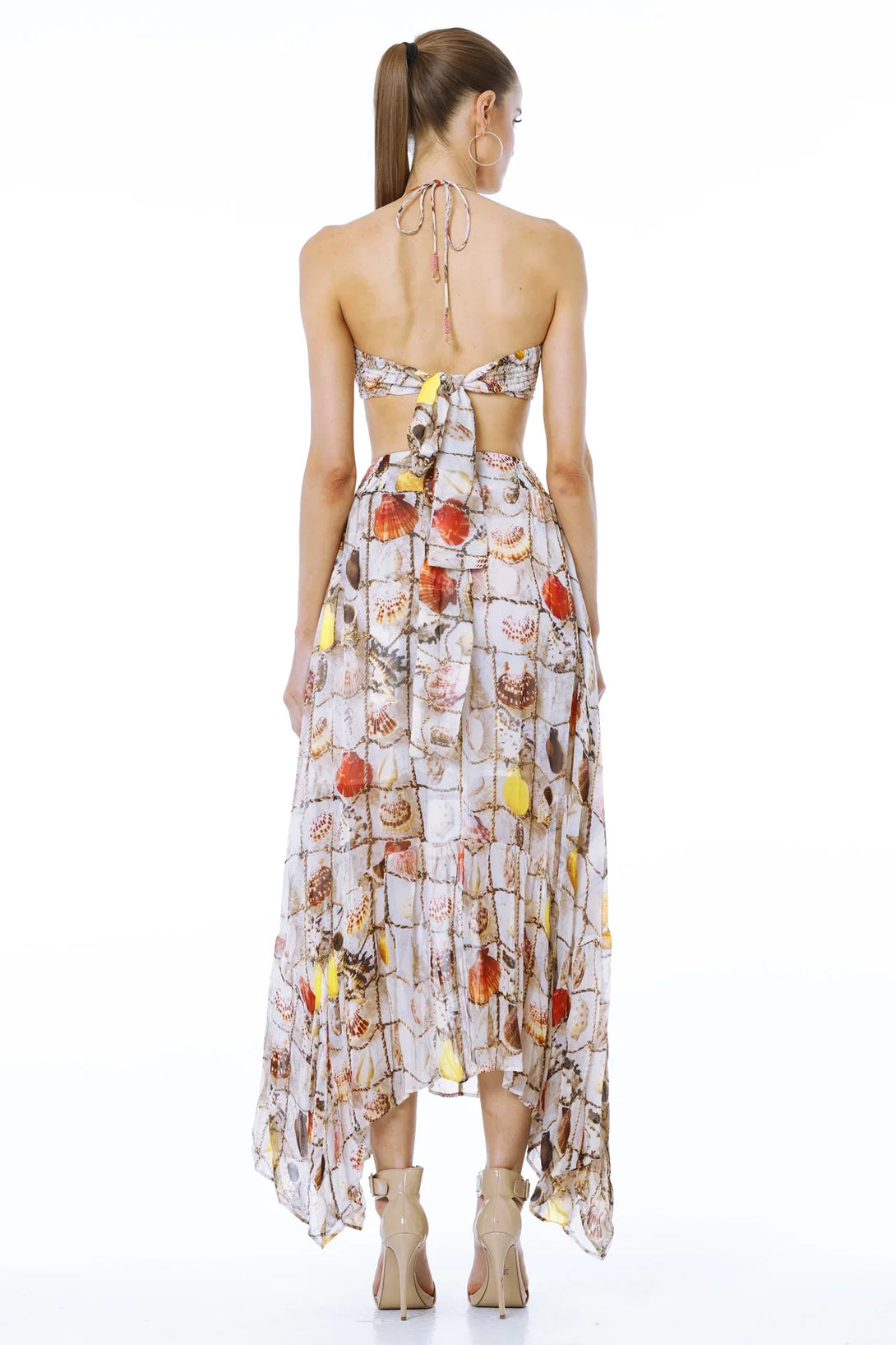 This asymmetrical dress is a perfect cocktail outfits, for any night parties, and romantic dates, which features, halter neckline with backless style, ruffle cut out from waist style, and tie-up back, at Shahida Parides.