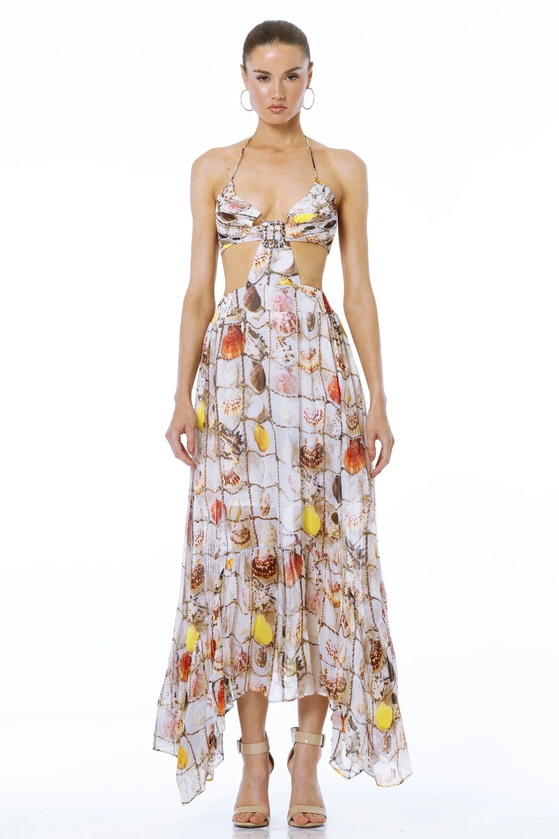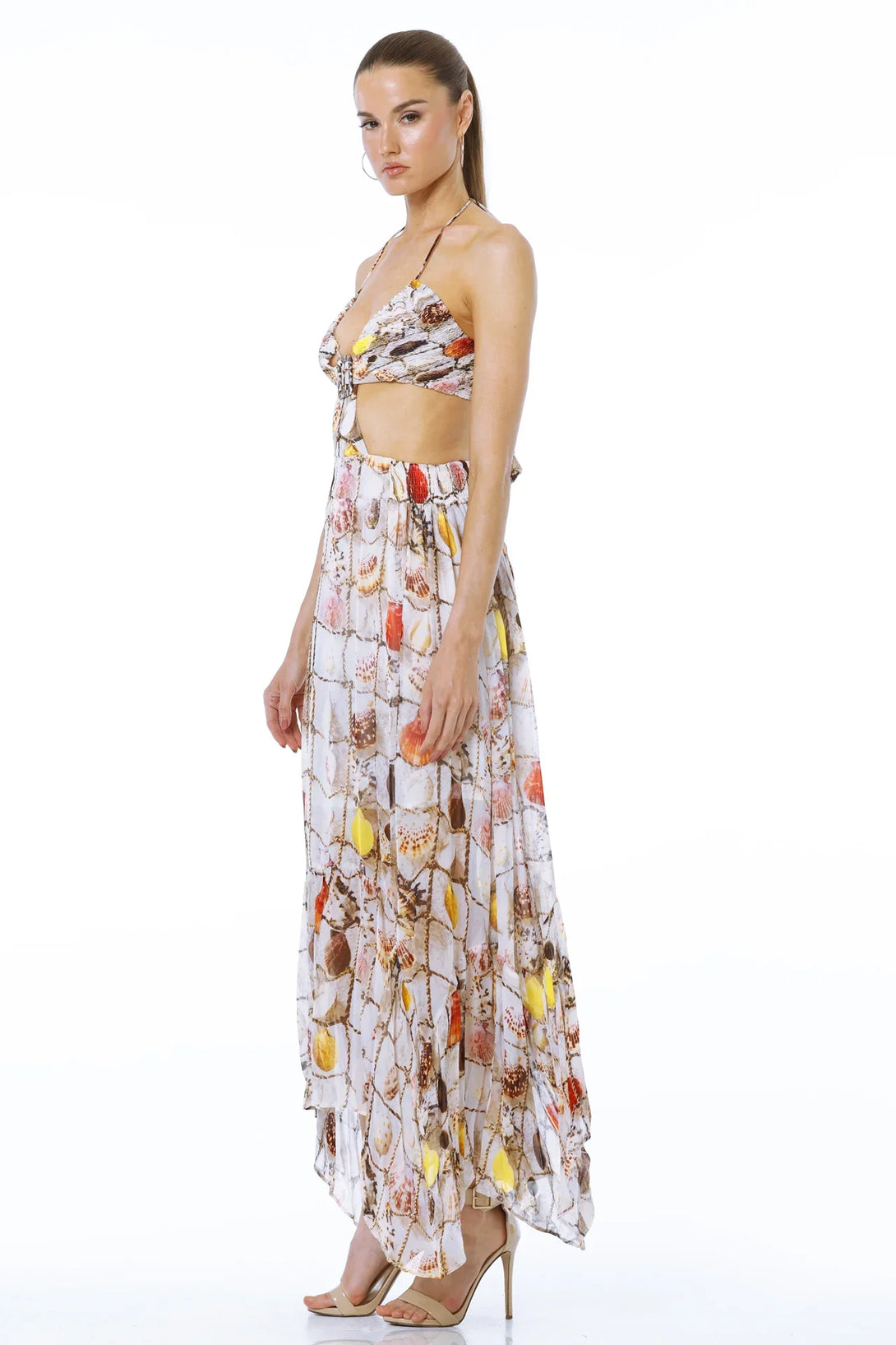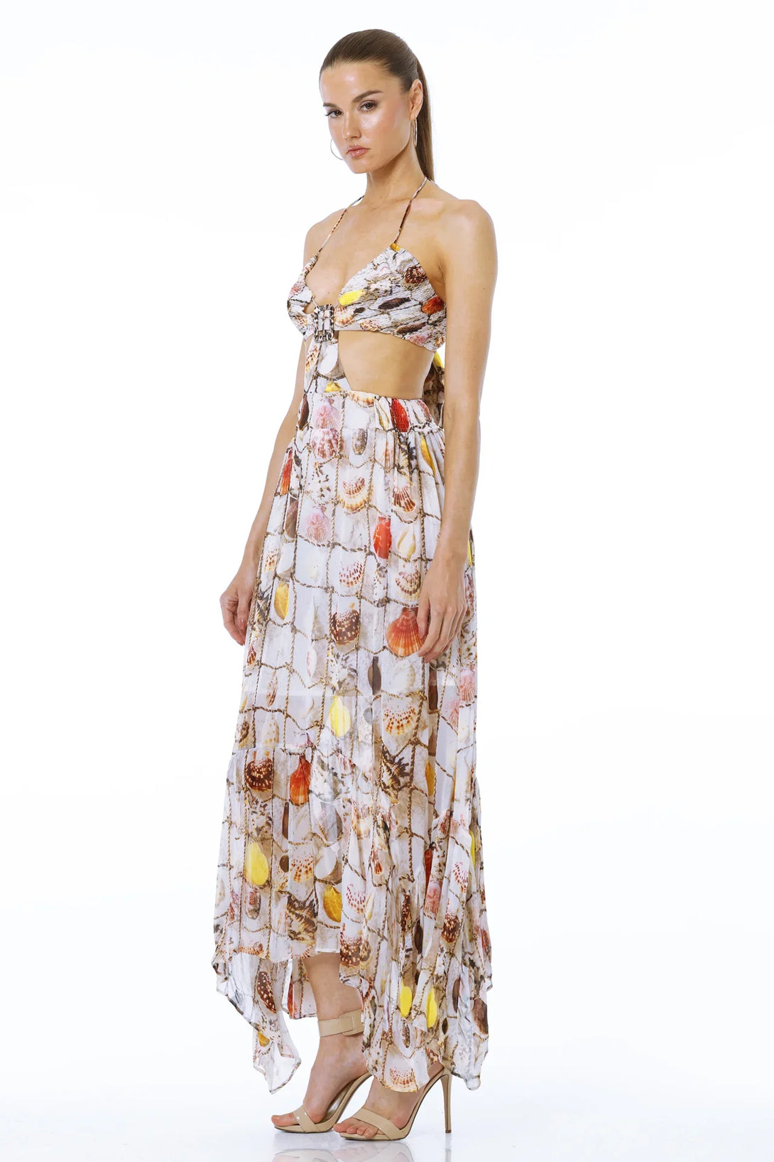 This asymmetrical dress is a perfect cocktail outfits, for any night parties, and romantic dates, which features, halter neckline with backless style, ruffle cut out from waist style, and tie-up back, at Shahida Parides.