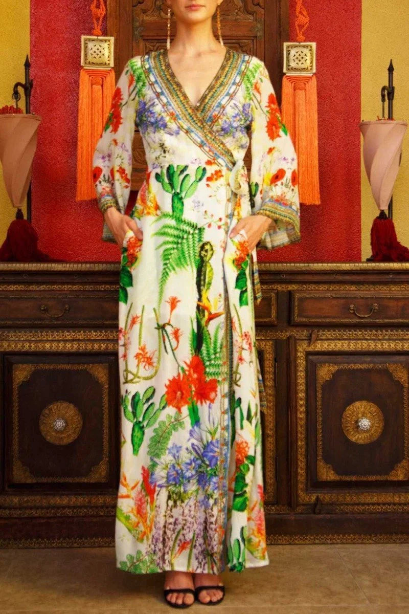 This isn't just a dress; it's an enigma draped in elegance. The long wrap maxi dress with long sleeves whispers of timeless romance and effortless mystery, inviting you to embrace your inner femme fatale, one flowing silhouette at a time.